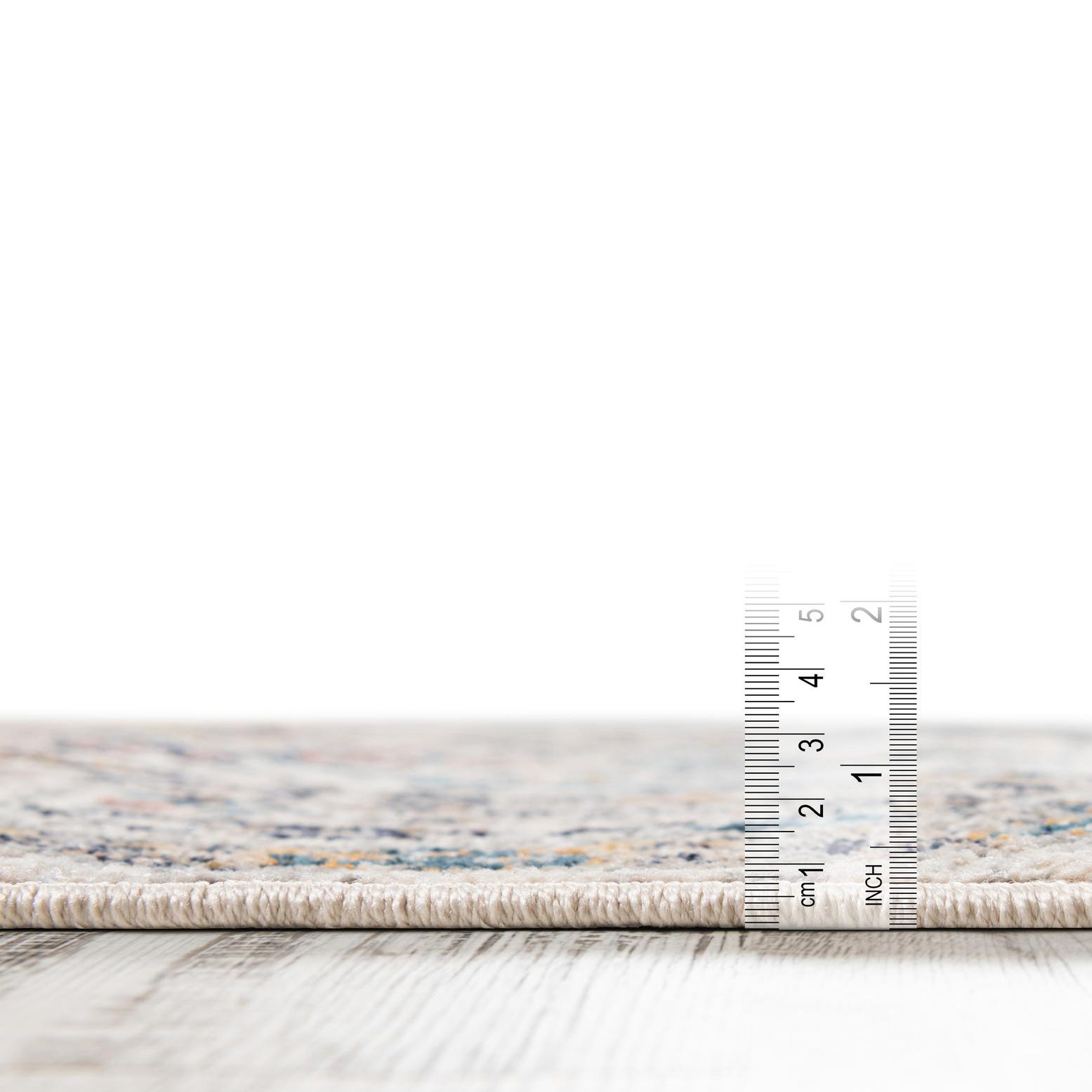 A soft ivory ground sets a calm backdrop for a gently distressed medallion pattern, where scrolling arabesques and a narrow floral border create a lived-in, layered look. Teal and navy blue outlines anchor the central motif while warm rust red and terracotta accents add a touch of energy; flecks of gold, light brown and gray provide subtle depth across the surface. Machine-made polypropylene gives the rug a low, dense pile that feels smooth and slightly cushioned underfoot, with a consistent texture that lies flat in high-traffic areas.