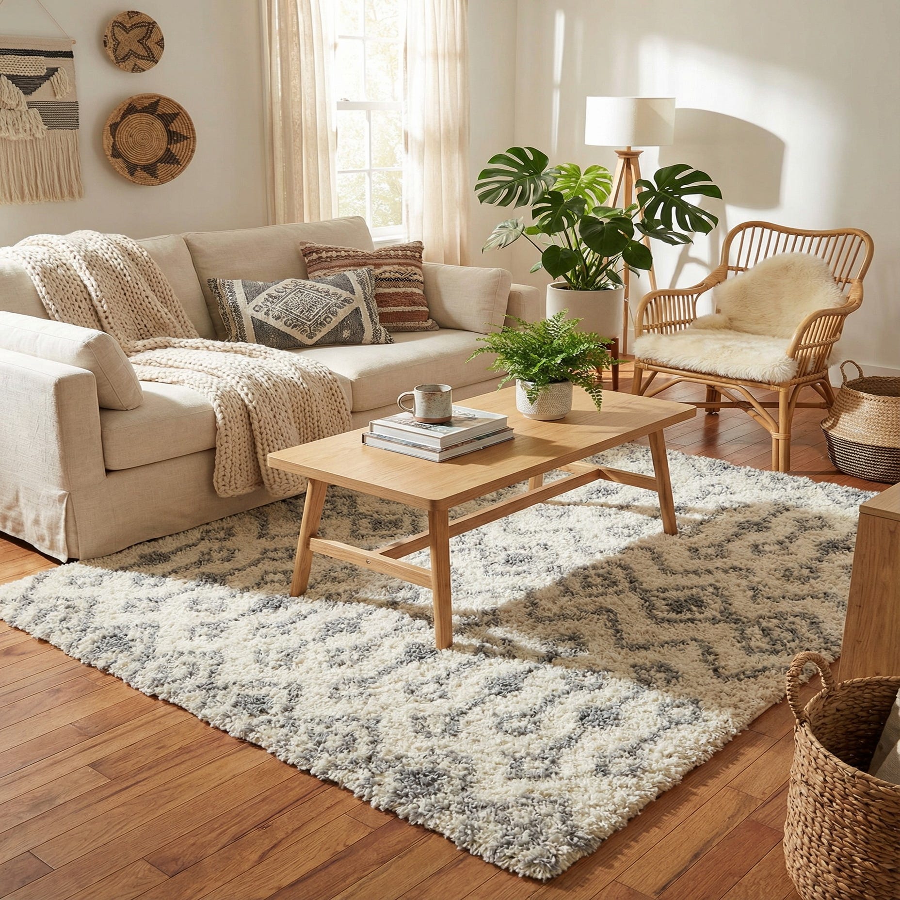 This Moroccan Trellis Shag rug would be a tasteful complement to interiors seeking a soft yet defined floor accent, and it can be effectively paired with both neutral and bolder color schemes due to its understated elegance.