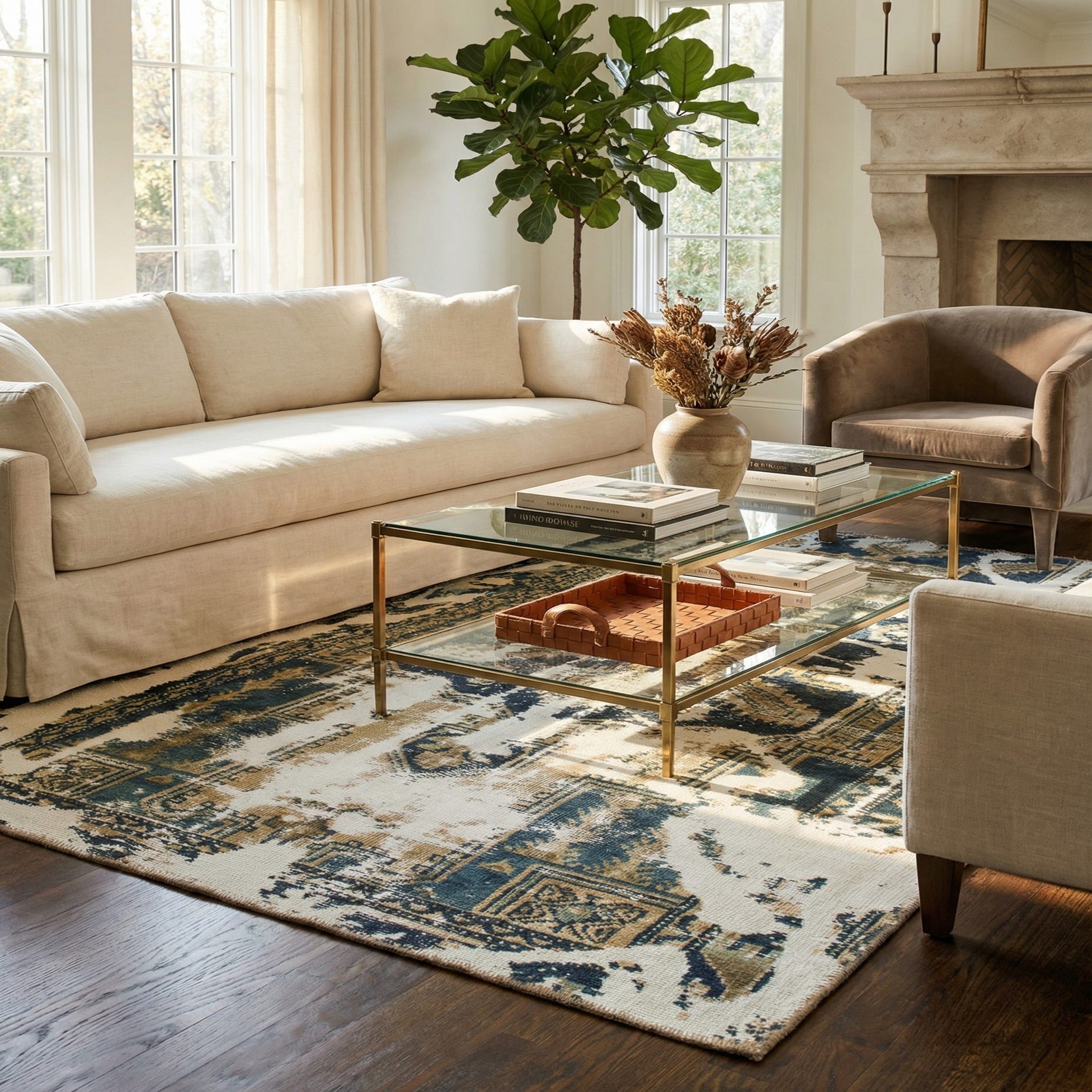 Hand-knotted from 100% wool, the piece has a substantial yet soft hand underfoot; the dense knotting produces a tactile surface where the pile catches light and the distressed areas register as slight variations in texture. Use it to anchor a seating area beneath a low coffee table, add warmth underfoot at the foot of a bed, or introduce pattern in an entry or study. It pairs easily with transitional and modern farmhouse interiors, complements navy or warm wood accents, and can soften more industrial or minimalist schemes.