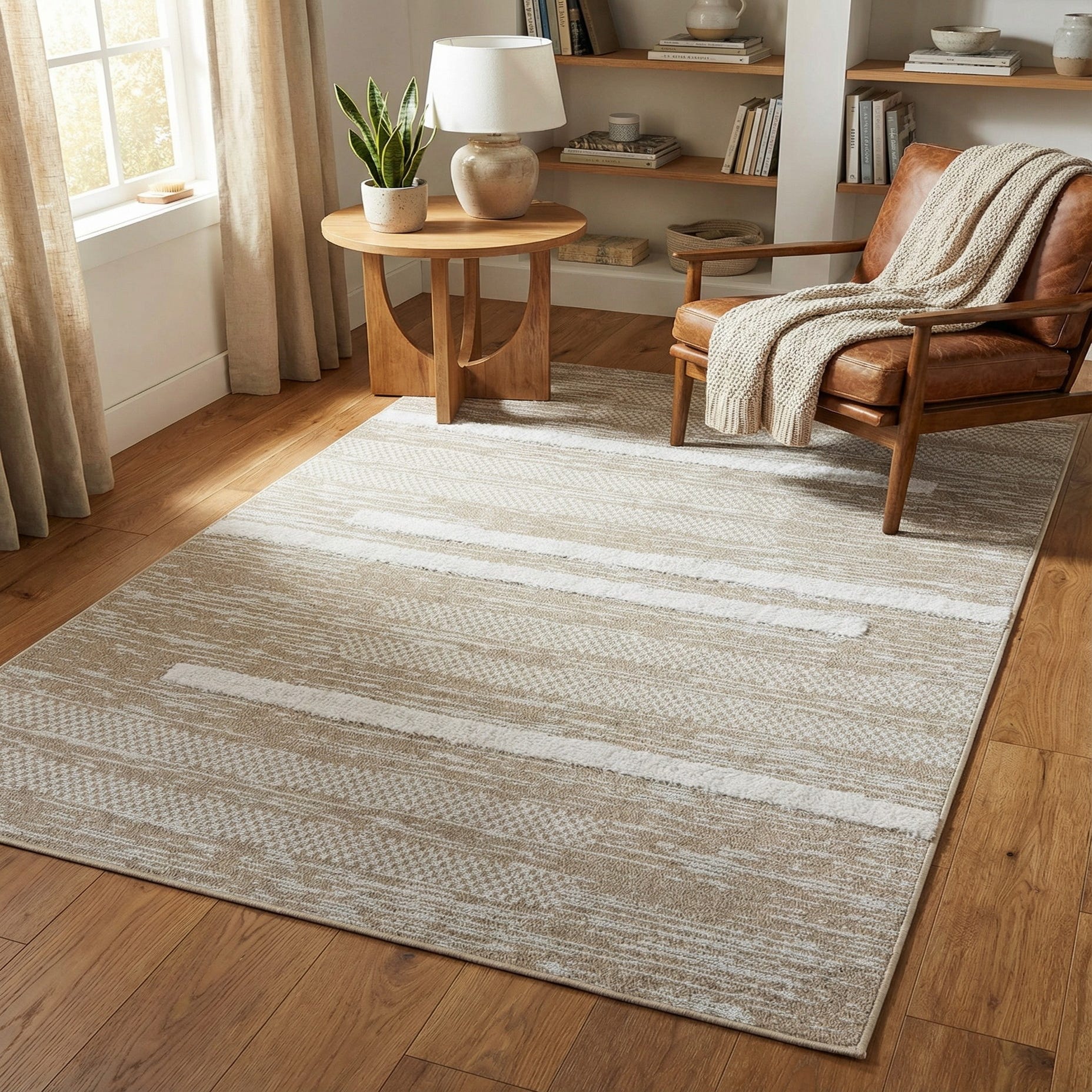 A 4x6 rectangular Abbey Collection rug from Rugs.com, featuring a modern stripe pattern in ivory and cream with textured high/low pile.