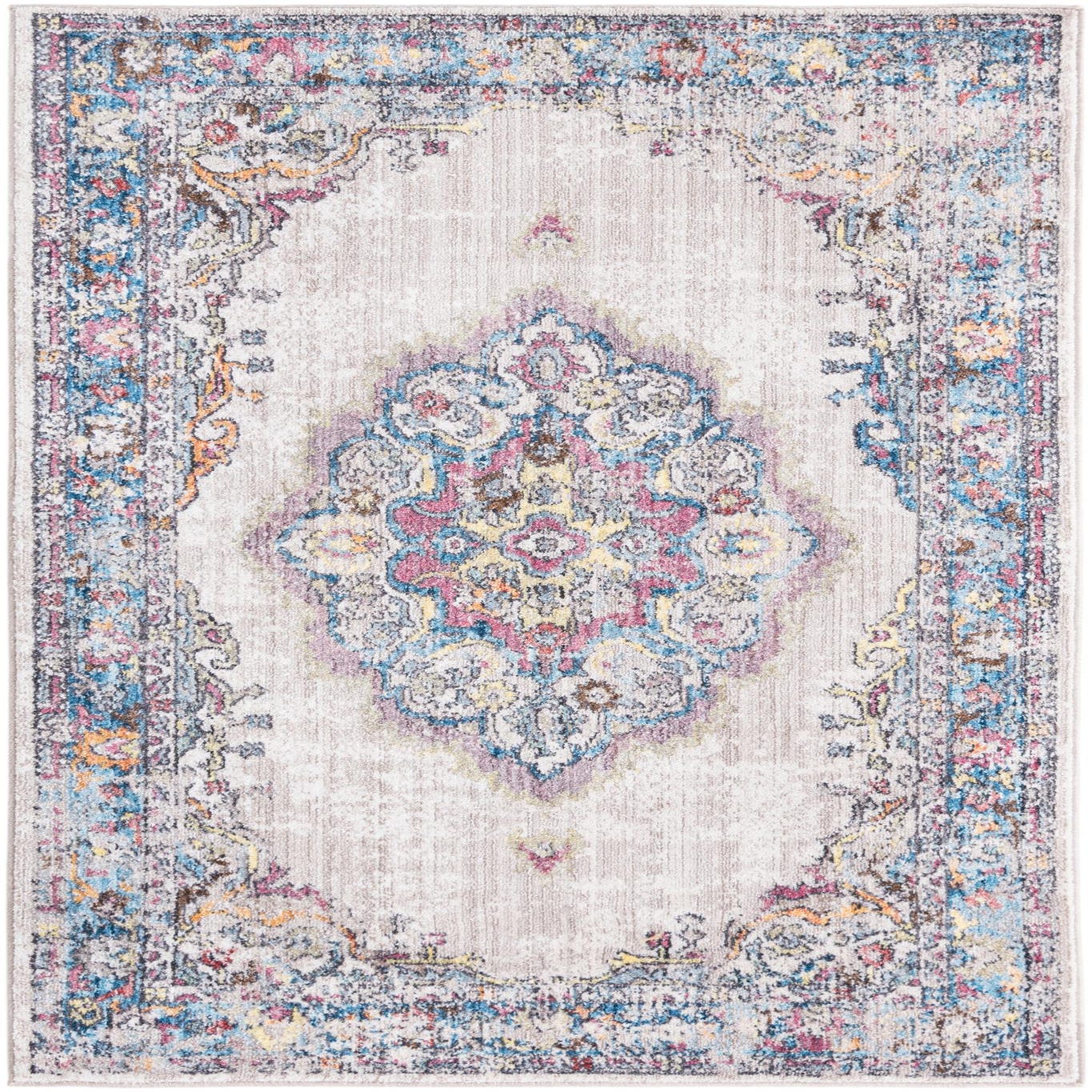 Primary color is Ivory. Colors in this rug include: Ivory, Blue, Light Blue, Purple, Yellow, Gray, Brown, Pink.