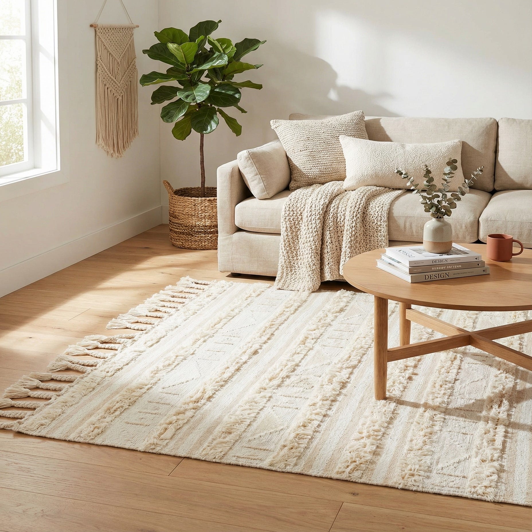 Hand-woven from 100% wool, the piece combines low-profile weave sections with plush tufted ribs you can feel beneath your feet, offering both texture and comfortable underfoot warmth. It works well as an anchor in a neutral living room, layered in a cozy bedroom, or placed in an entry or reading nook to soften hardwood or tile. Pair it with natural woods, rattan, linen upholstery, and muted metals for a relaxed boho, coastal, modern farmhouse, or Scandinavian look.