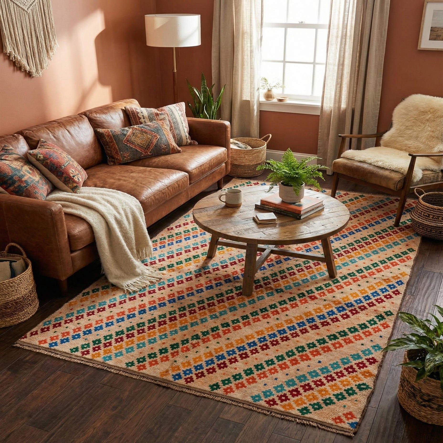 Warm and versatile, this rug works well layered under a low coffee table in a living room, in an entryway to add color to a neutral foyer, or alongside a bedside to introduce pattern and warmth. It pairs naturally with mid-century wood tones and leather, complements eclectic and bohemian textiles, and can enliven a pared-back Scandinavian or rustic farmhouse setting with its mix of rich and bright hues.