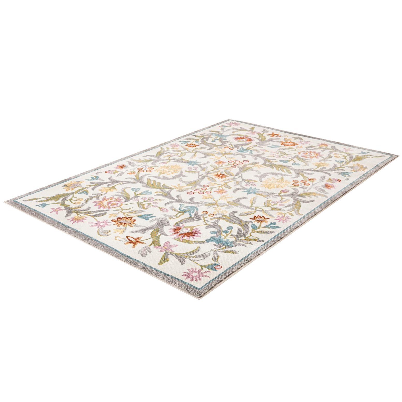 A 4x6 rectangular ivory area rug featuring a dense, colorful floral and botanical pattern with gray vines and teal, yellow, and red flowers.