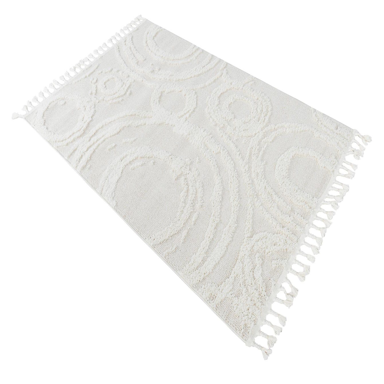 A soft ivory field forms a neutral backdrop for a swirling, raised motif that quietly dances across the surface. The pattern is made up of concentric circles and organic arcs in a tonal ivory/cream, created by a higher, tufted pile against a flatter woven ground. Running your hand over the rug reveals a pleasing contrast between the low-profile flat weave and the plush, sculpted loops; short hand-tied tassels finish the ends for a relaxed, handcrafted look. Machine-made from 100% polyester, the construction offers consistent texture and a soft underfoot.