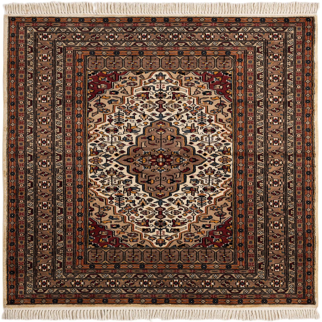 A 4x6 rectangular Bokhara rug with a central medallion in ivory, cream, and brown, featuring intricate traditional and tribal patterns.