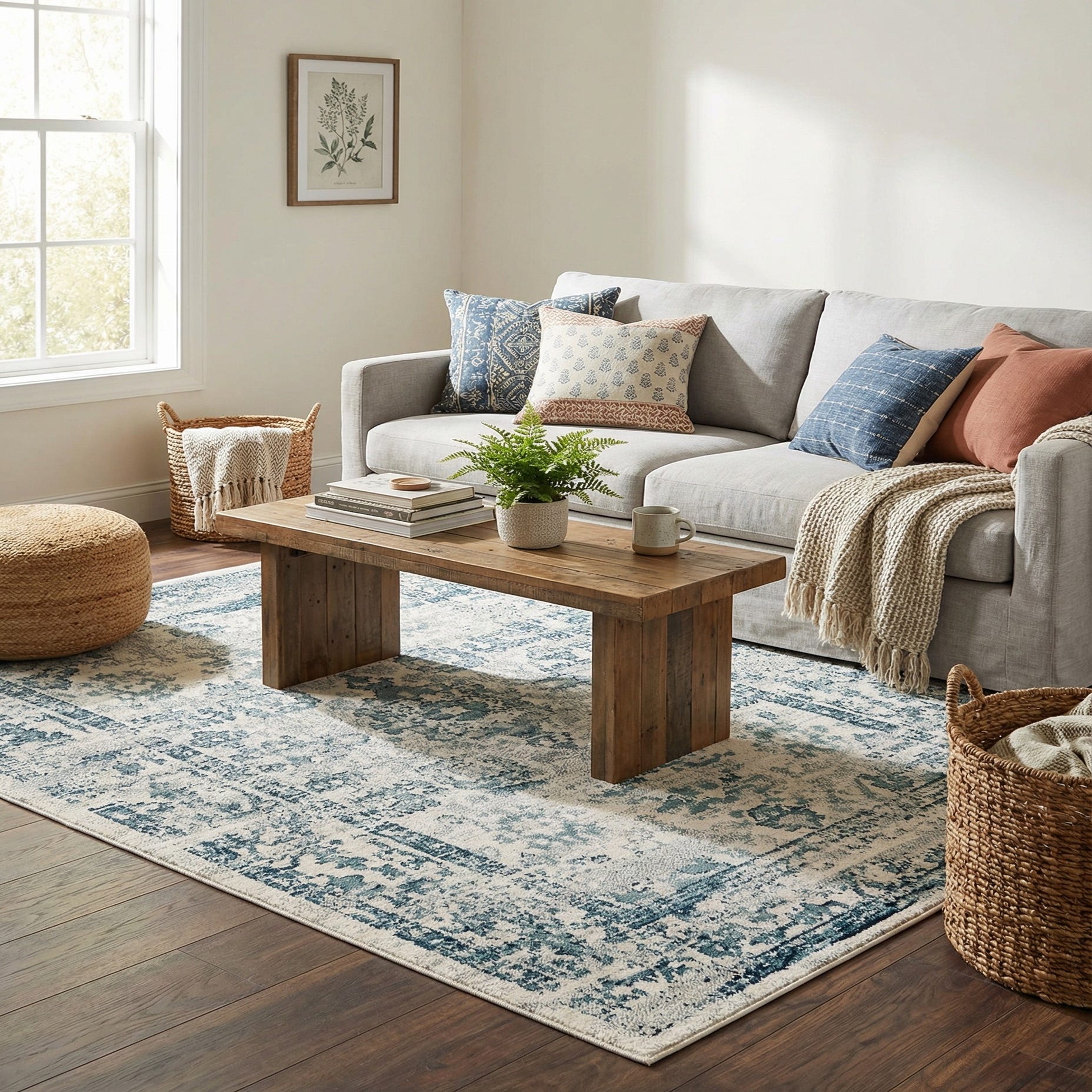 Machine made from 100% polypropylene, the rug has a low, tightly woven pile that feels smooth underfoot with slight texture where the pattern is denser. That construction makes it easy to layer over hard floors and keeps the surface flat beneath furniture. It pairs well with coastal, modern farmhouse, or transitional interiors; try it under a coffee table in a living room, in an entry to soften a hallway, or beside the bed to add a calm, airy anchor to the space.