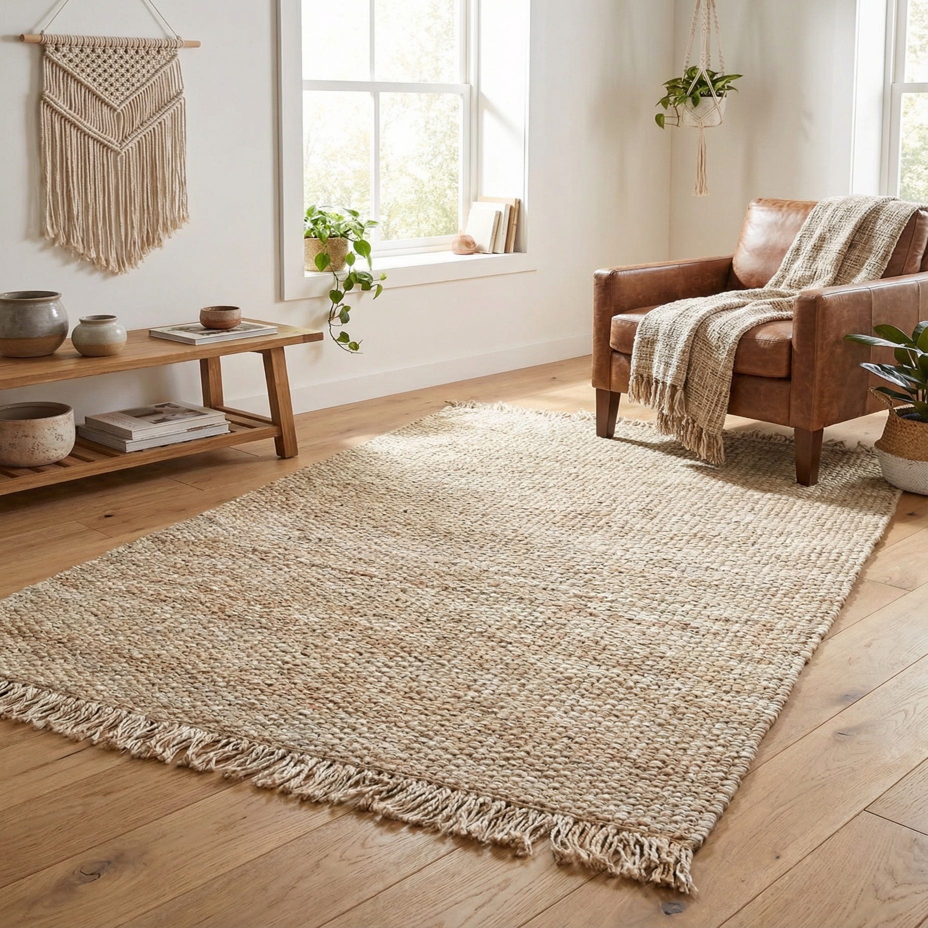 The neutral ivory palette pairs easily with warm woods, rattan, and linen upholstery, making it a natural fit for coastal, Scandinavian, boho, or modern farmhouse interiors. Place it under a coffee table to anchor a cozy living area, layer it in a bedroom for added texture, or use it in an entryway to introduce a welcoming, grounded feel. The substantial hand-woven build provides a firm, textured underfoot presence that complements both relaxed and refined spaces.