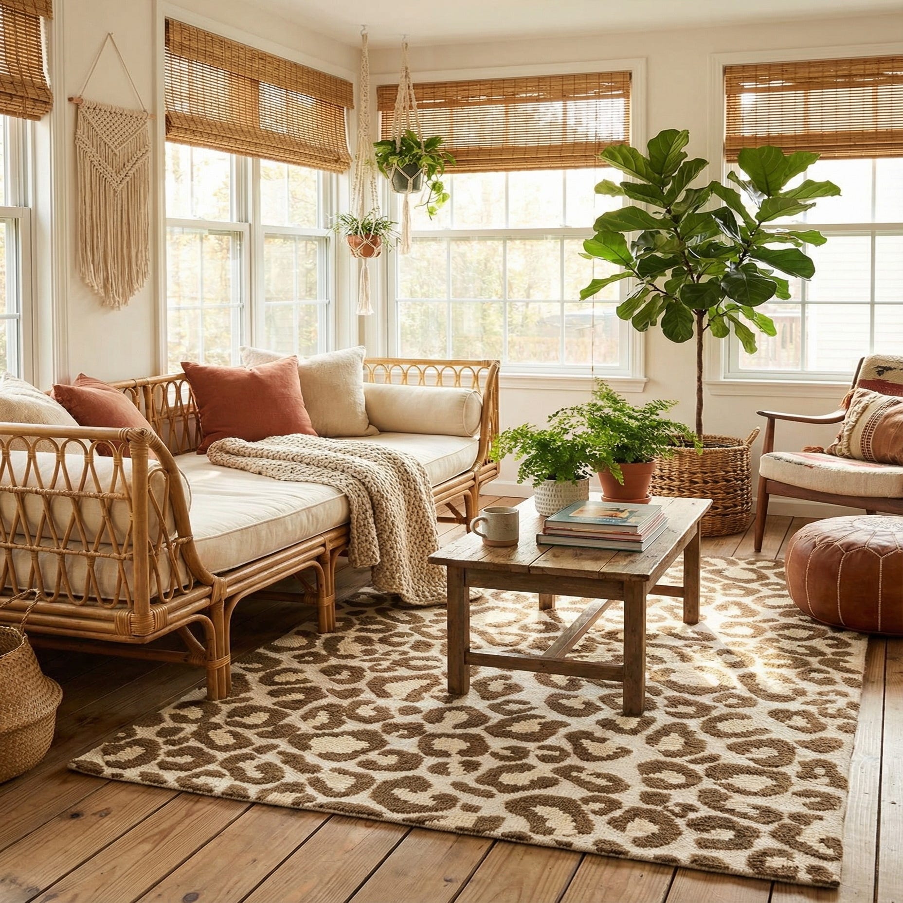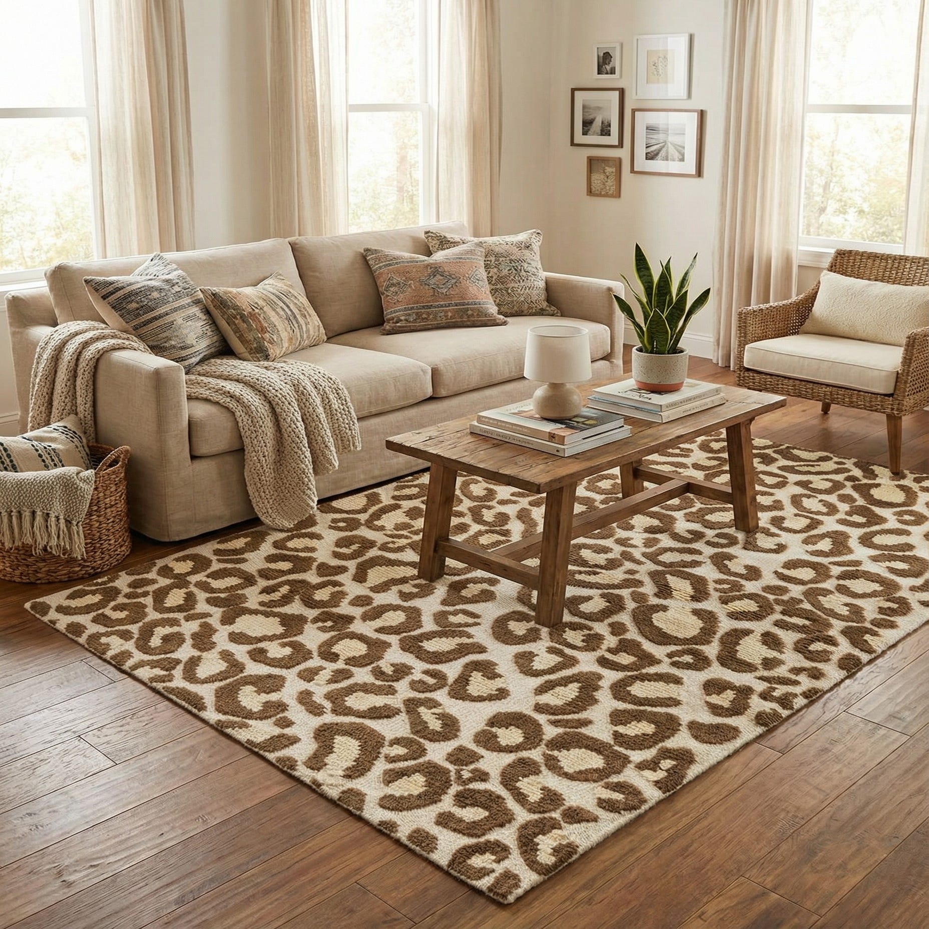A 4x6 rectangular ivory and brown leopard print rug with a medium pile, perfect for a modern living room.