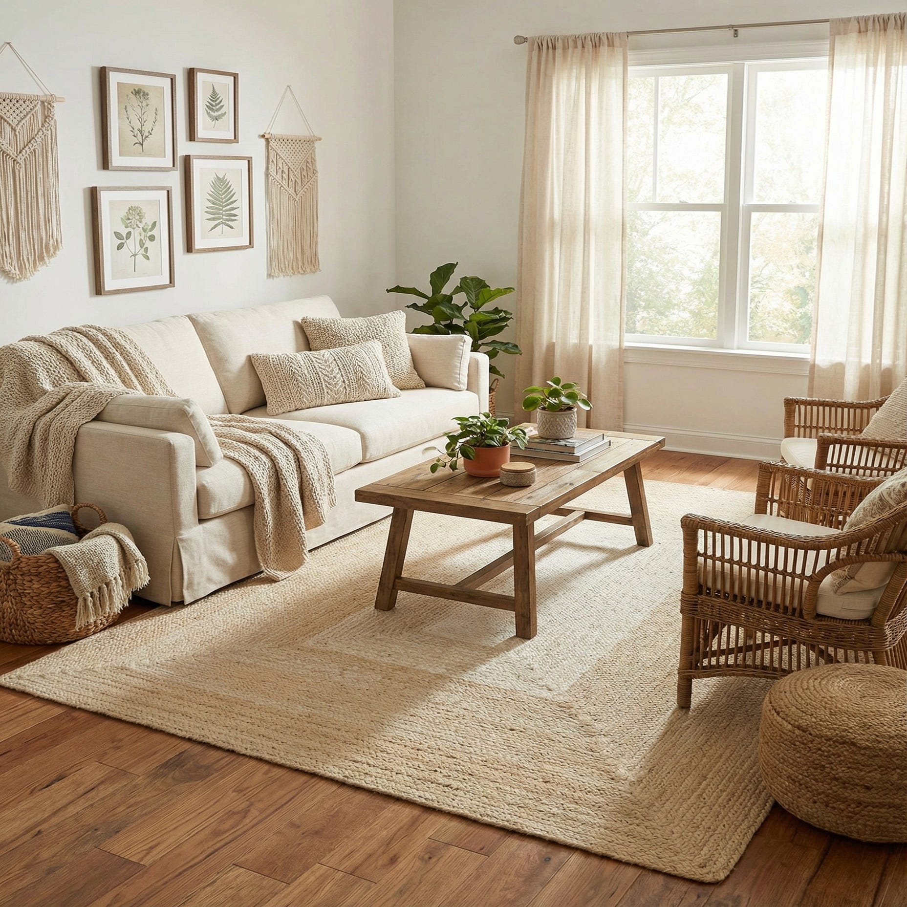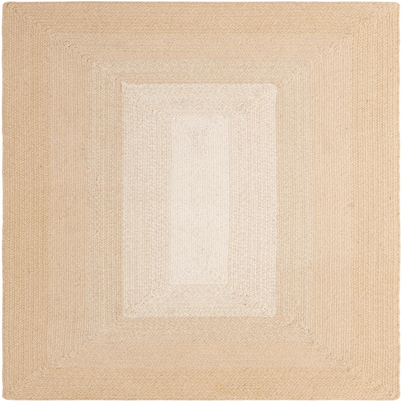 A 4x6 rectangular ivory wool rug with a hand-braided texture and a subtle rectangular border design, suitable for a living room.