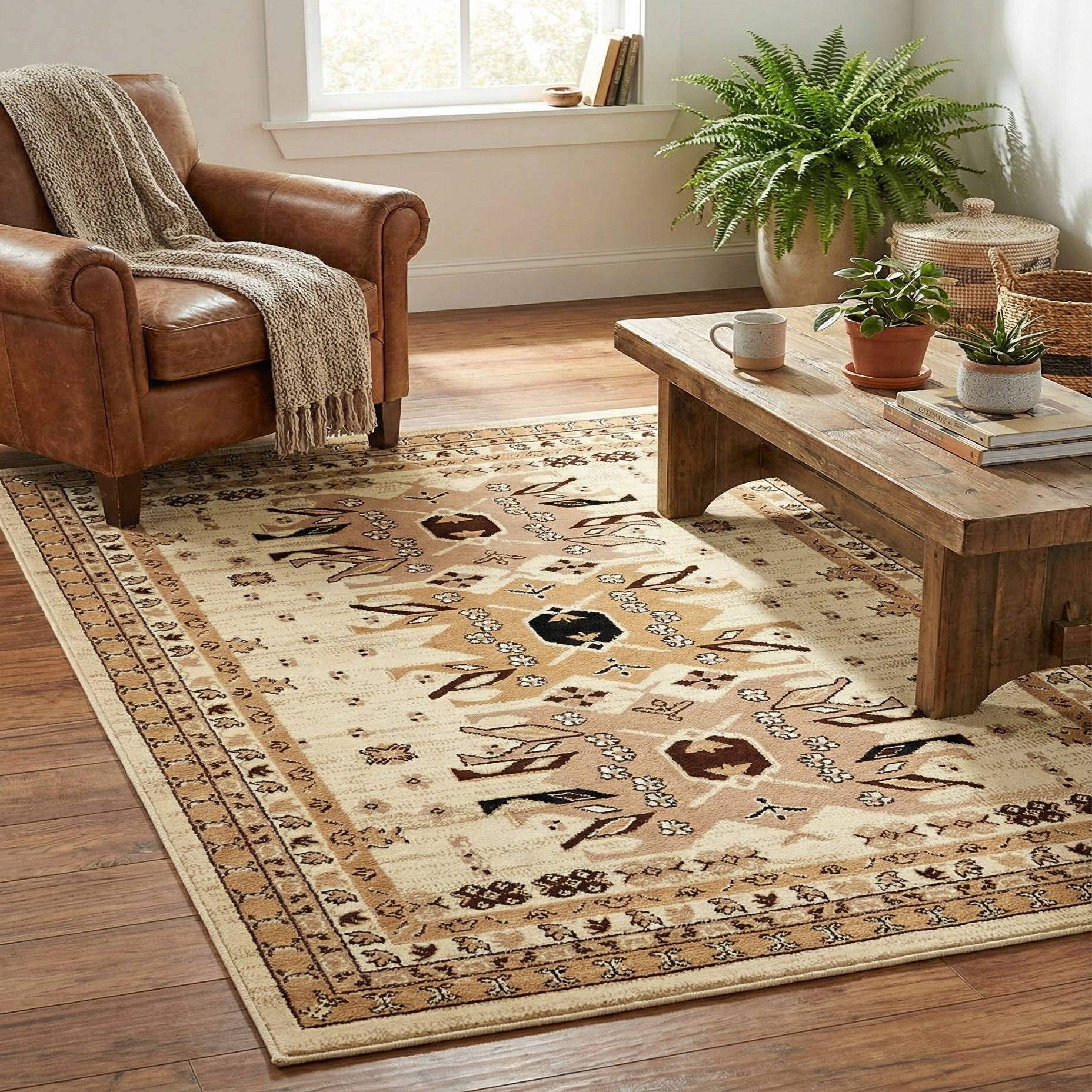 The warm, neutral palette suits a range of interiors from transitional and traditional to modern farmhouse. Pair it with warm wood tones and leather seating to echo the brown and beige shades, or let cream sofas and black metal accents pick up the lighter and darker details for a cohesive look. It works well under a coffee table in a smaller living area, at the foot of a bed, in a compact dining nook, or in a home office where you want to add pattern and visual warmth without overwhelming the space.