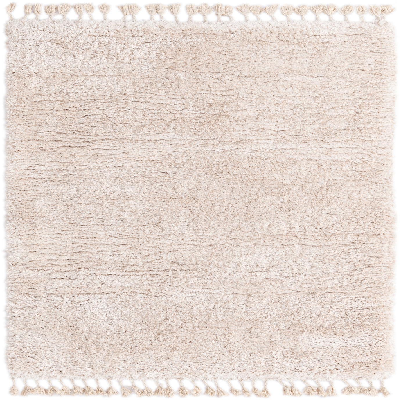 The rug's shaggy texture adds depth and tactile appeal to any space, providing an inviting surface underfoot. Its simplicity allows it to seamlessly integrate into various decor styles, including modern, minimalist, Scandinavian, and casual contemporary settings. Edge detailing with fringe adds a subtle bohemian touch, which could blend nicely in eclectic environments.
