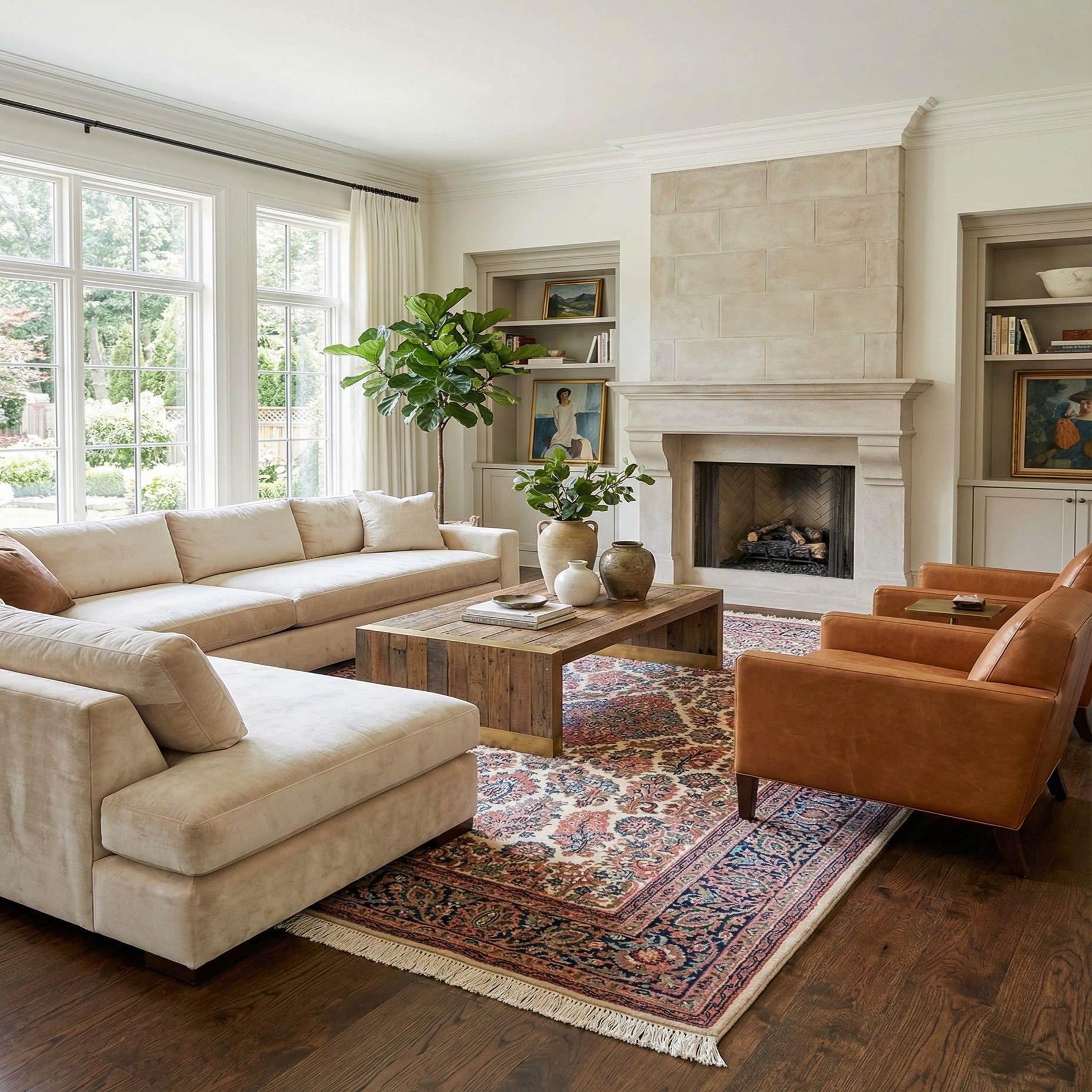 A 4x6 rectangular ivory wool rug with a traditional floral pattern and a dark blue border, suitable for an indoor living room.