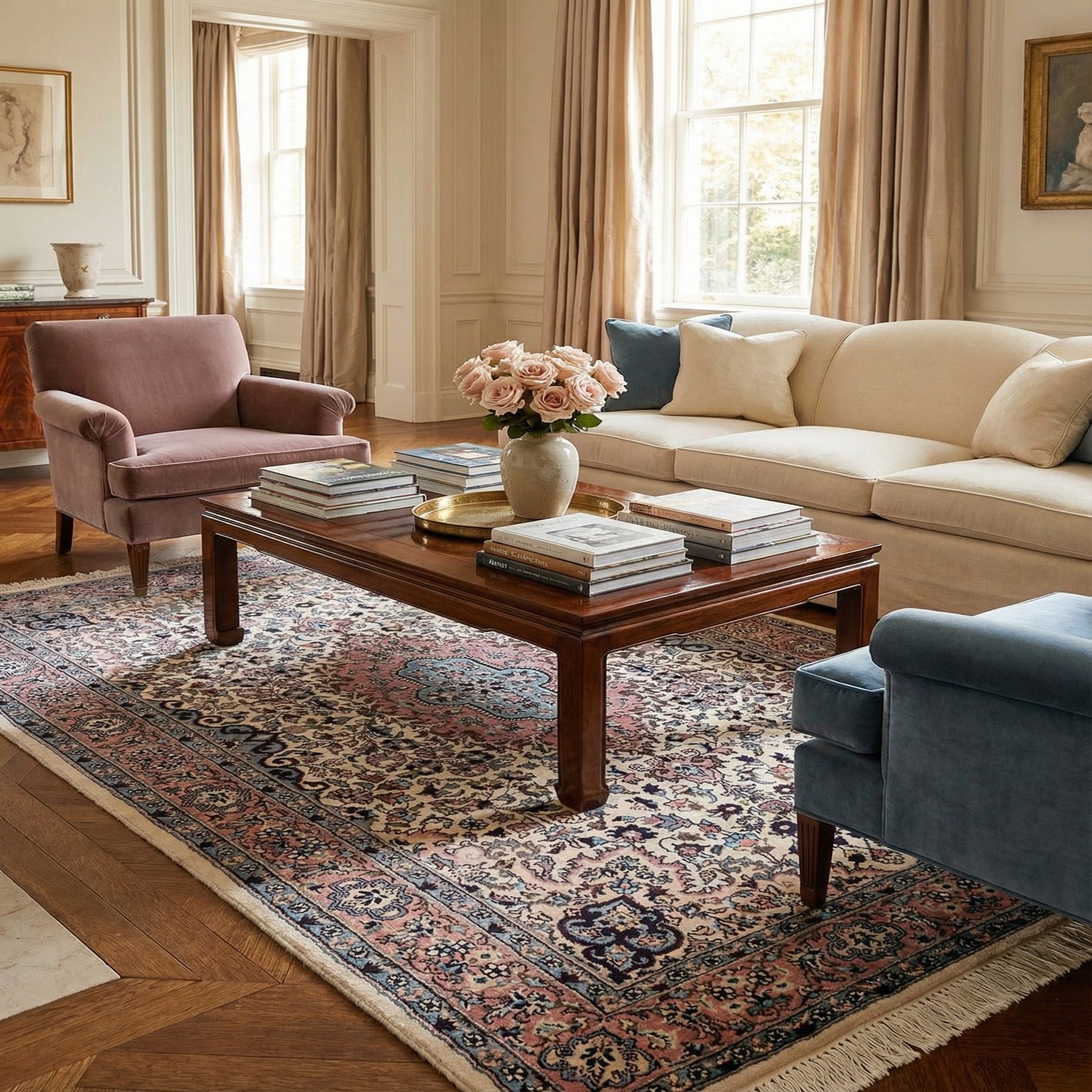 A 4x6 rectangular ivory and pink traditional Oriental rug with a central medallion and intricate floral patterns.