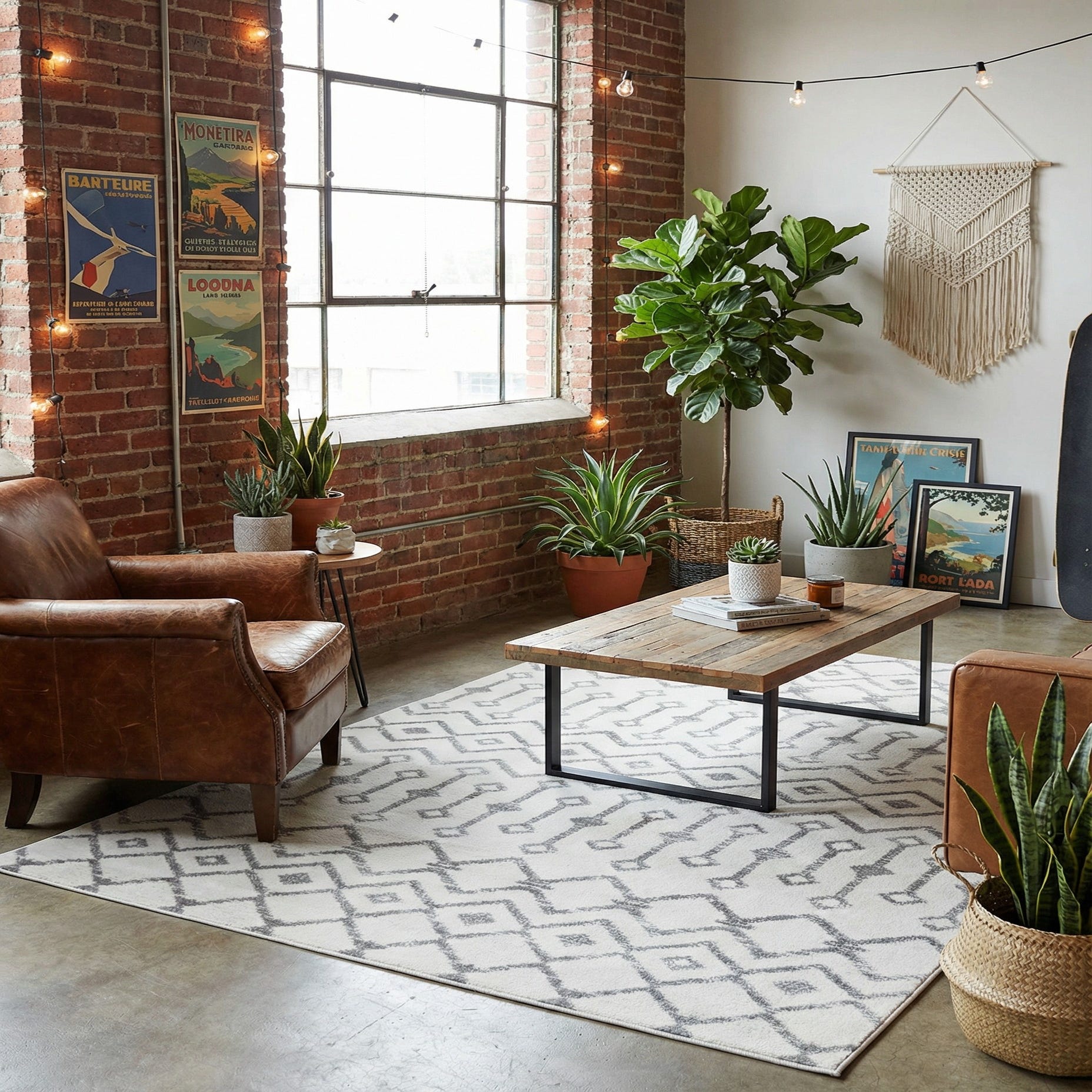 The neutral palette and graphic design work well in modern, Scandinavian, transitional or casual boho interiors. Pair it with light wood and linen upholstery for a calm, airy room, or layer it beneath a sofa or in an entryway to introduce pattern without overwhelming the space. The rug complements cool-toned metals and charcoal accents as easily as natural fibers and woven textures.