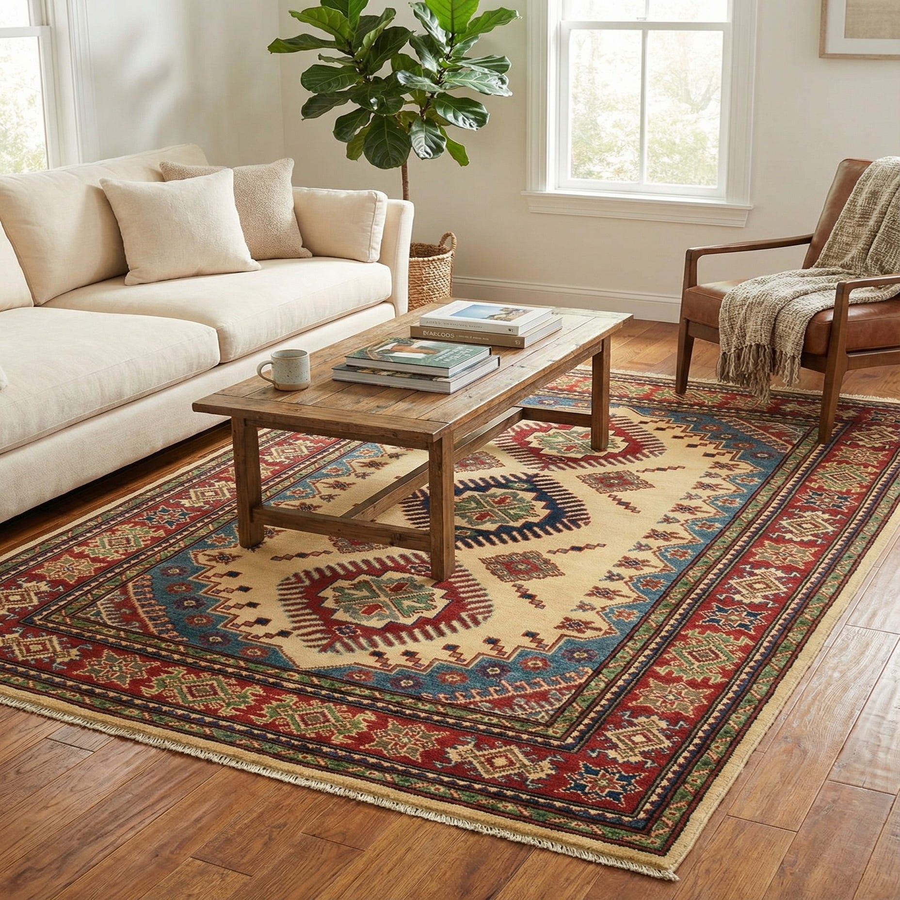 A 4x6 rectangular ivory wool rug with a traditional tribal medallion pattern in red, blue, and green.