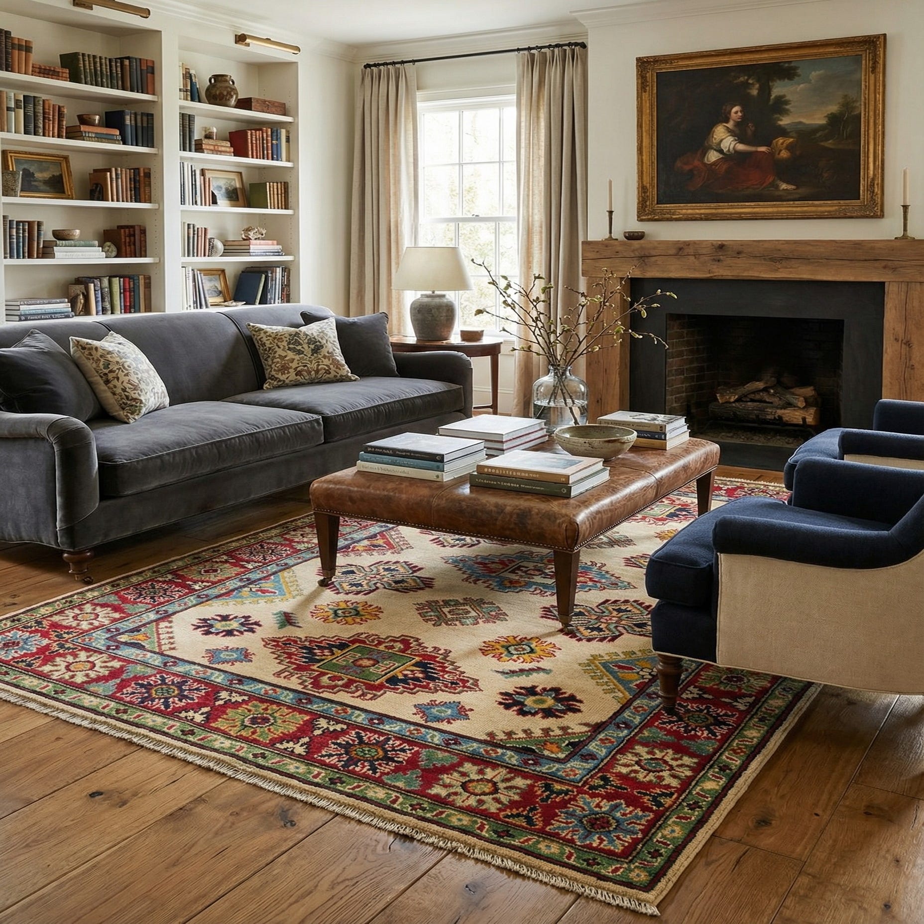 Hand-knotted from 100% hand-spun wool, the surface has a substantial, tactile feel — a low-to-medium pile with a slightly nubby hand that shows the character of skilled craftsmanship. This rug works well as an anchor for a living area under a coffee table, layered in a cozy study, or placed in an entry where its pattern can set the tone. Pair it with warm wood furniture and leather for a classic look, or use neutral upholstery and scattered blue or red accents to create a fresh, transitional setting; it also complements eclectic and bohemian interiors that mix textures and patterns.