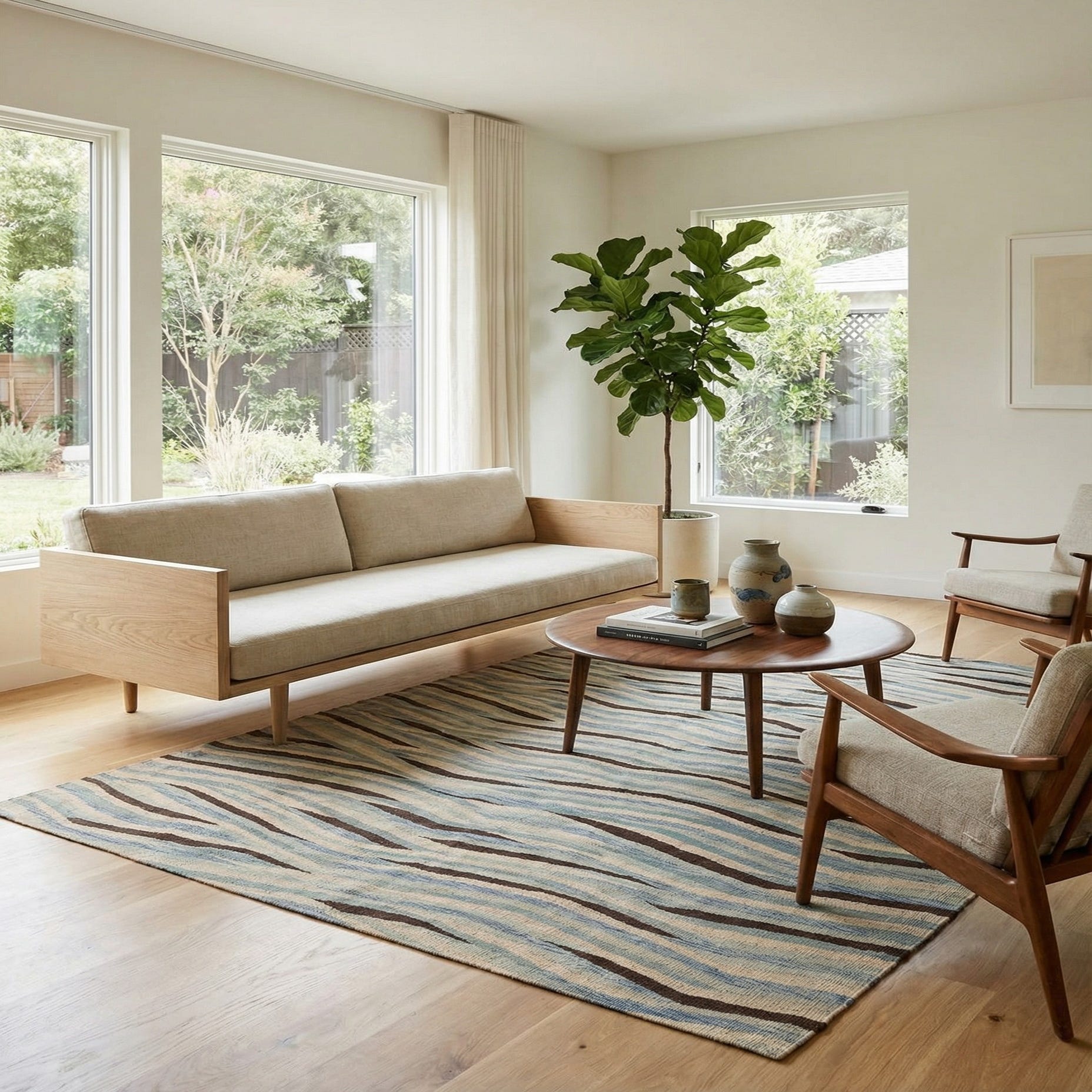 The Kilim Modern collection presents a hand-woven 4x6 rug crafted from 100% wool, offering a tactile experience underfoot combined with enduring quality. This piece displays a harmonious blend of ivory, brown, and light blue hues laid out in an undulating abstract pattern that recalls the natural ebbs and flows of topographical landscapes. The ivory background serves as a serene canvas, revealing the visual interest of the organic stripe motif.