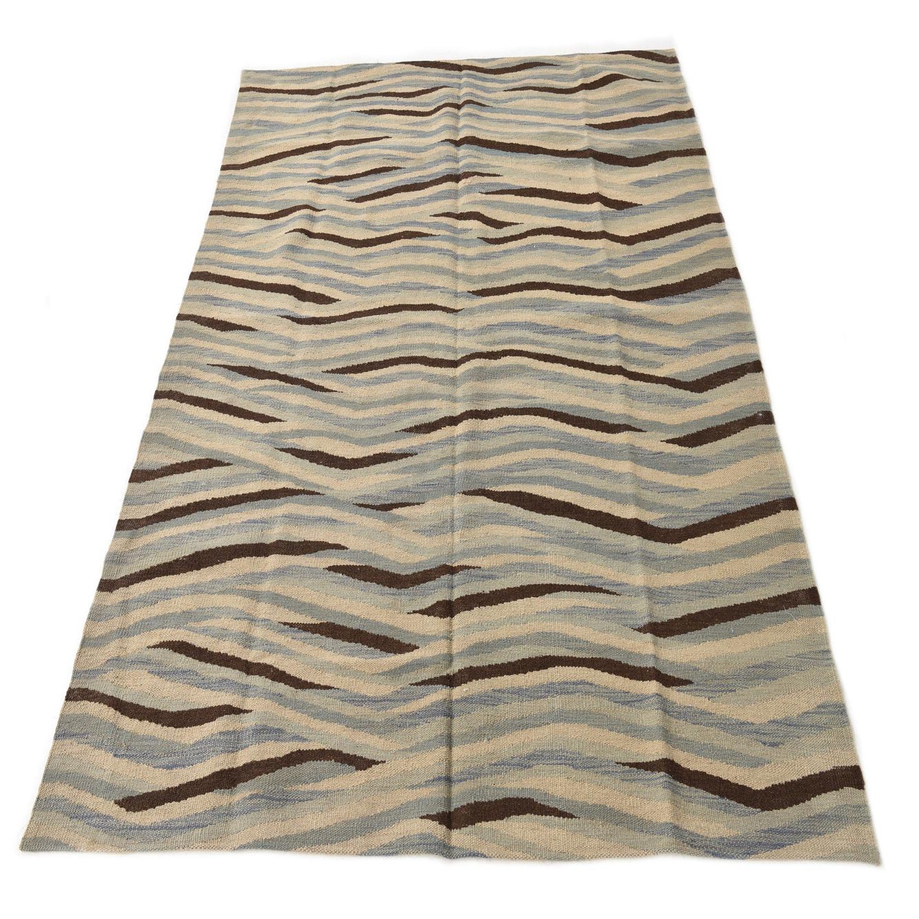 A 4x6 rectangular Kilim Modern rug with an abstract tribal pattern in ivory, light blue, and dark brown wavy stripes.