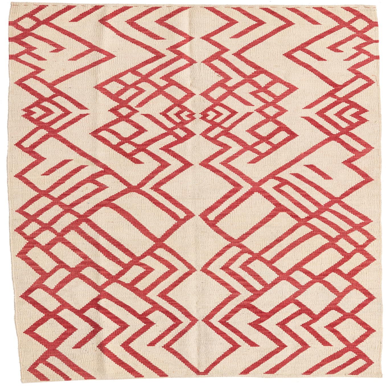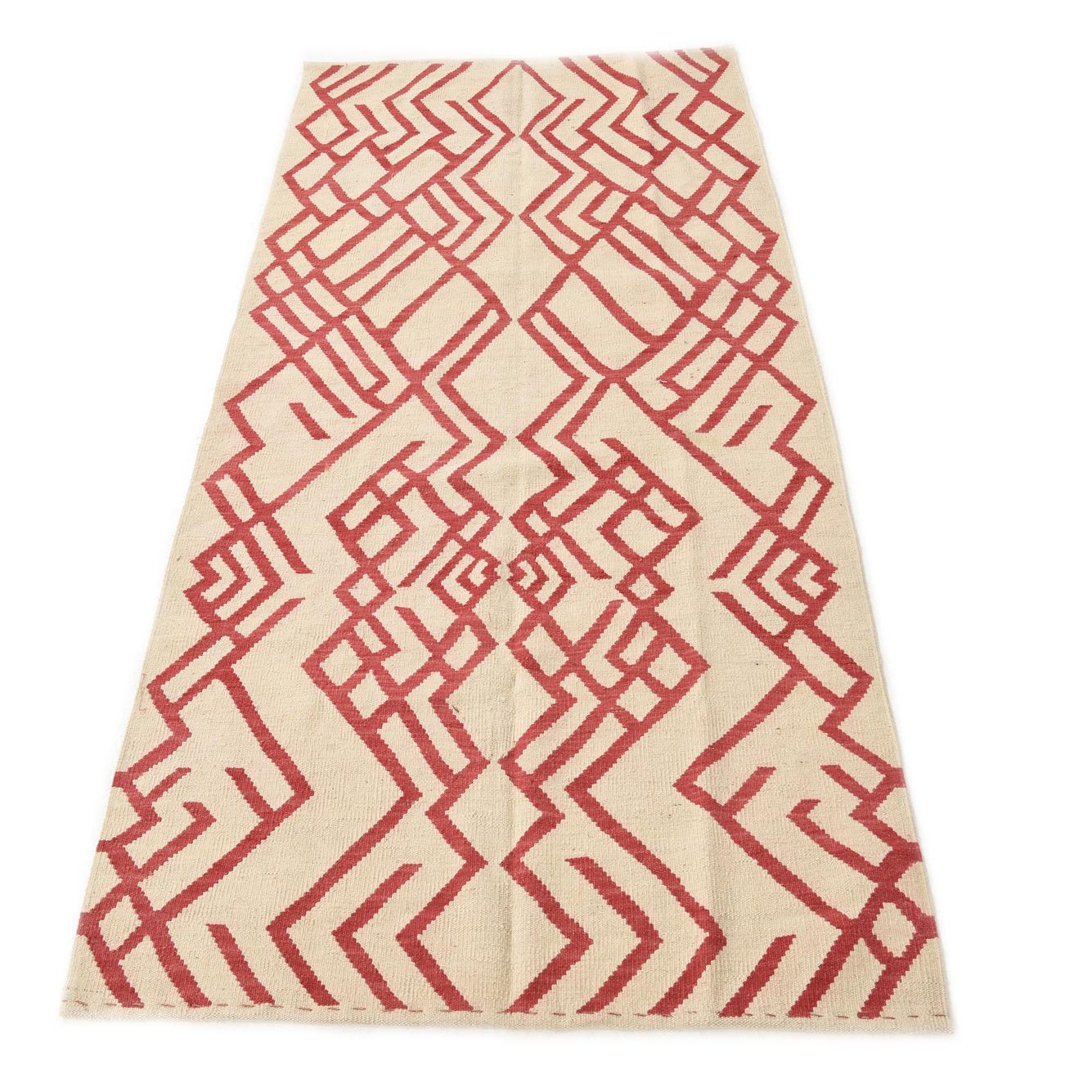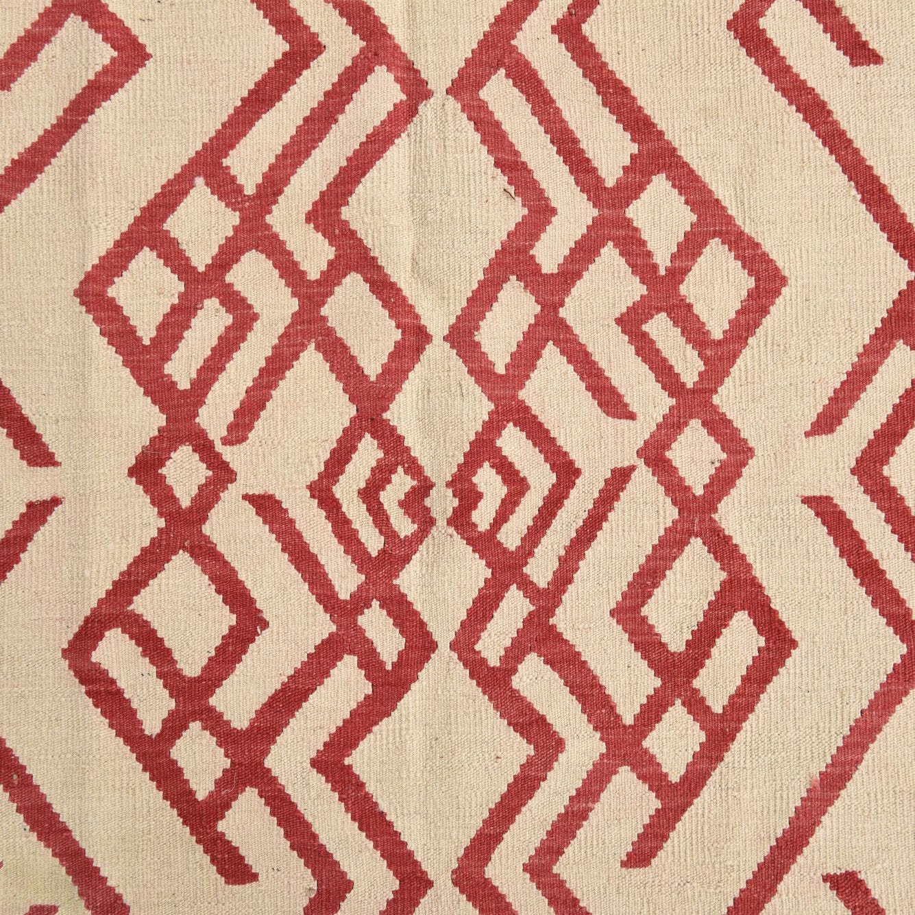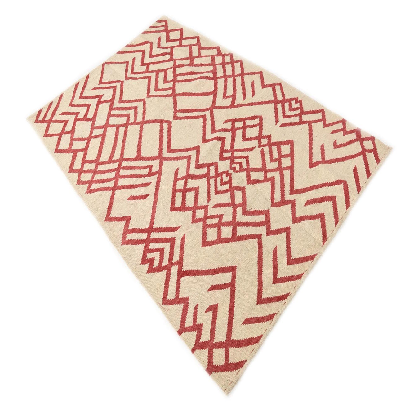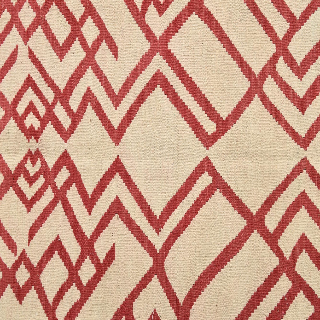 A 4x6 rectangular ivory flatweave rug with a bold red tribal geometric pattern, suitable for a living room.
