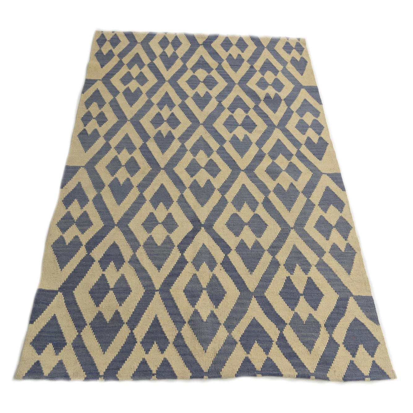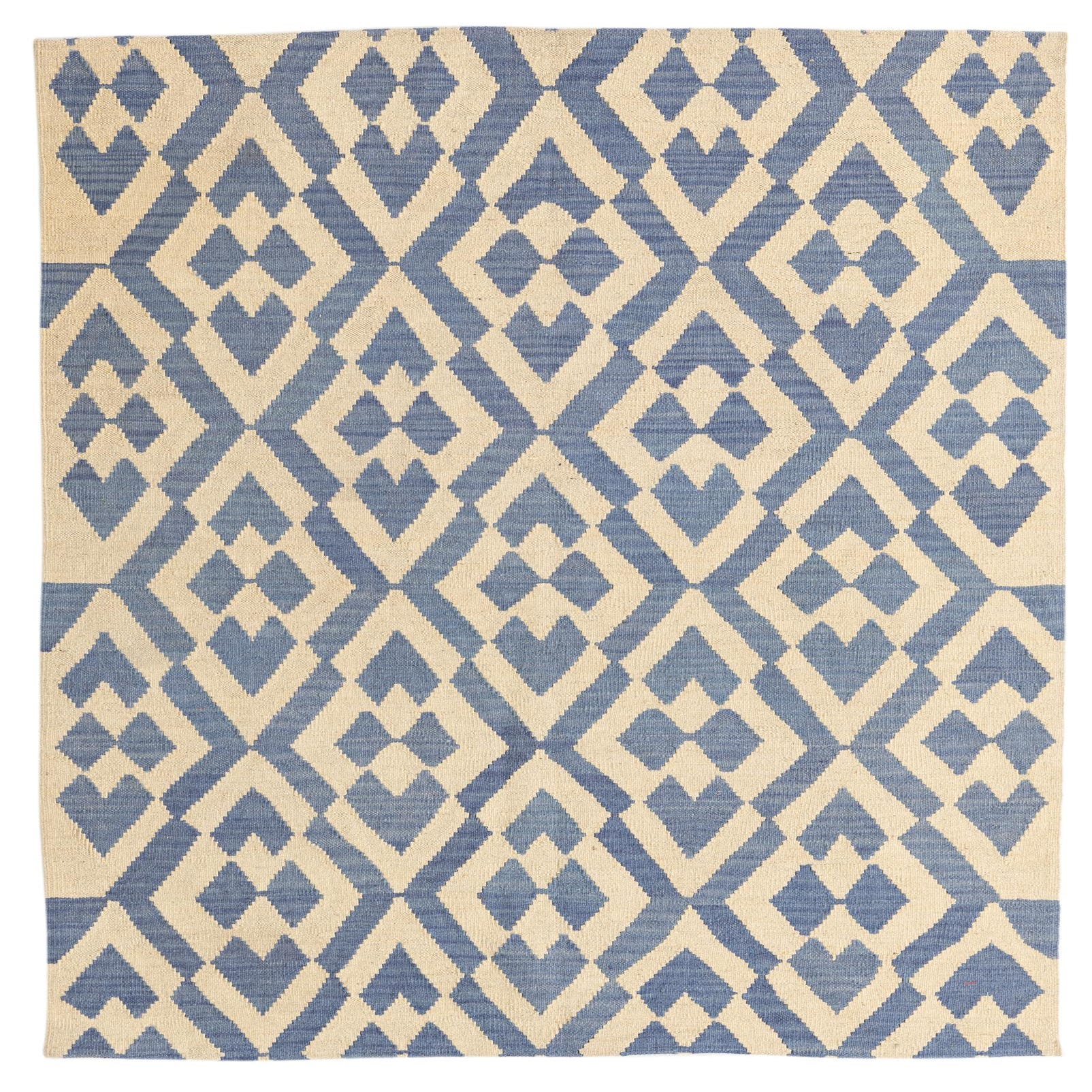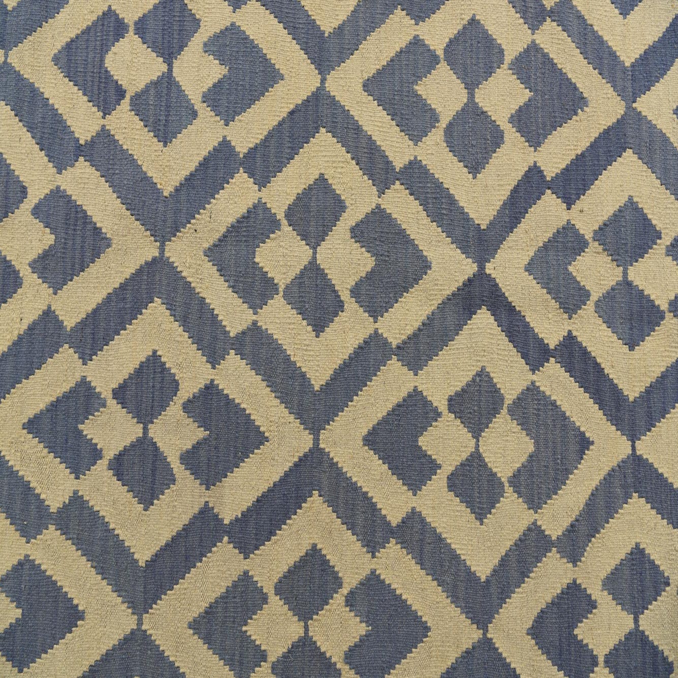The Kilim Modern Collection presents a hand-woven rug crafted from 100% wool, offering a blend of durability and tactile comfort. This 4x6 piece showcases an ivory background accented by a compelling geometric pattern in shades of blue. The precision of the design and the flatweave construction lends a contemporary edge to the textile, suitable for a variety of interior styles.