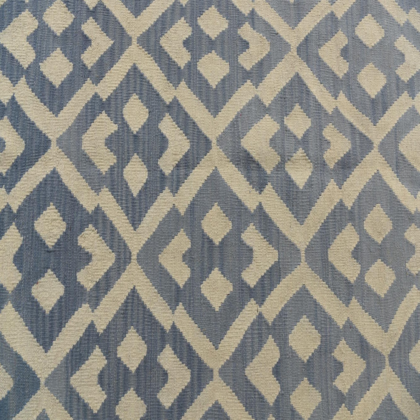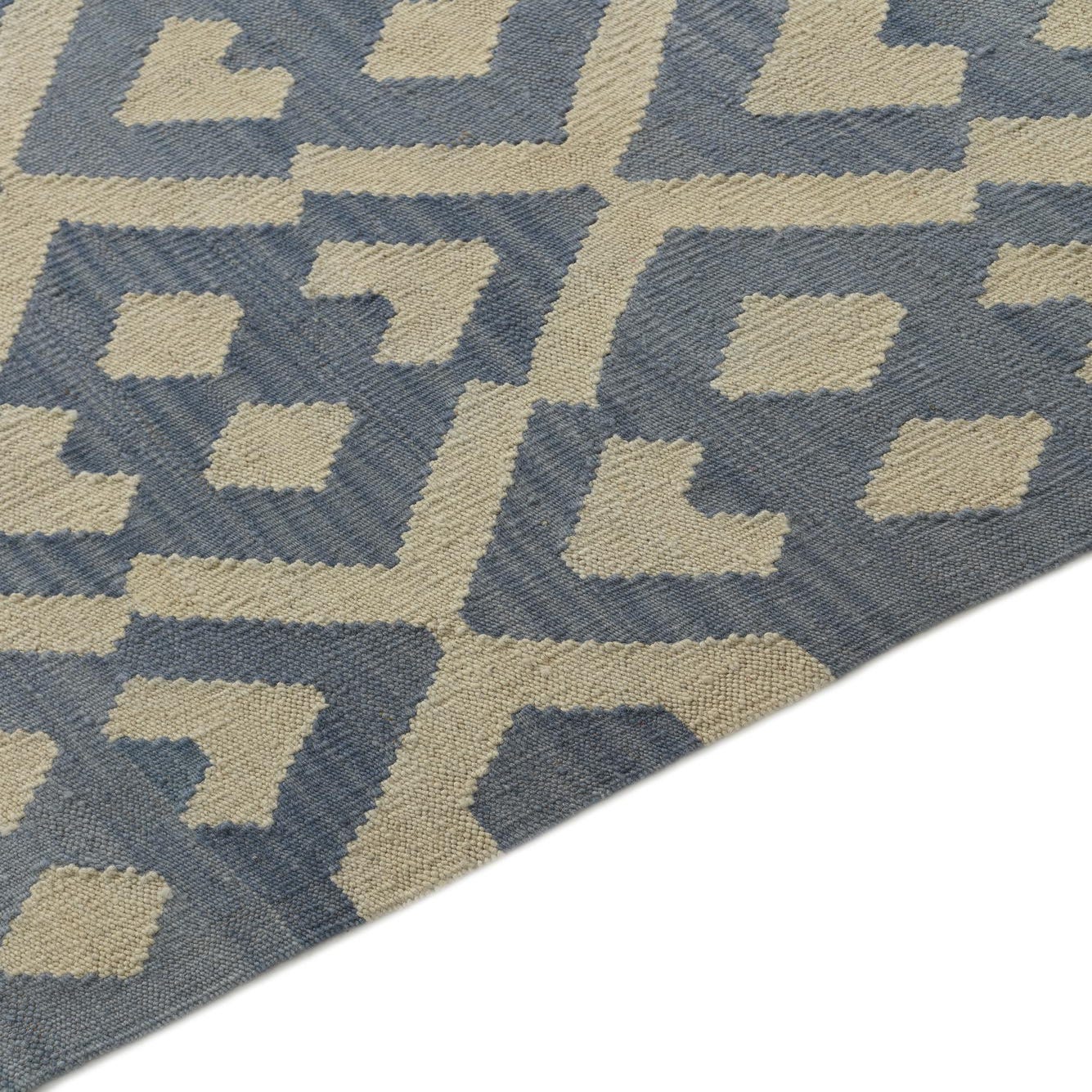 A 4x6 rectangular flatweave rug featuring a tribal geometric pattern in shades of blue and ivory.
