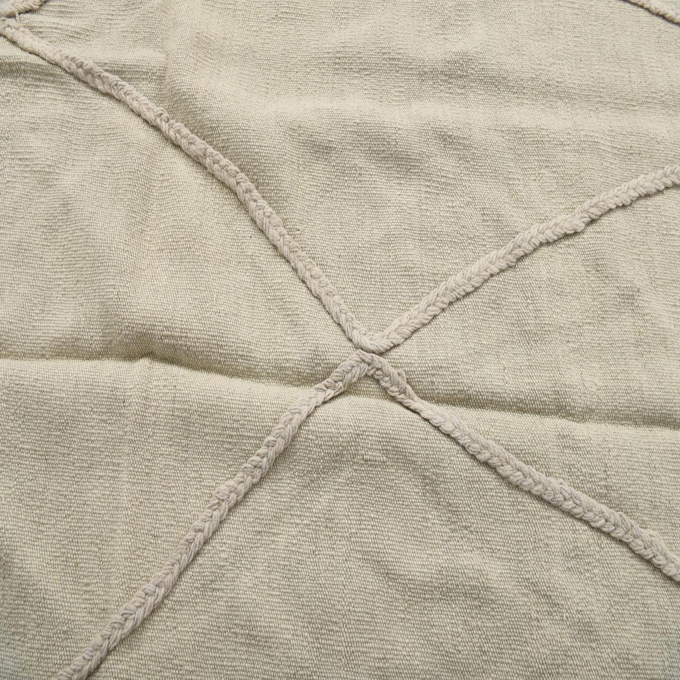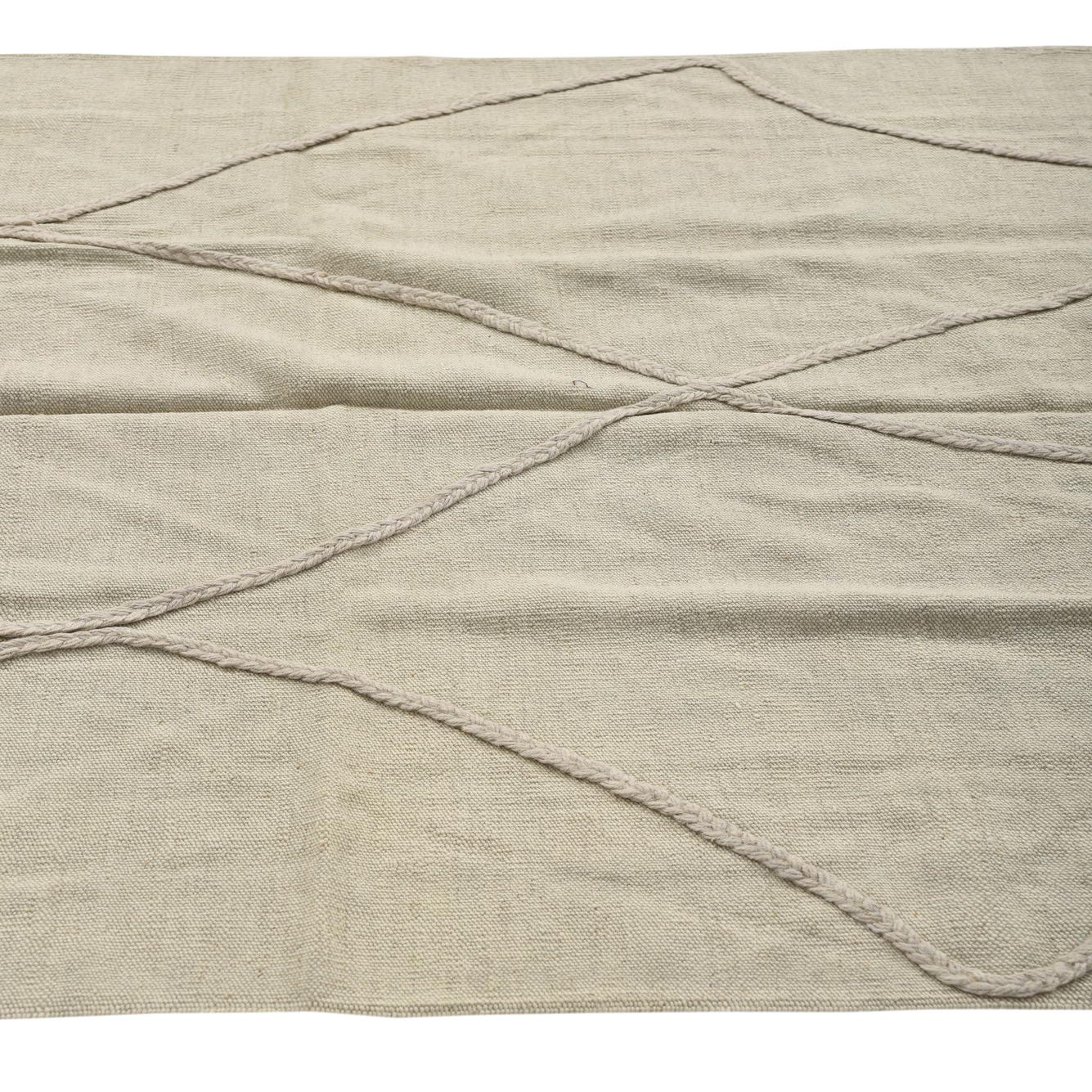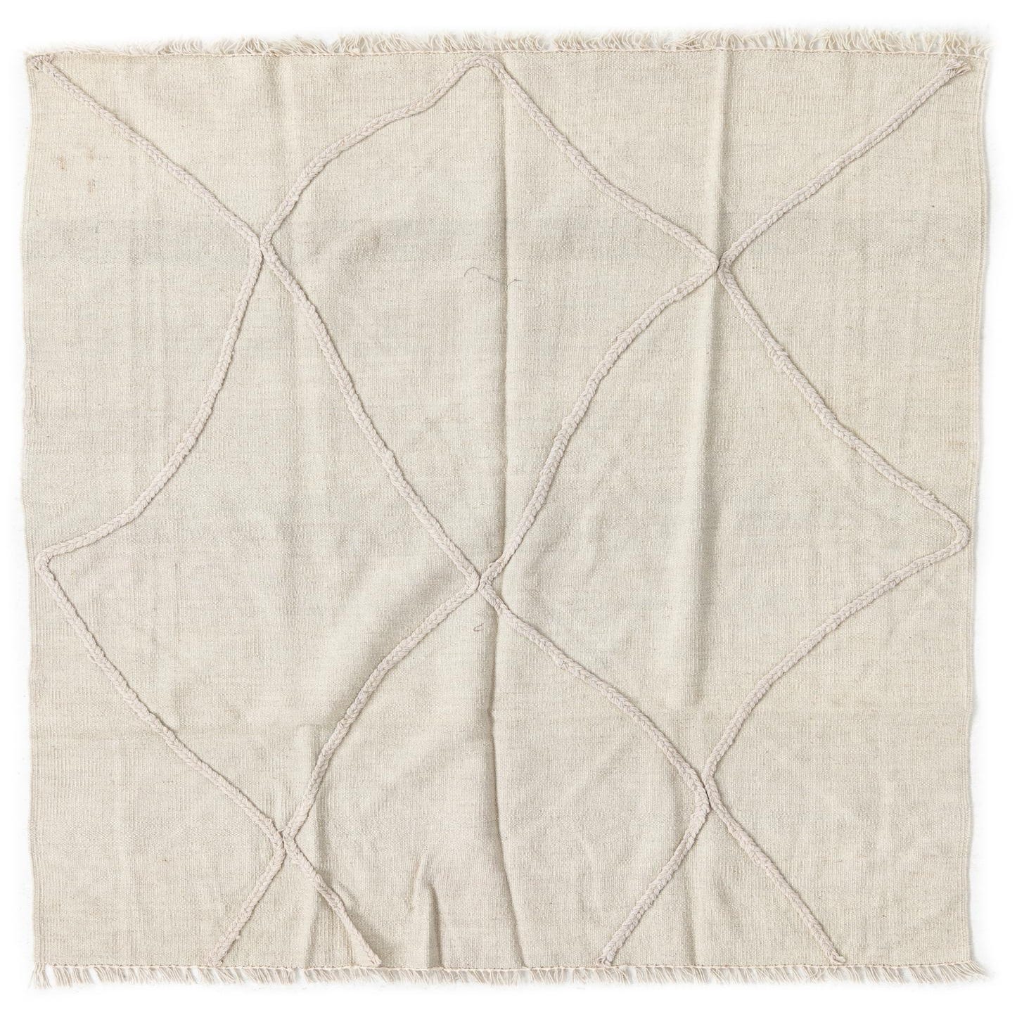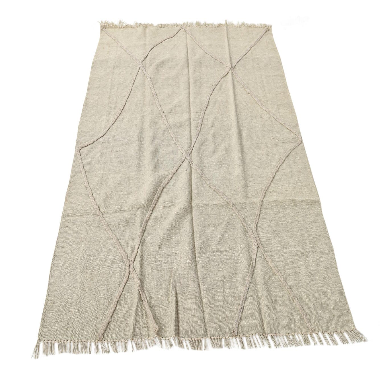 A 4x6 rectangular ivory wool flatweave rug with a textured tribal diamond pattern and fringed edges.