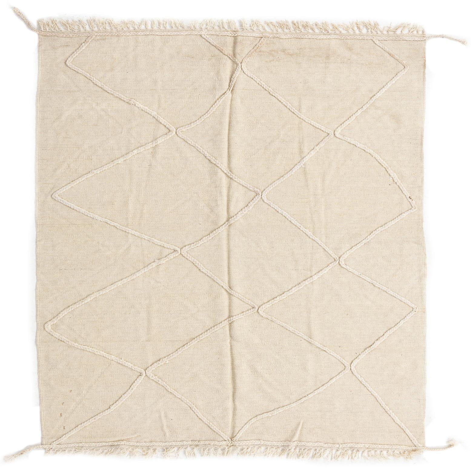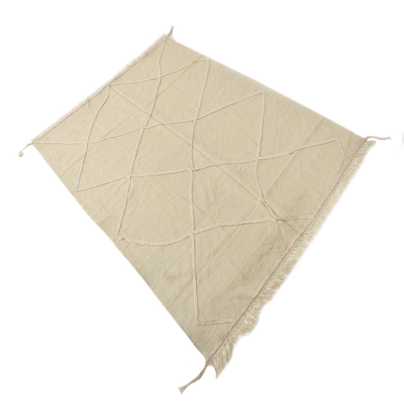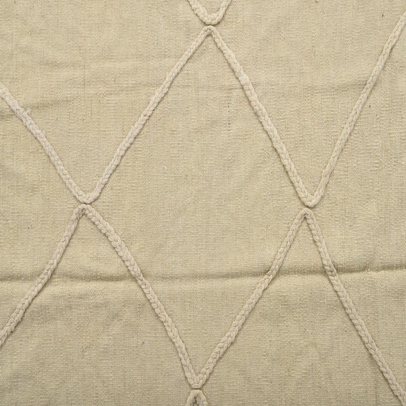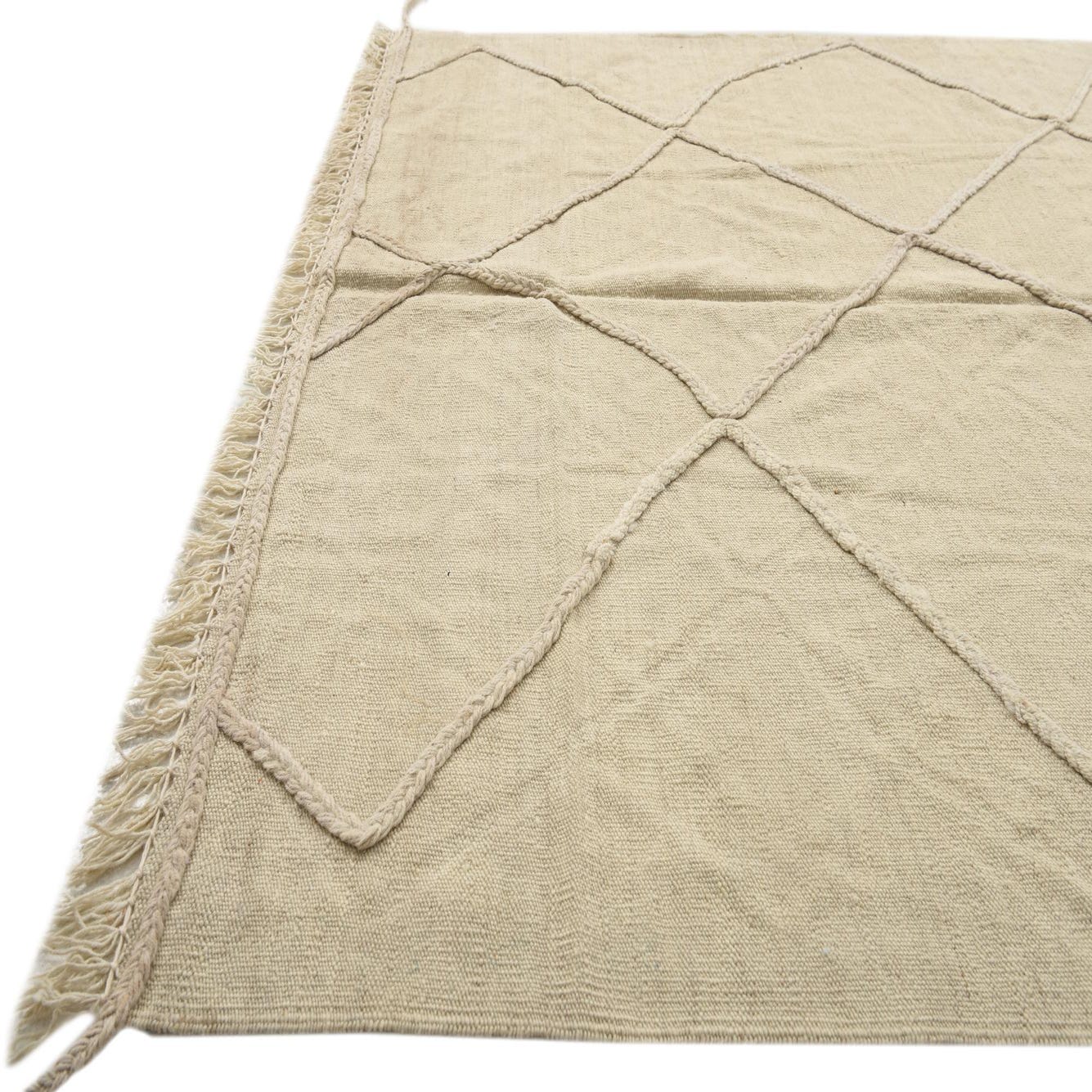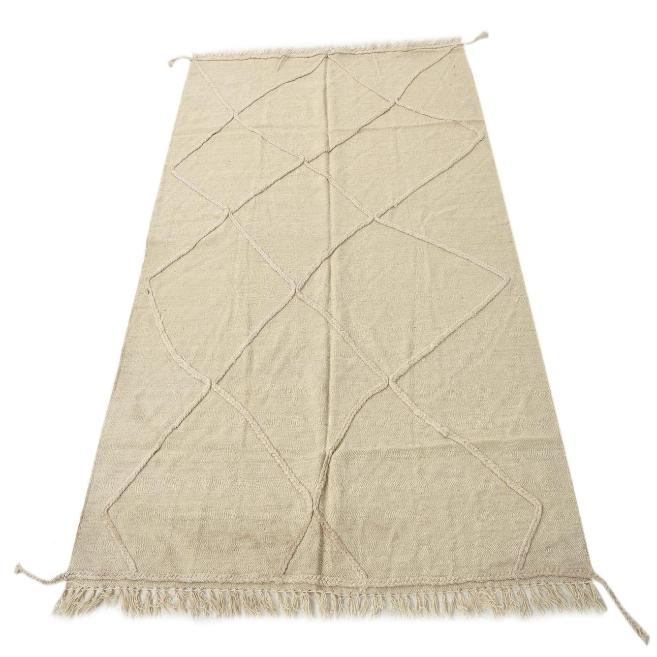 A 4x6 rectangular ivory flatweave wool rug with a raised braided diamond pattern and fringed ends.