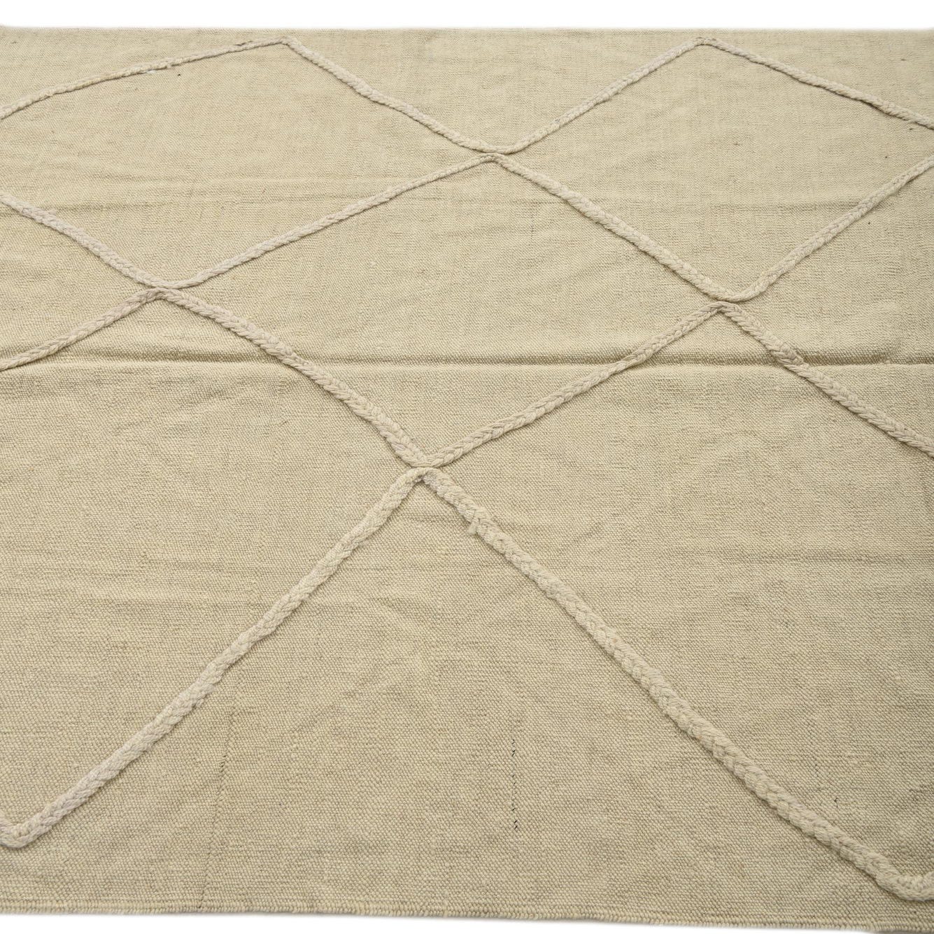 The Kilim Modern collection presents a hand-woven piece crafted from 100% wool, offering both durability and a soft texture underfoot. This 4x6 rug showcases a minimalist design with an ivory background, overlaid by a simplistic yet visually striking geometric pattern. The pattern features a series of interconnected lines forming asymmetric diamond shapes that provide a subtle yet impactful visual appeal.