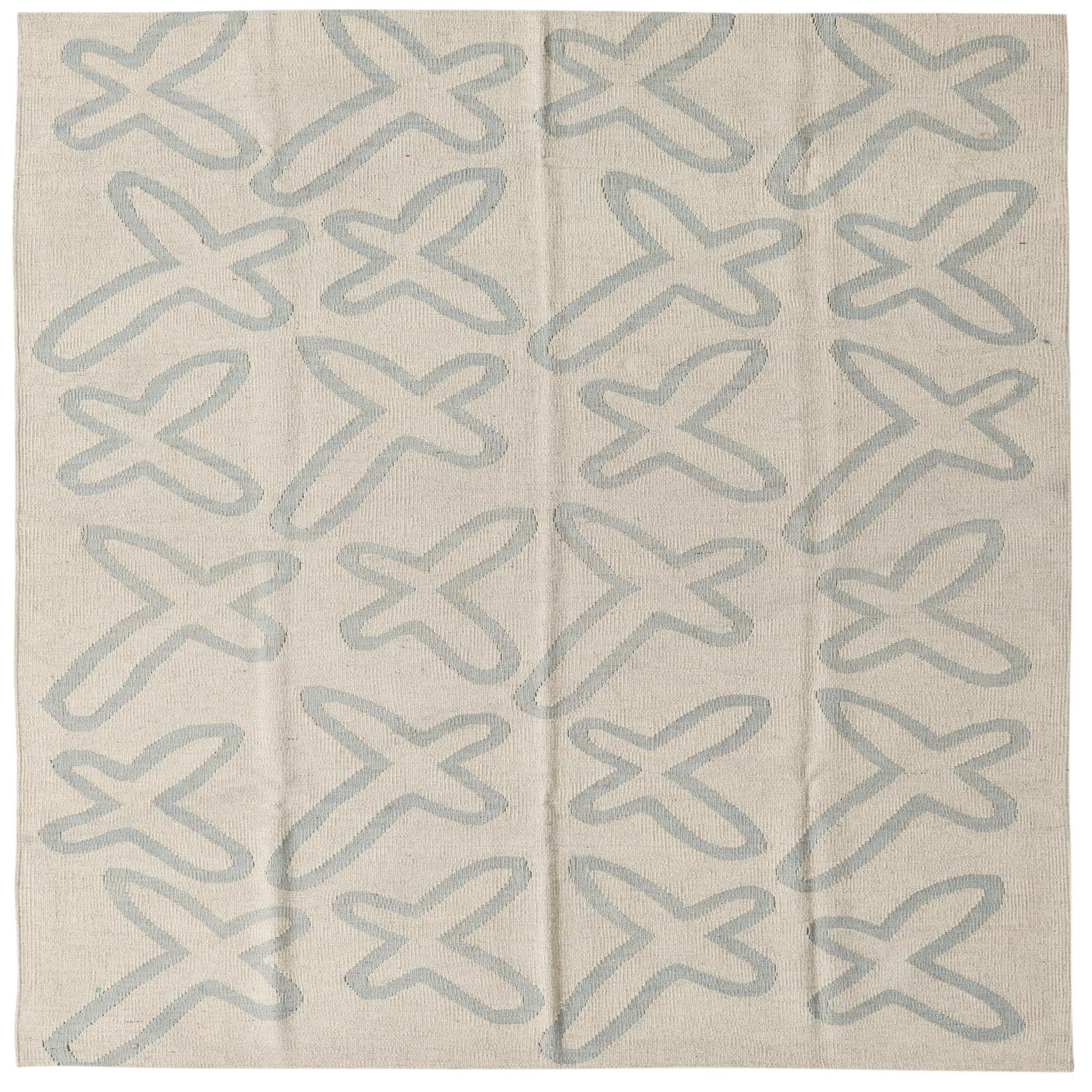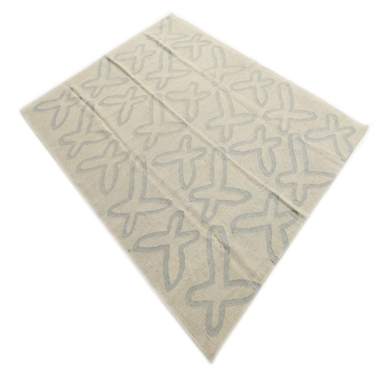 The flatweave construction is characteristic of kilim rugs, delivering a low pile that caters well to high-traffic areas and under furniture. The contemporary pattern harmonizes with modern interior aesthetics while paying homage to the timeless artistry of kilim weaves. The subtle color palette can seamlessly integrate with a variety of decors, ranging from minimalist and Scandinavian styles to more eclectic and bohemian spaces. Its versatile design would also complement a home office, offering a calm yet engaging visual foundation. The use of natural wool enhances the rug's warmth and comfort, making it a desirable addition for living rooms or bedrooms seeking a touch of understated elegance.