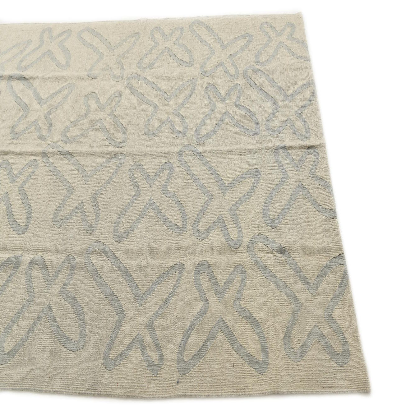 The Kilim Modern collection presents a hand-woven rug crafted from 100% wool, offering a blend of durability and tactile pleasure. This particular 4x6 piece exhibits a simplified take on the traditional kilim design, featuring a minimalist pattern of interlocking shapes. The background color is a neutral ivory, which provides a serene canvas for the light blue geometric motifs that adorn the rug's surface.