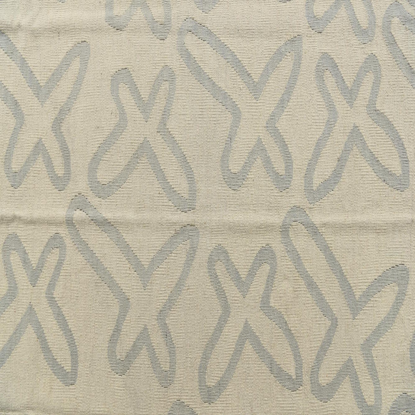 A 4x6 rectangular ivory flatweave rug with a repeating light blue abstract X-shaped tribal pattern.