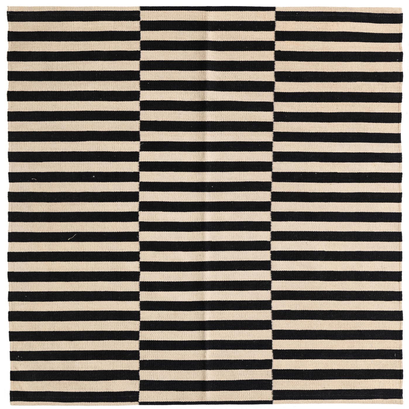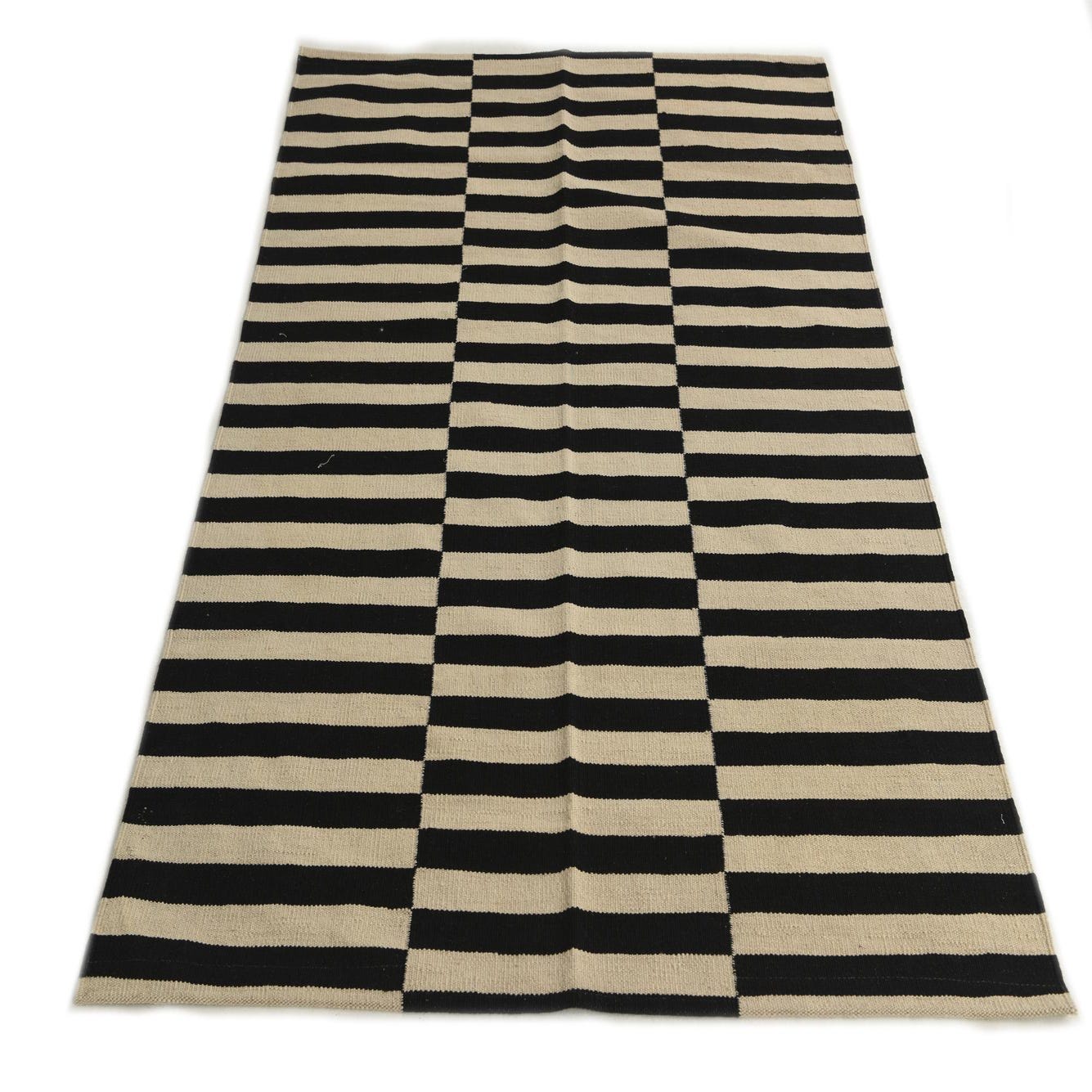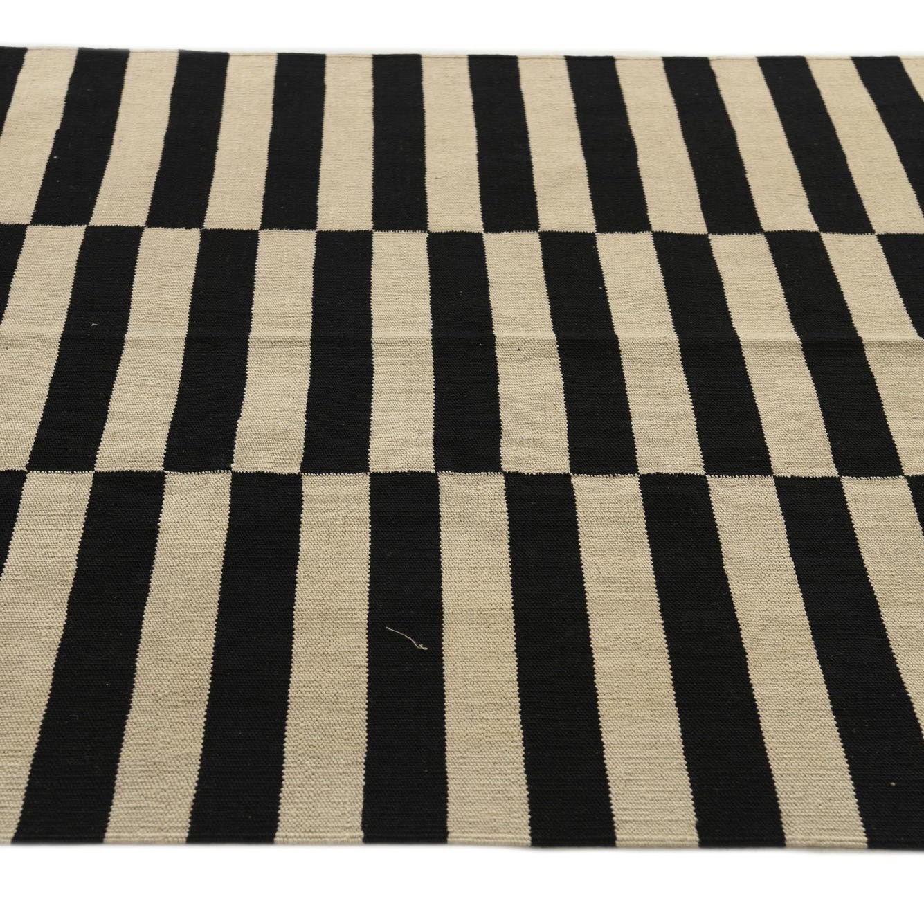A 4x6 rectangular Kilim Modern wool rug featuring alternating black and ivory horizontal stripes in a tribal pattern.