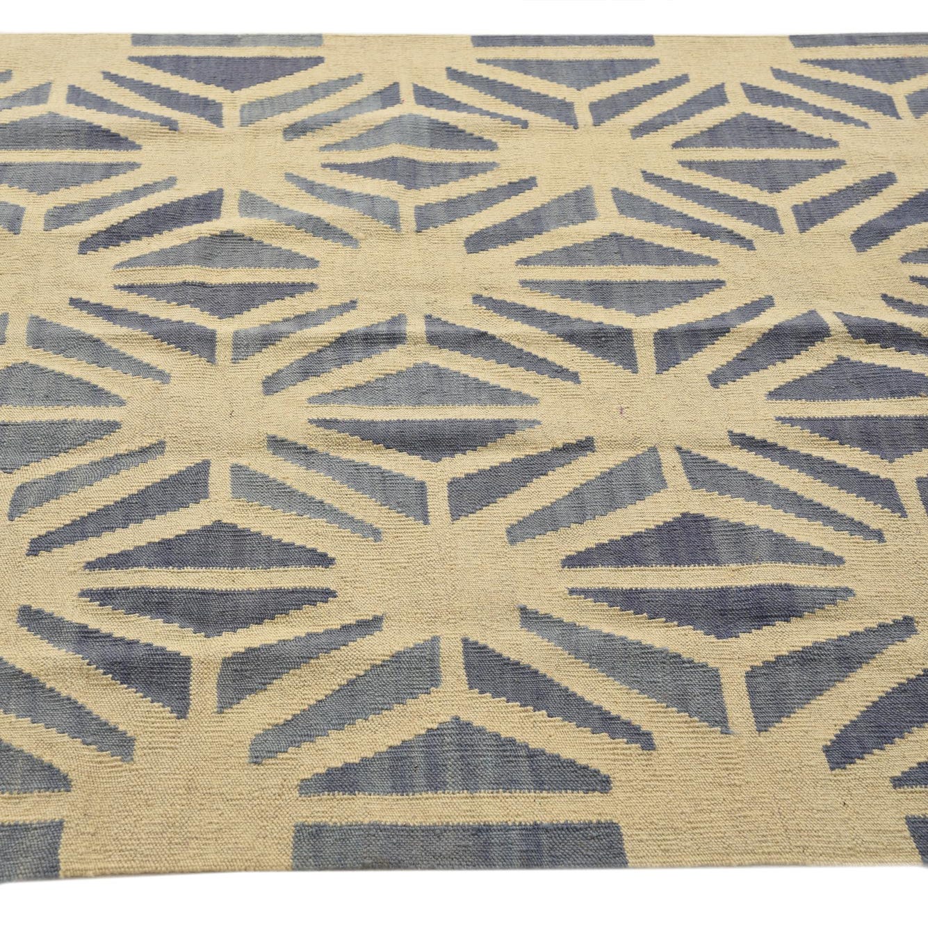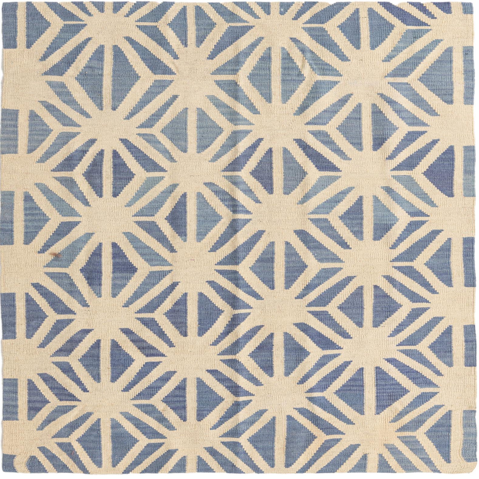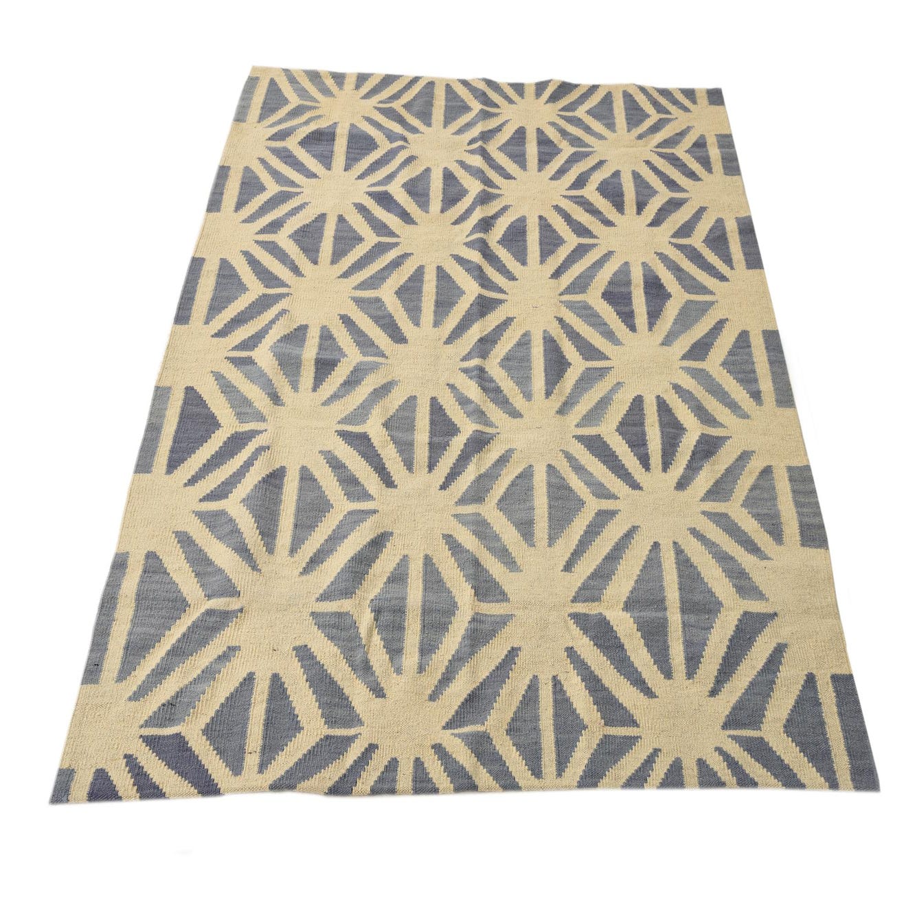 A 4x6 rectangular Kilim Modern rug with an ivory background and a repeating blue geometric tribal pattern.