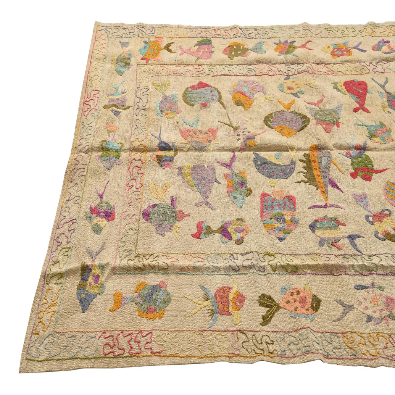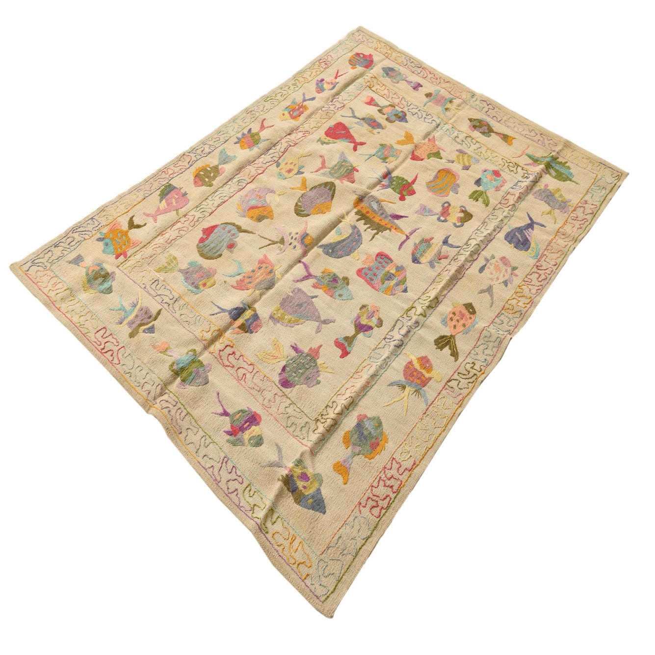 A 4x6 rectangular ivory flatweave rug with a colorful, whimsical fish pattern and a decorative border.