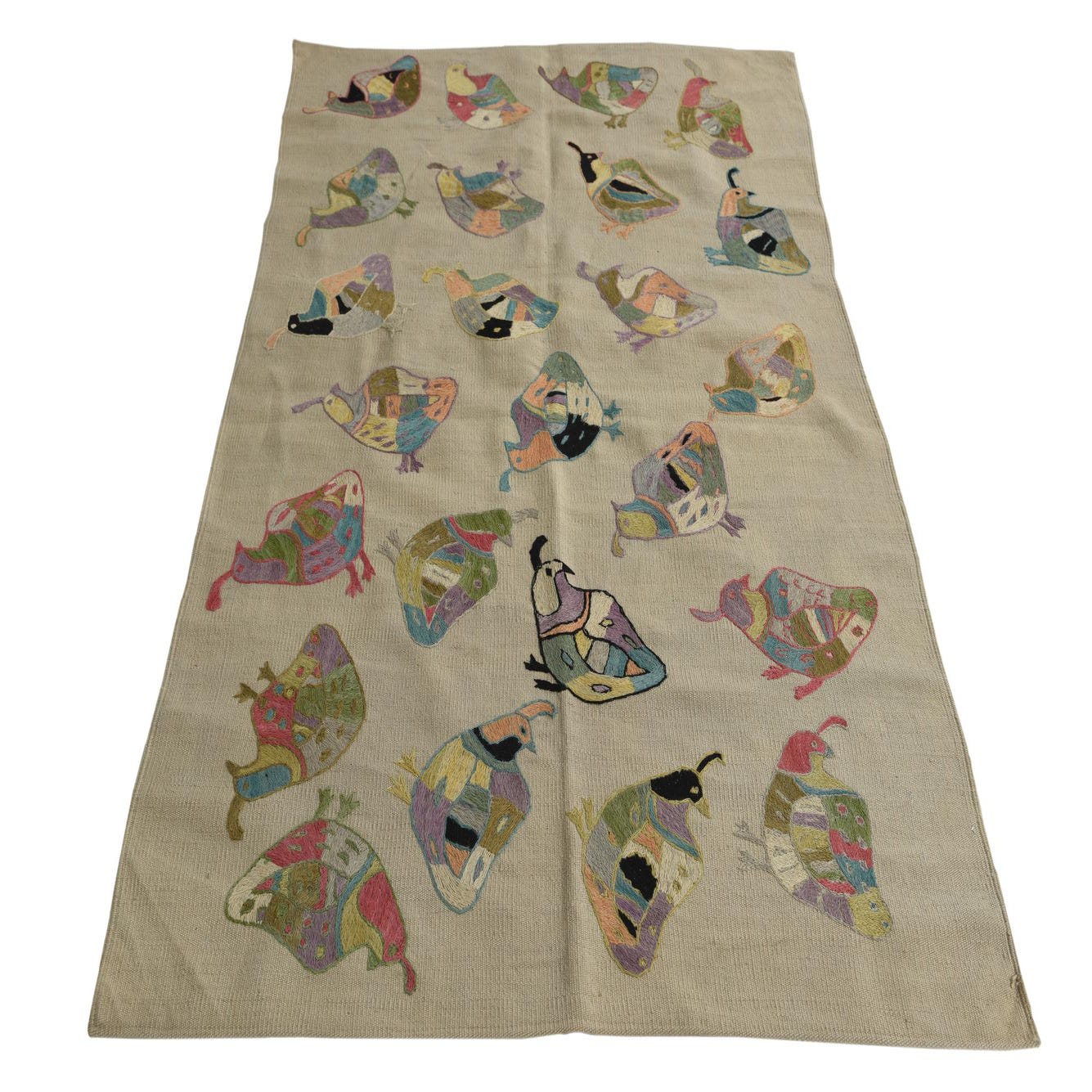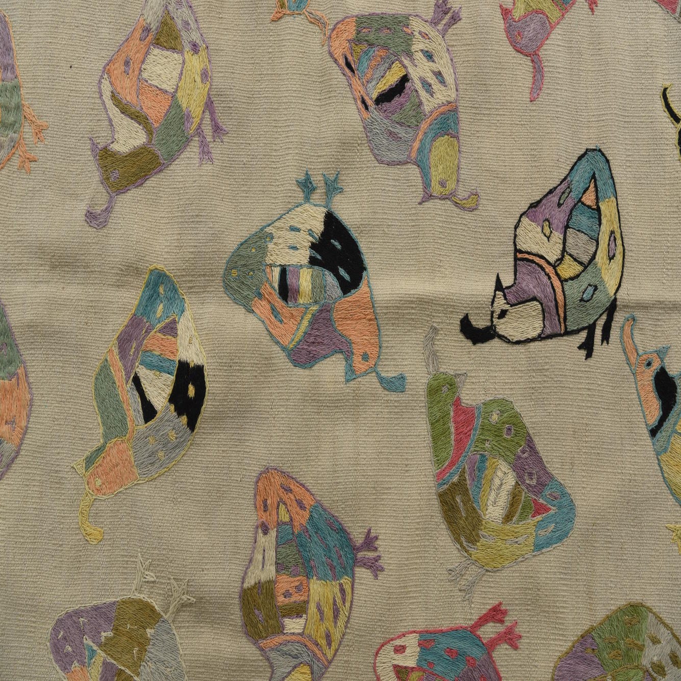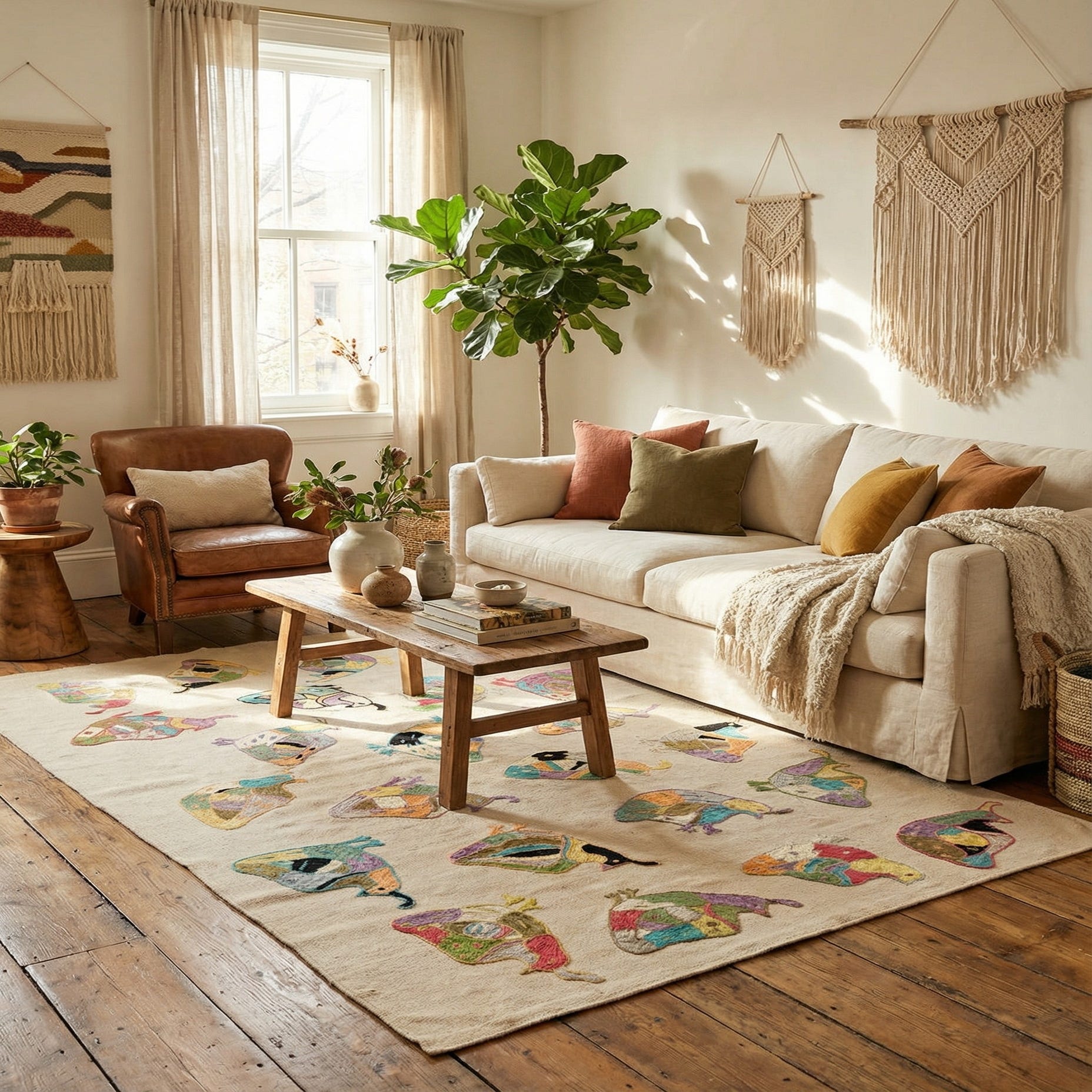A 4x6 rectangular ivory flatweave wool rug with colorful tribal butterfly-like patterns, perfect for a living room.