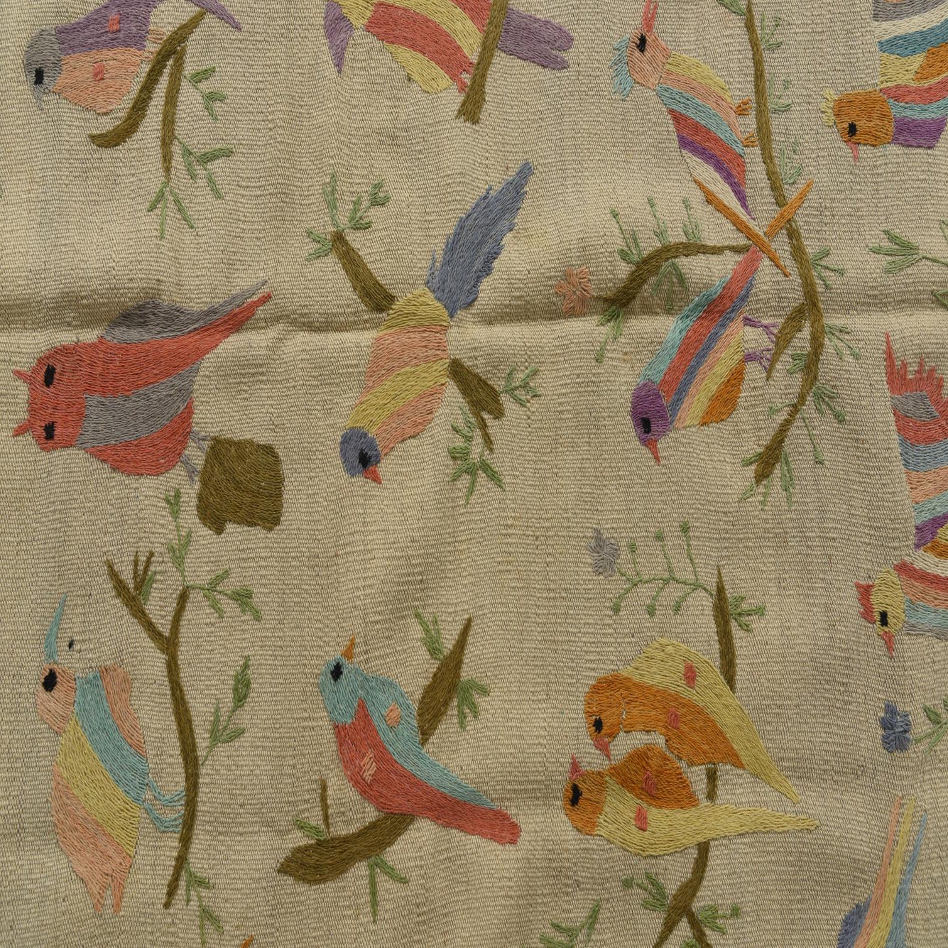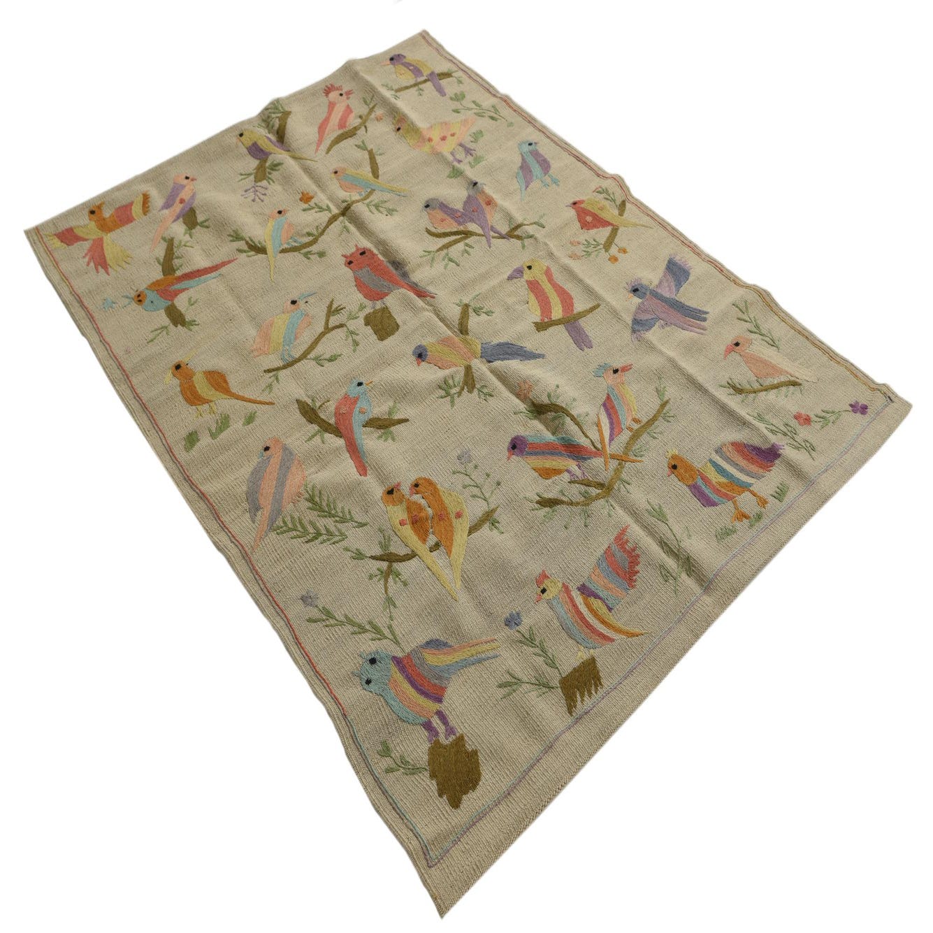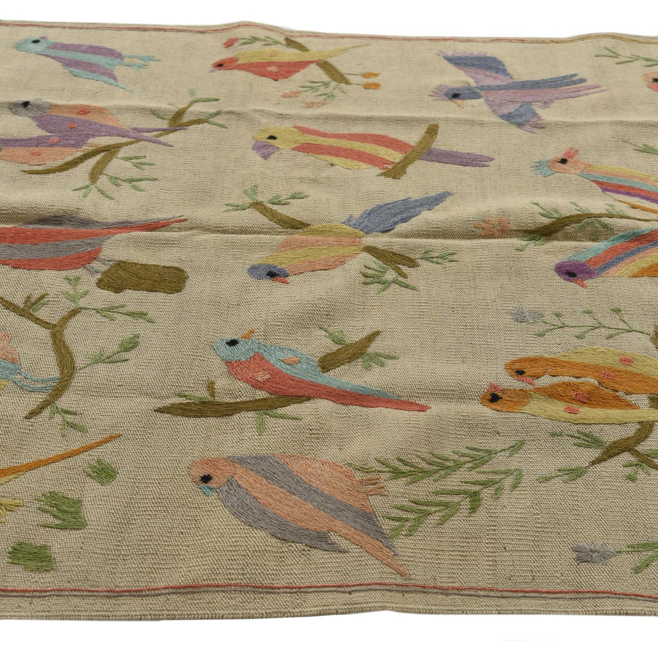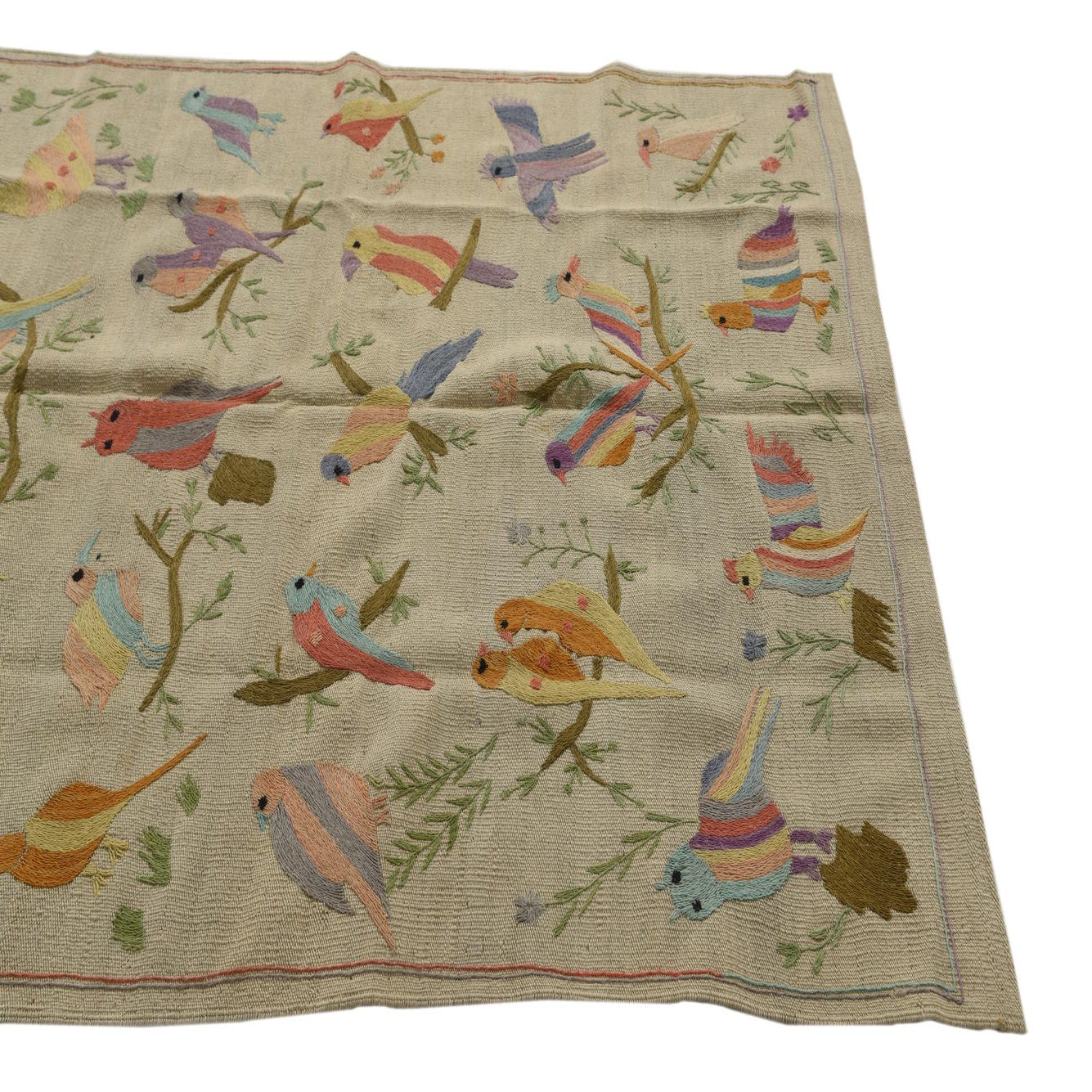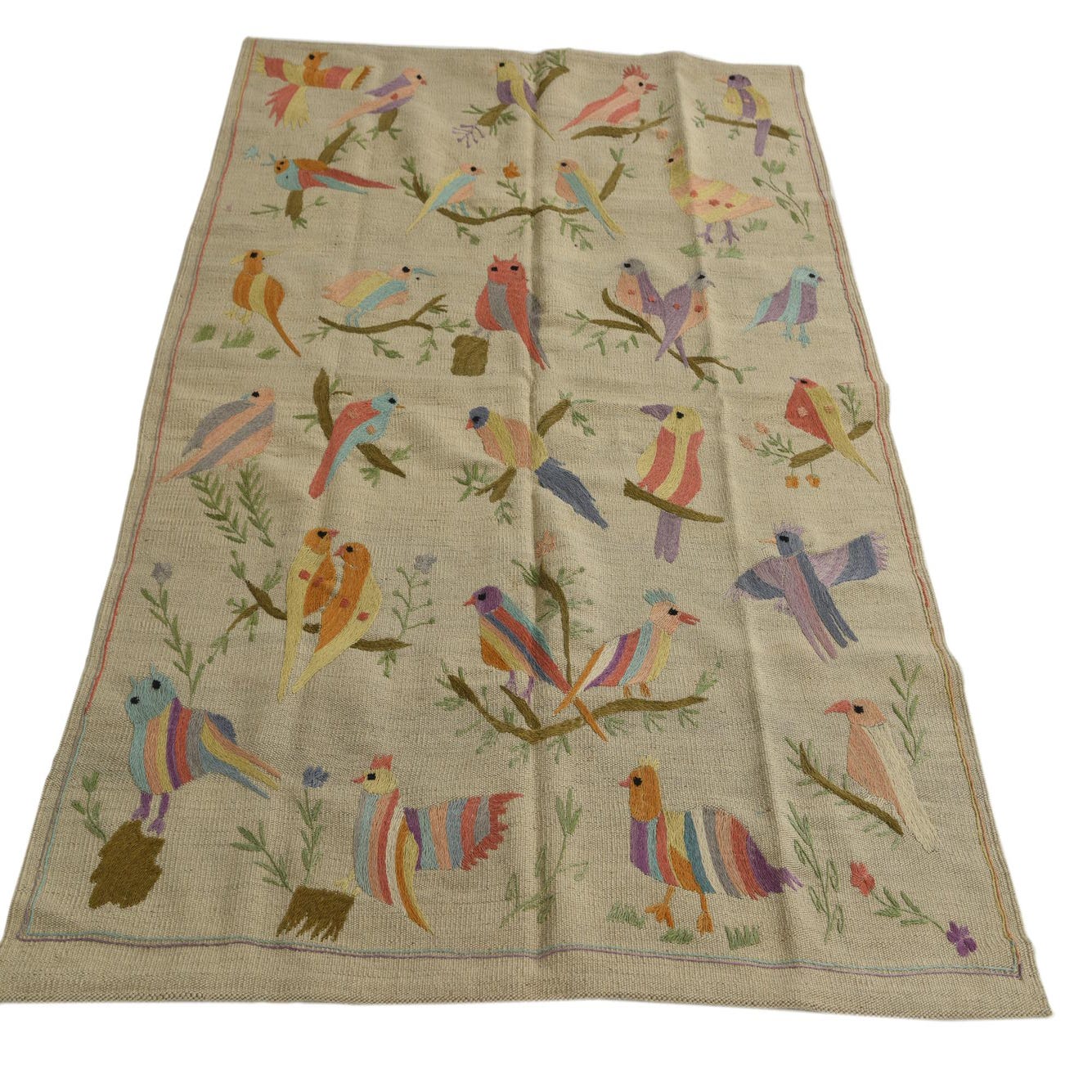 A 4x6 ivory flatweave wool rug with a colorful tribal bird and branch pattern, suitable for a living room.