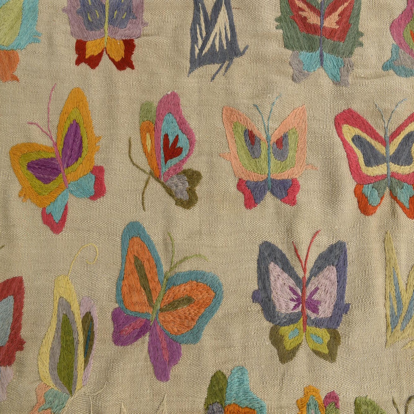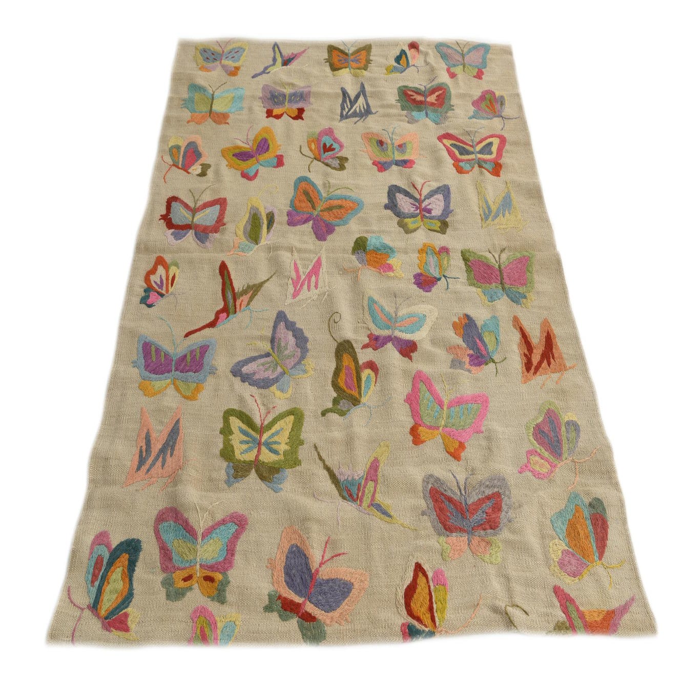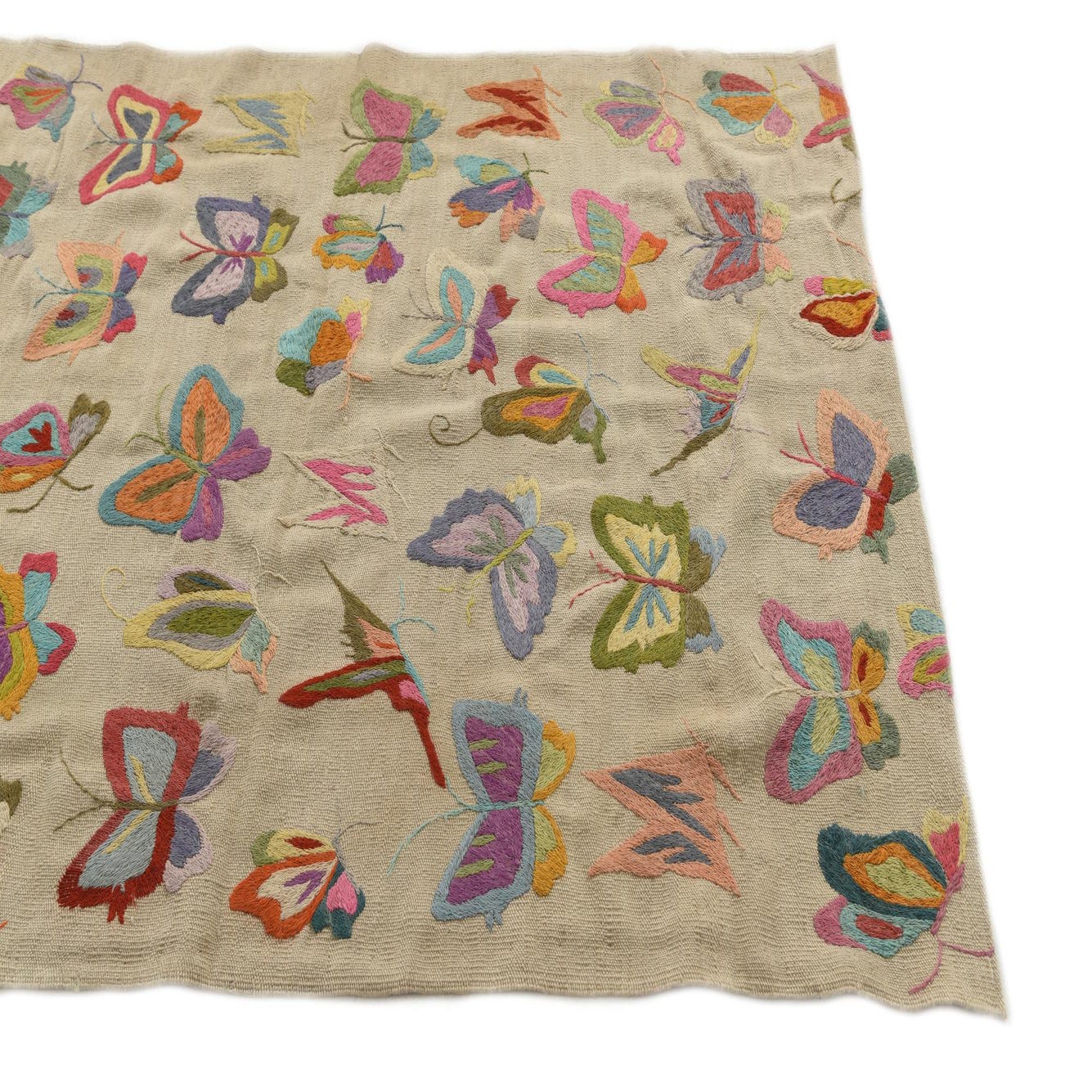 This hand-woven Kilim Suzani rug is a vibrant addition to any space, with its folk-inspired butterfly pattern that brings a touch of whimsy and color. Crafted from 100% wool, the texture is naturally warm and inviting, providing both comfort and durability. Spanning 4x6 feet, this piece showcases a lively array of colors set against an ivory background, with hues that include blue, olive, orange, red, yellow, pink, and light green.