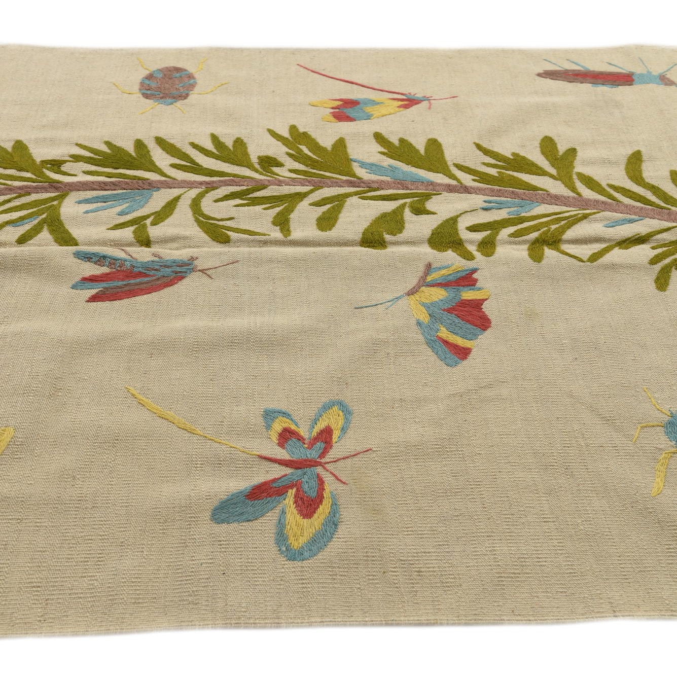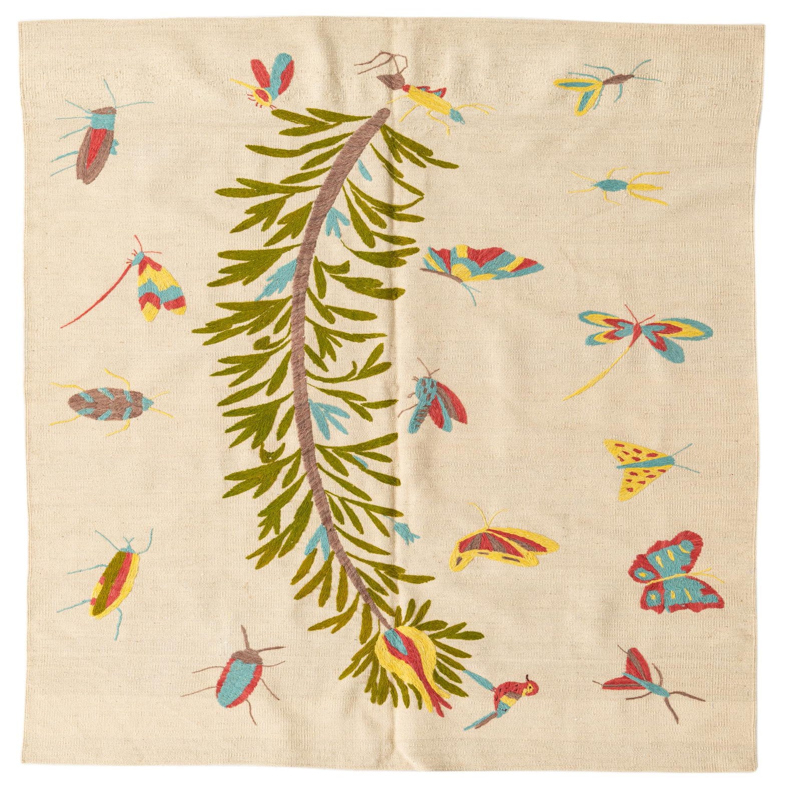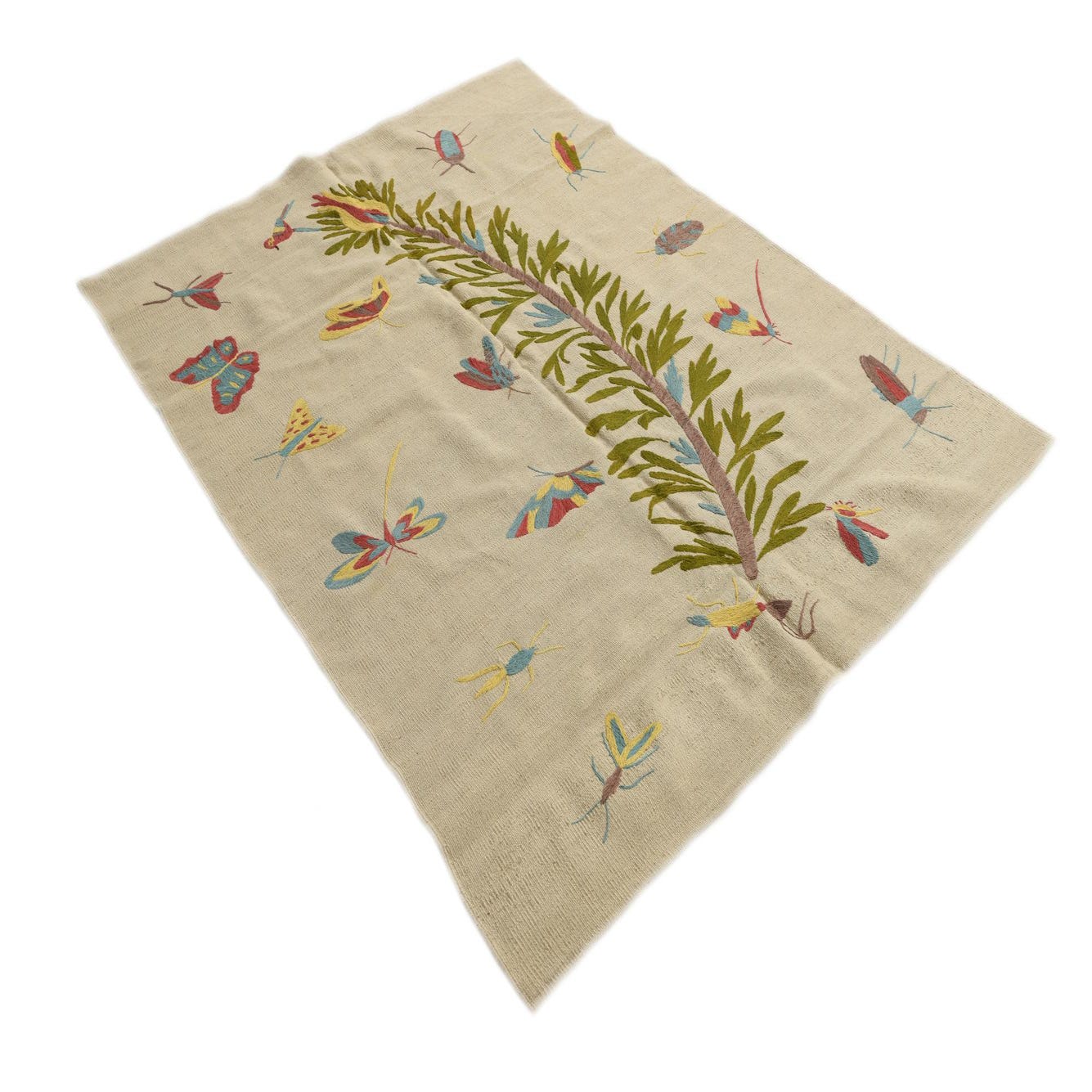 A 4x6 ivory flatweave rug with a central green branch design and colorful tribal insects, butterflies, and moths.