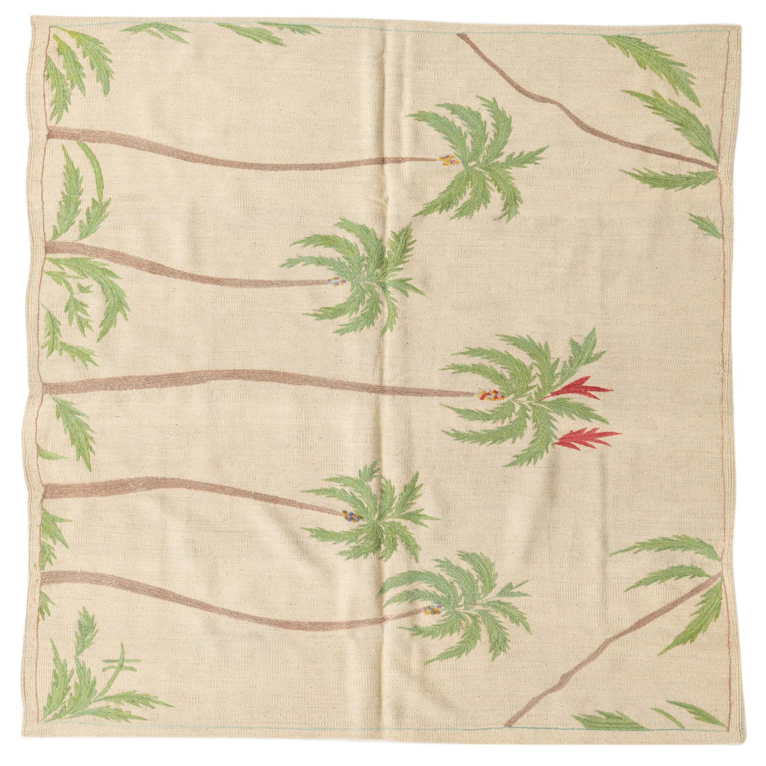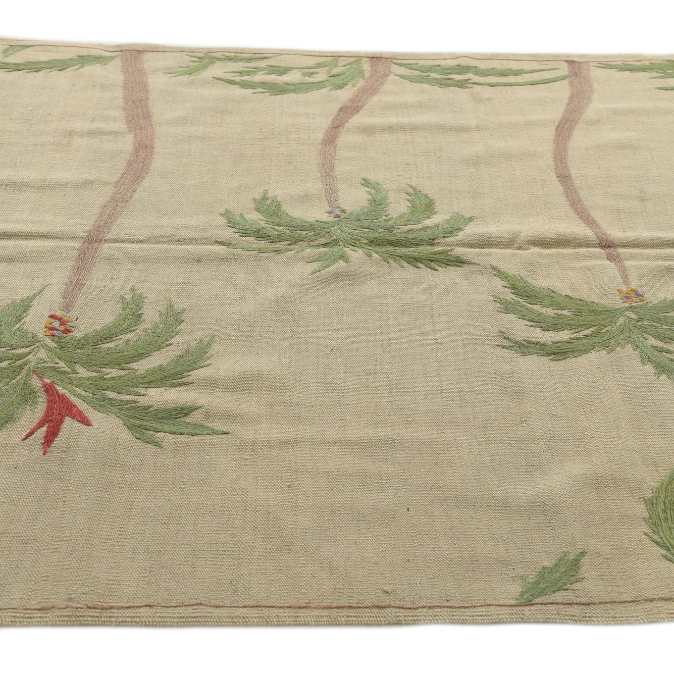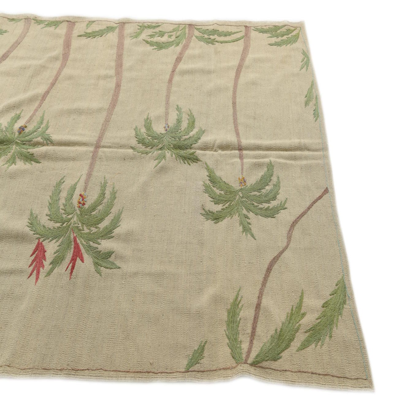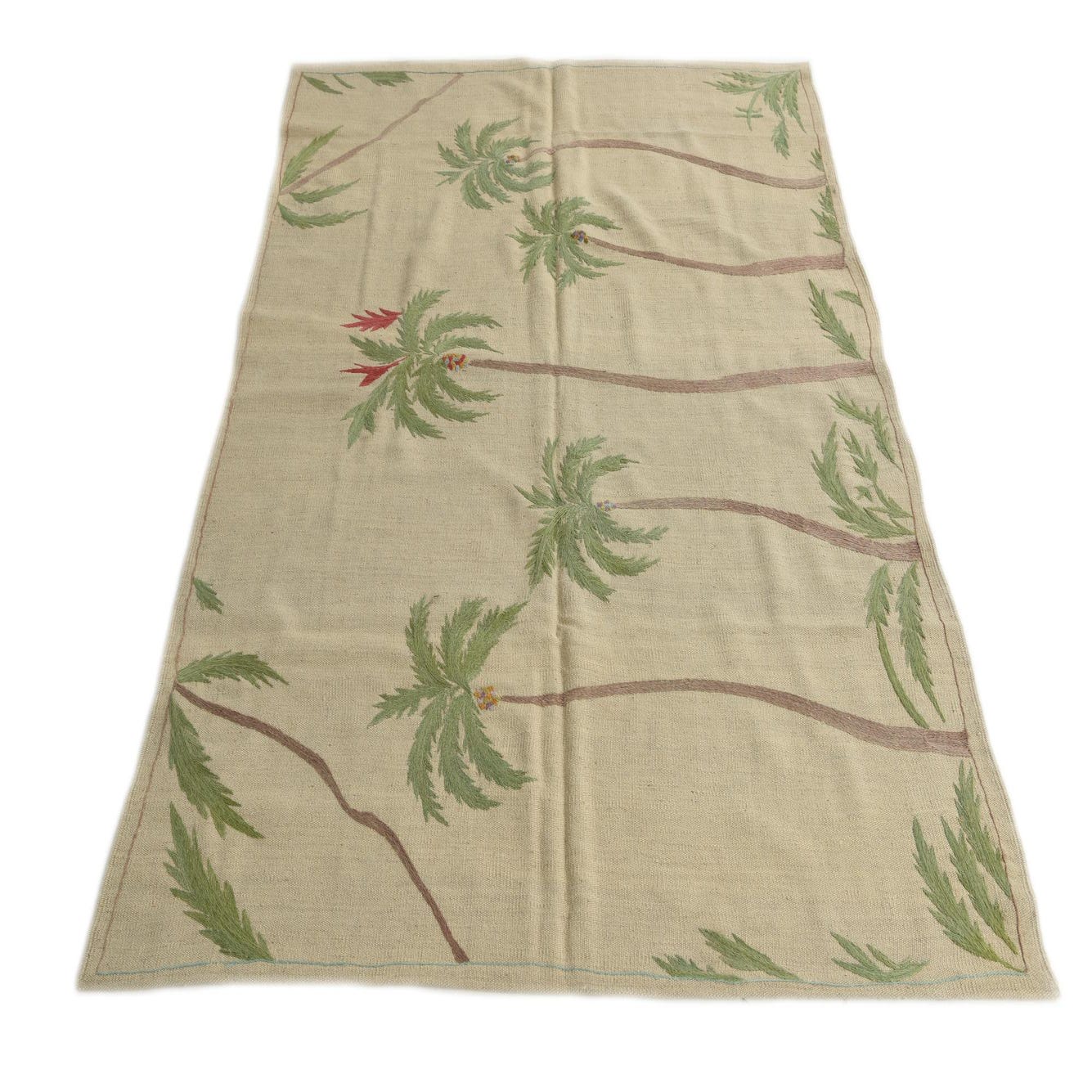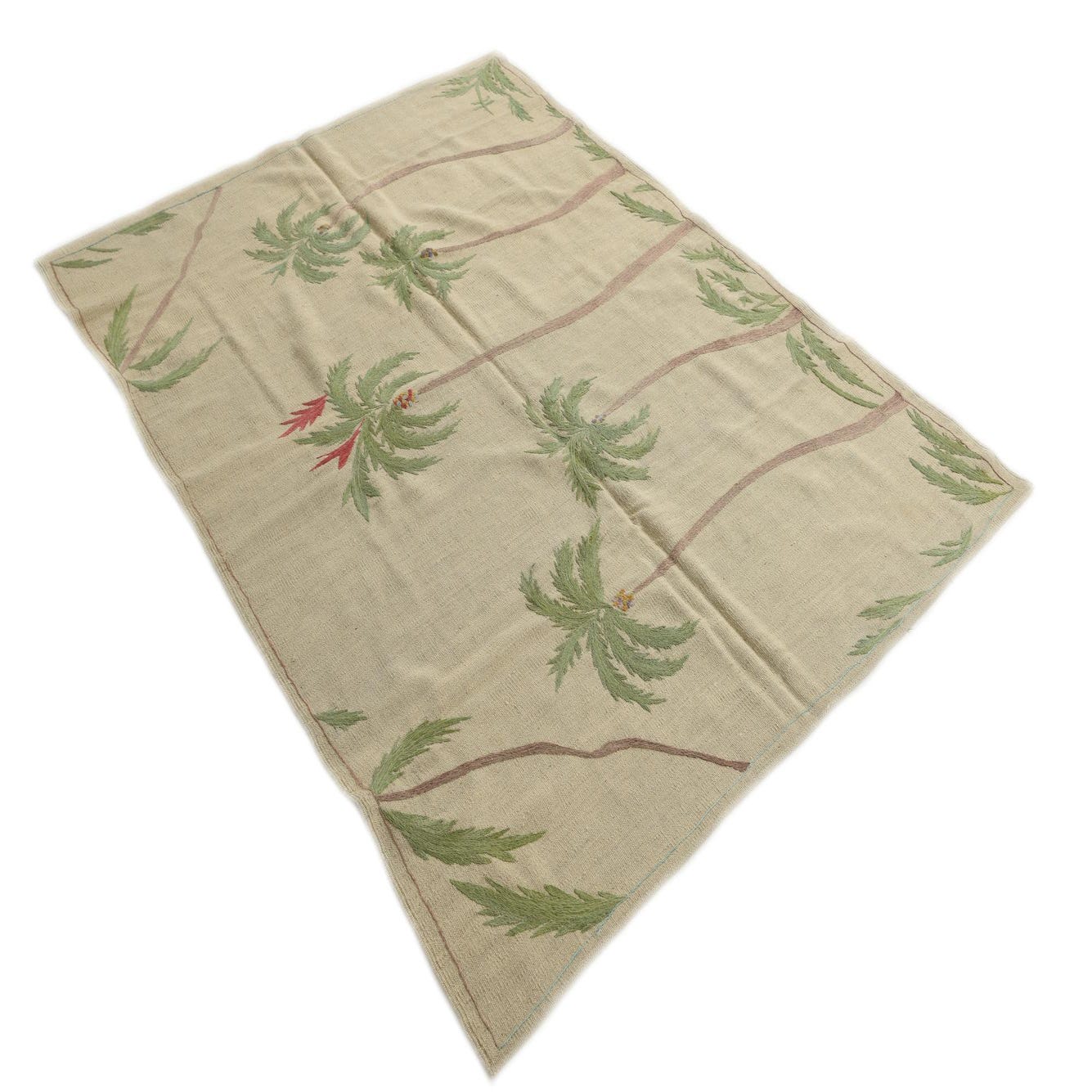 A 4x6 rectangular ivory flatweave rug with a modern tribal pattern of green palm trees and subtle red and yellow accents.