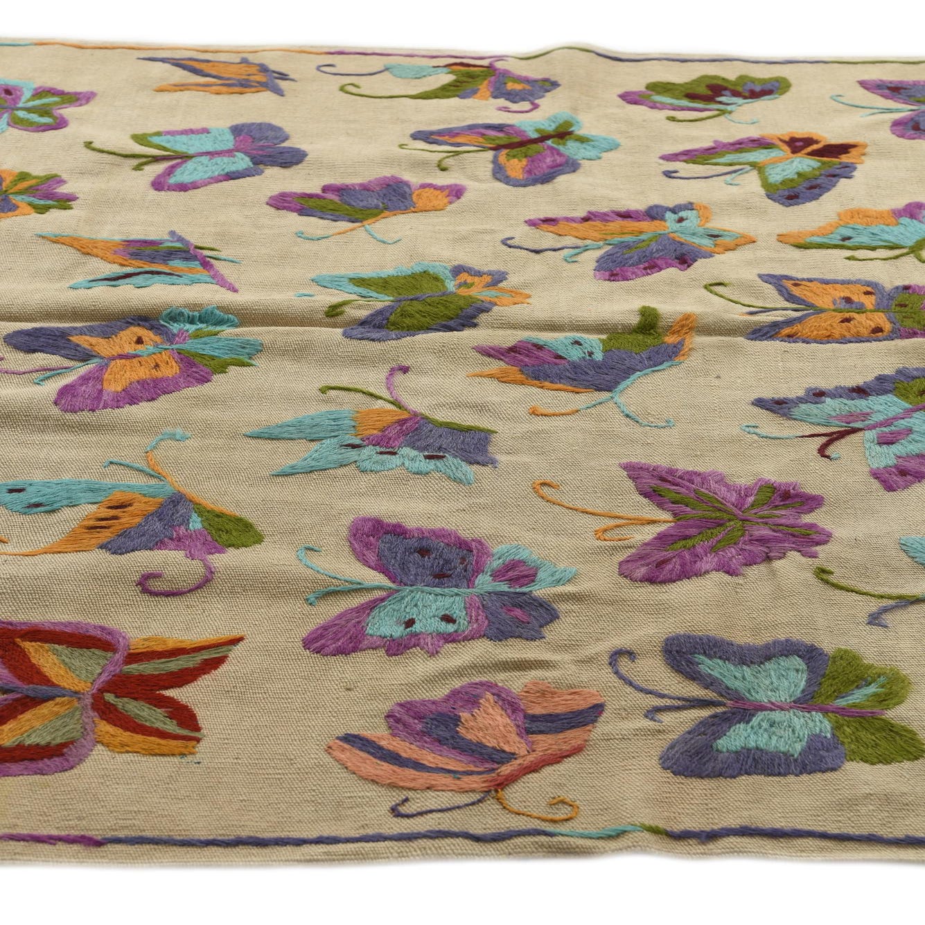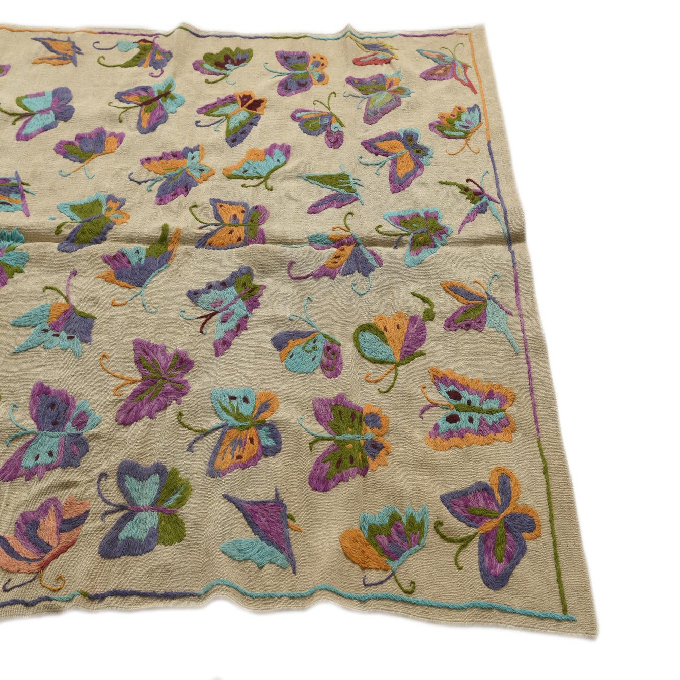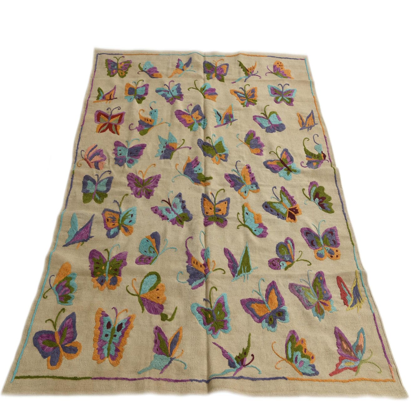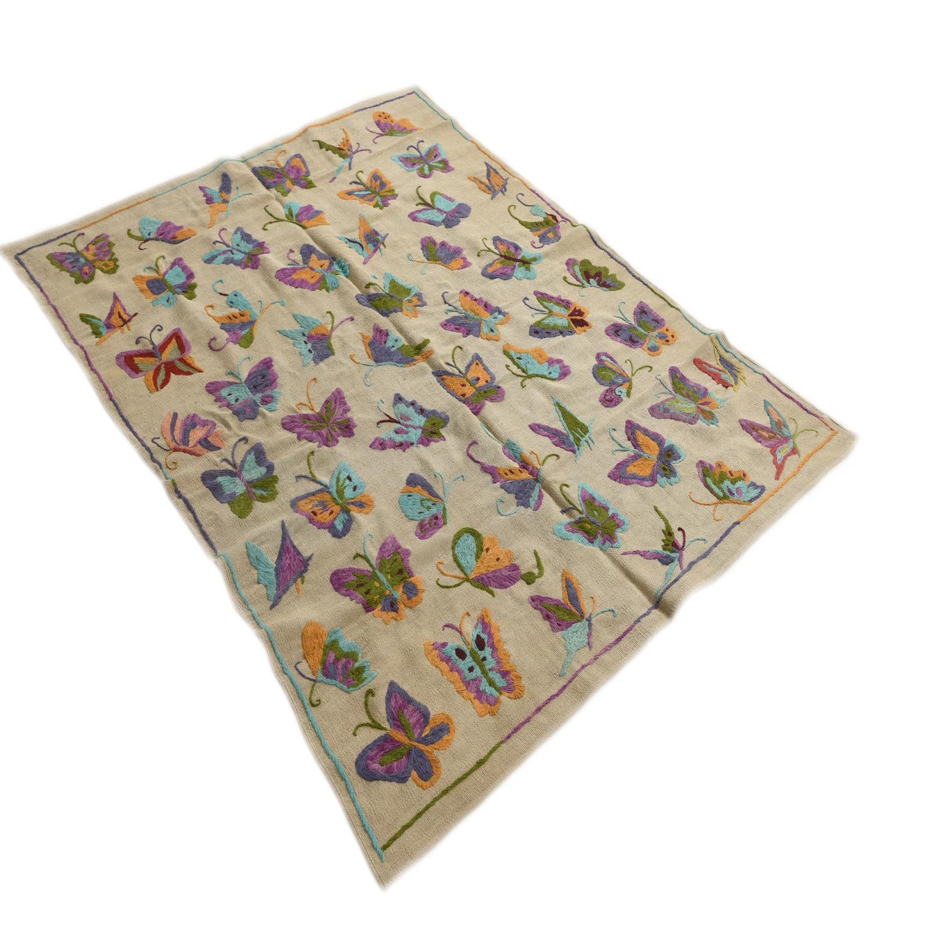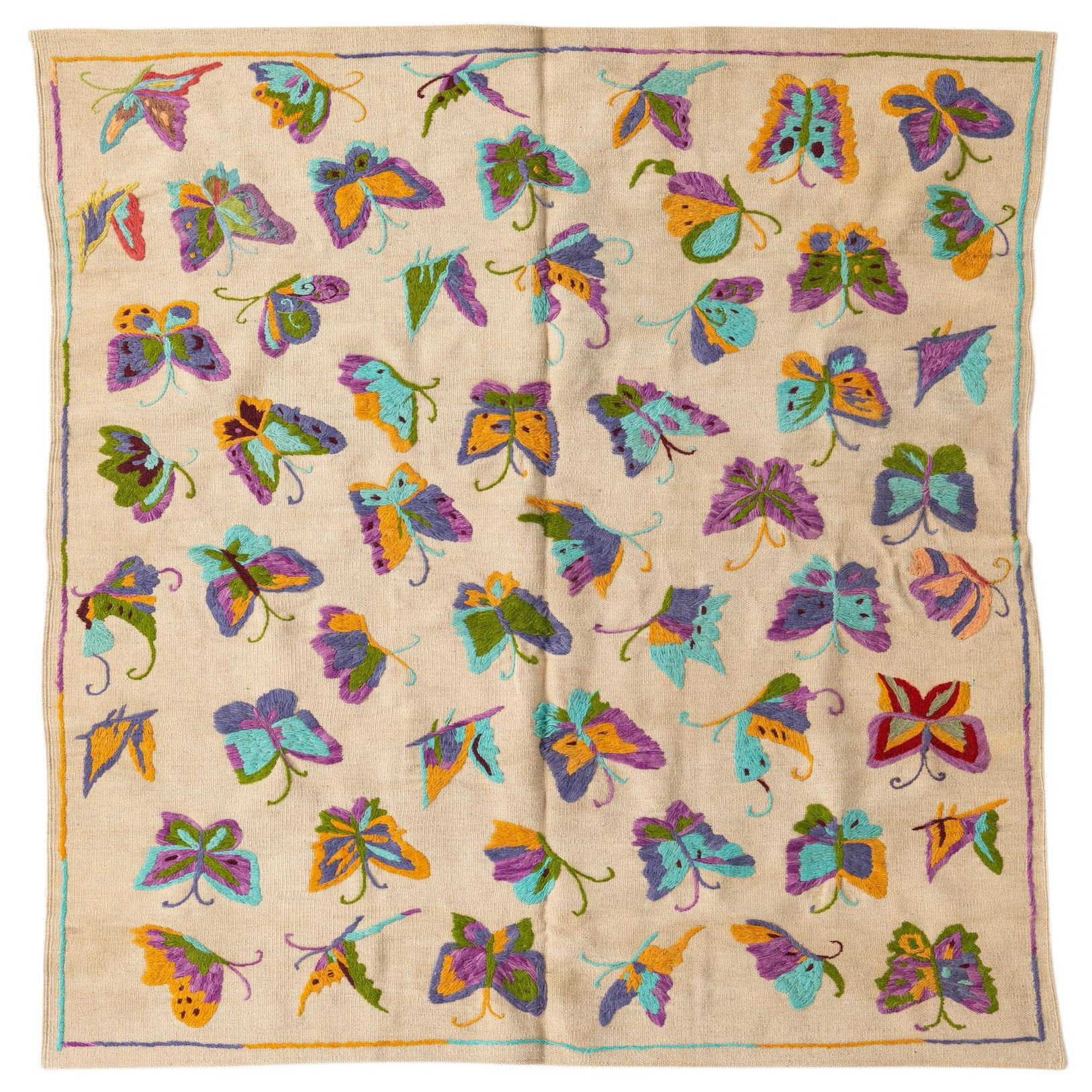 A 4x6 rectangular Kilim Suzani rug with an ivory background and colorful embroidered butterflies in purple, teal, green, and orange.