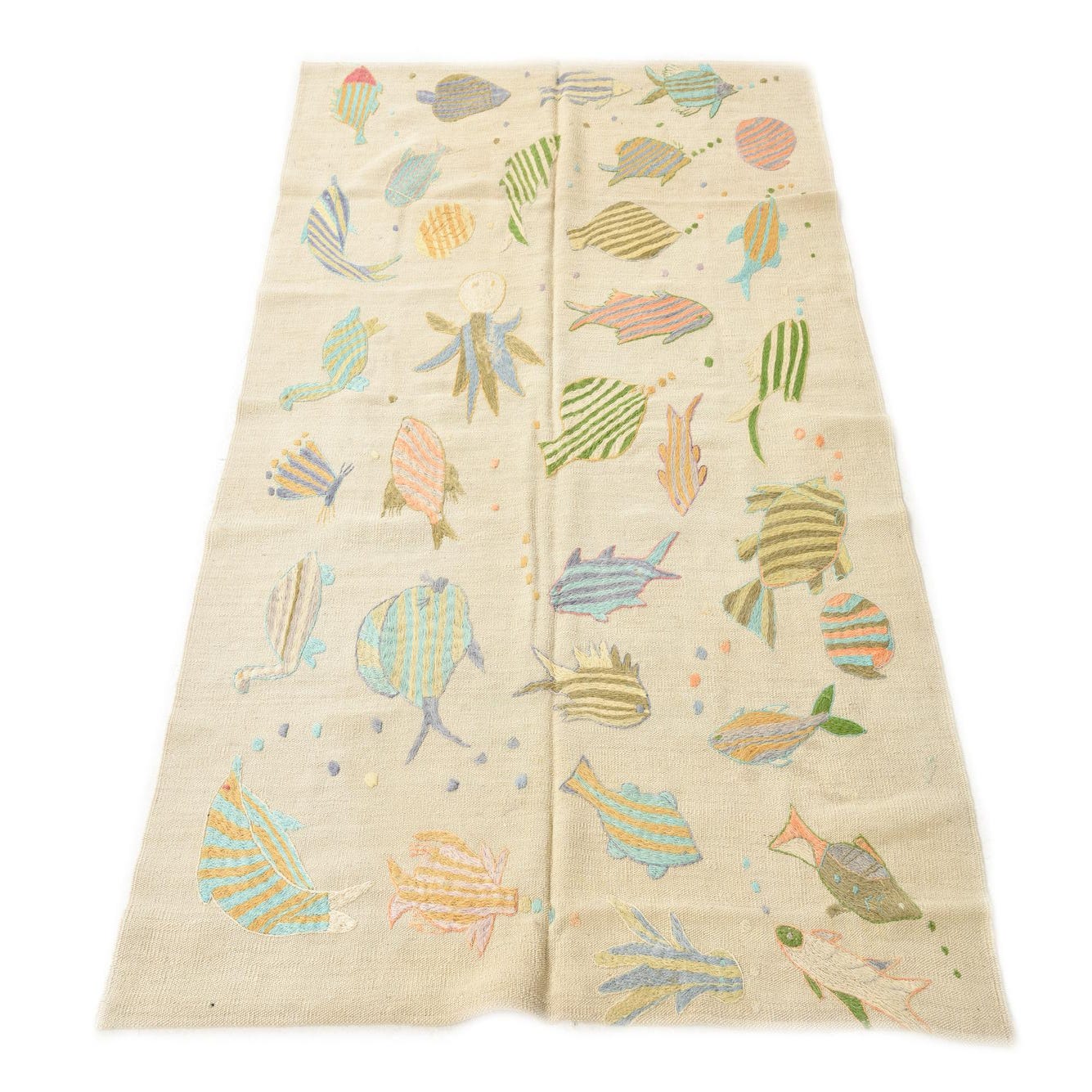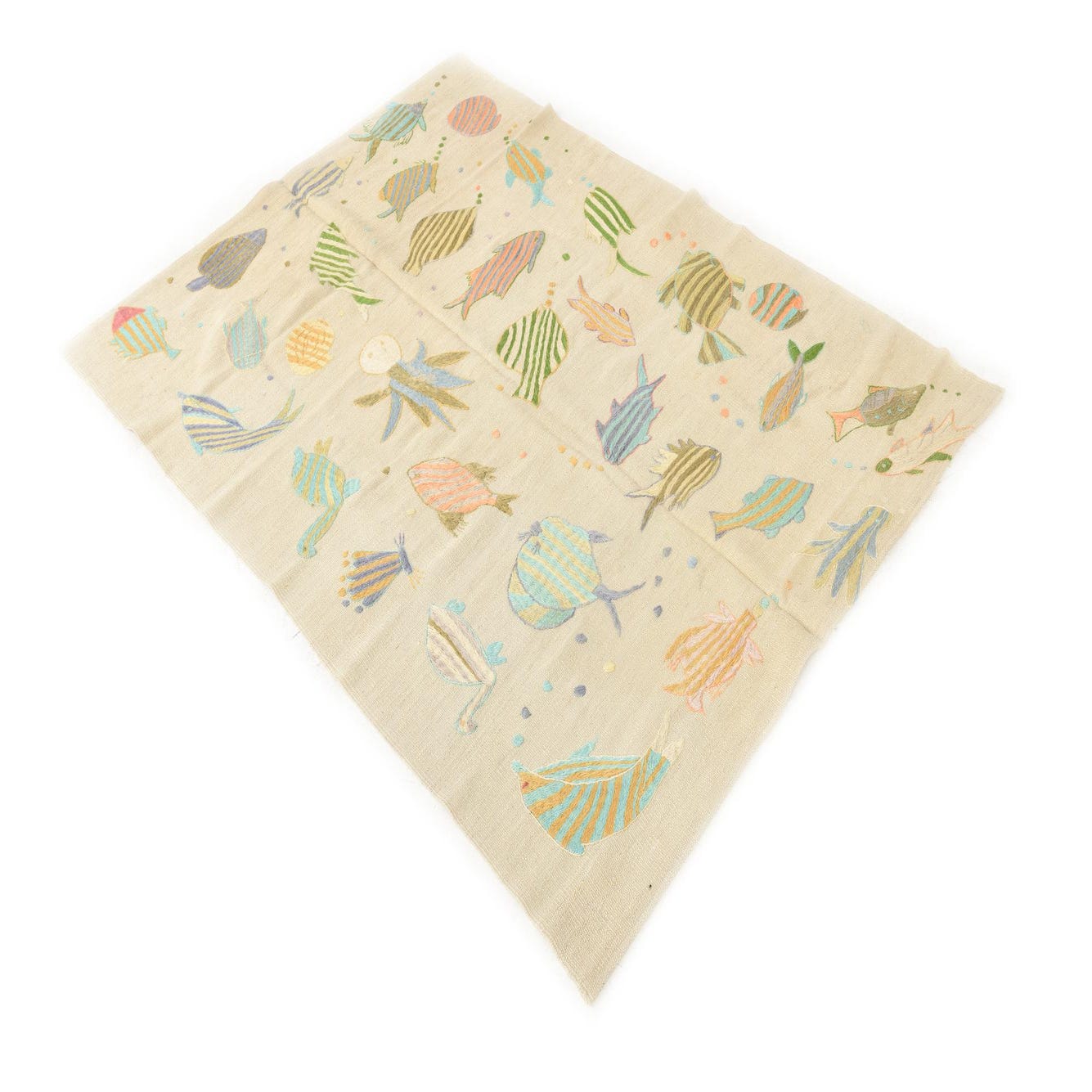 A 4x6 rectangular ivory flatweave rug features colorful striped fish and aquatic motifs in a tribal, modern style.