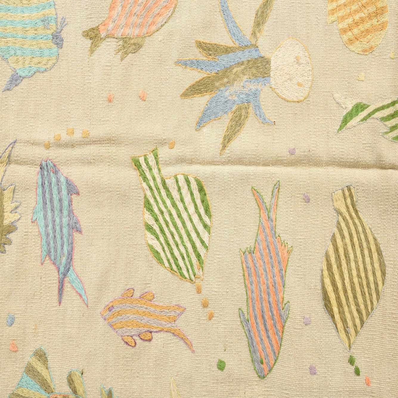 The Kilim Suzani rug, measuring 4x6 feet, is a hand-woven piece crafted from 100% wool, showcasing a sturdy yet comfortable texture suitable for various living spaces. Its design features whimsical motifs reminiscent of stylized botanical and marine elements, strewn gracefully across an ivory background. The color palette includes a harmonious mix of beige, blue, brown, light blue, light brown, light green, light salmon, and orange accents that add a playful yet sophisticated touch to the overall aesthetic.