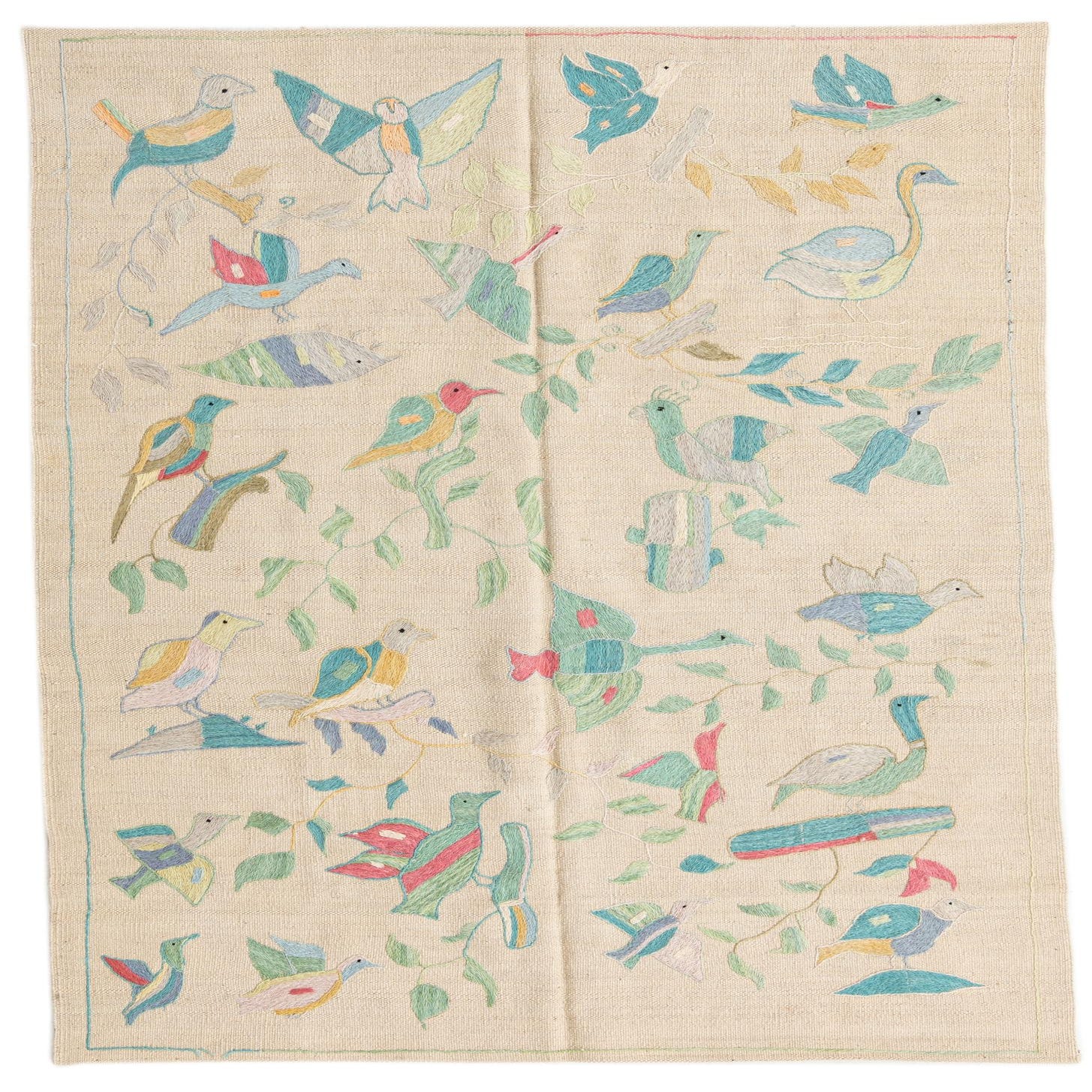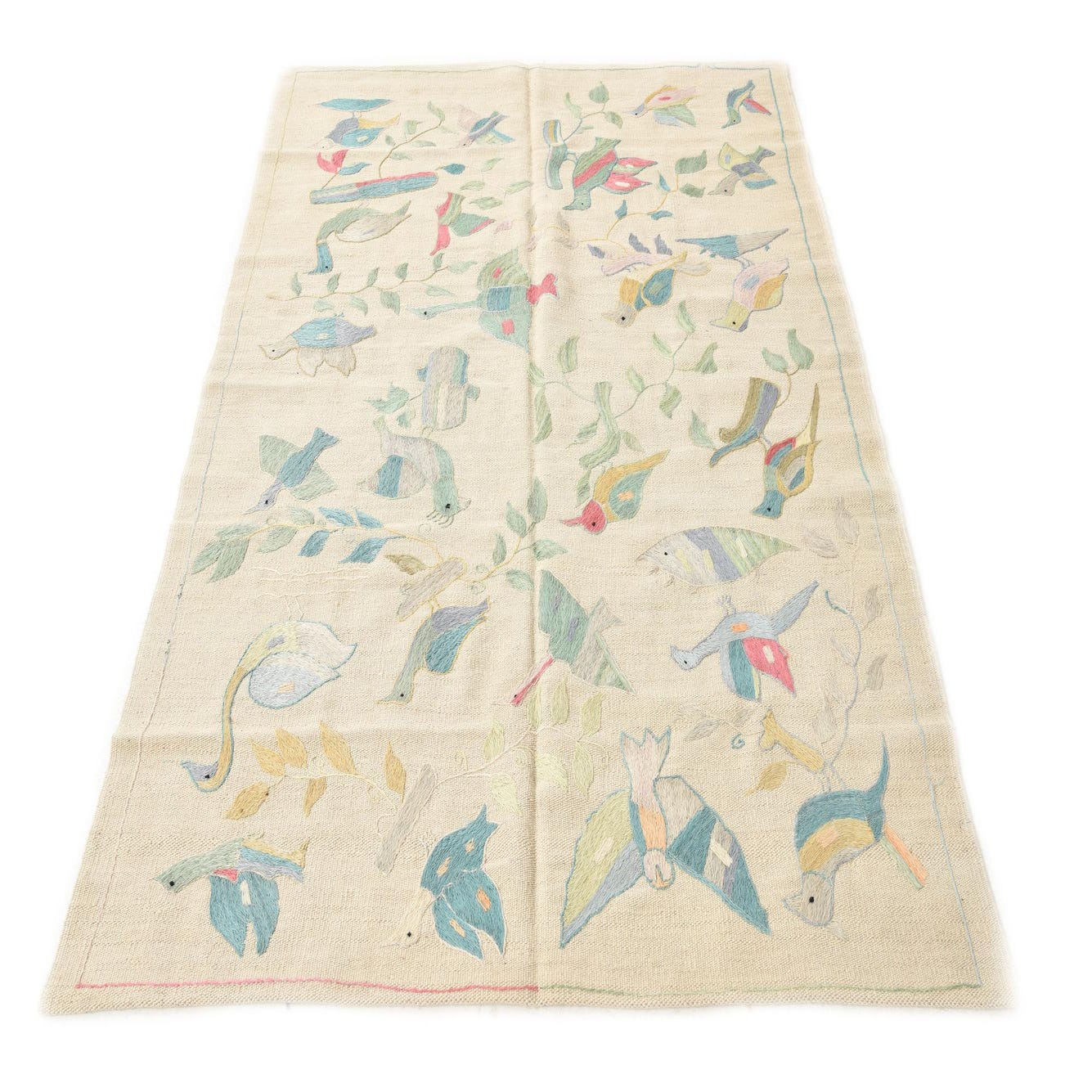 A 4x6 rectangular ivory flatweave rug with a colorful tribal bird and leaf pattern, ideal for a living room.