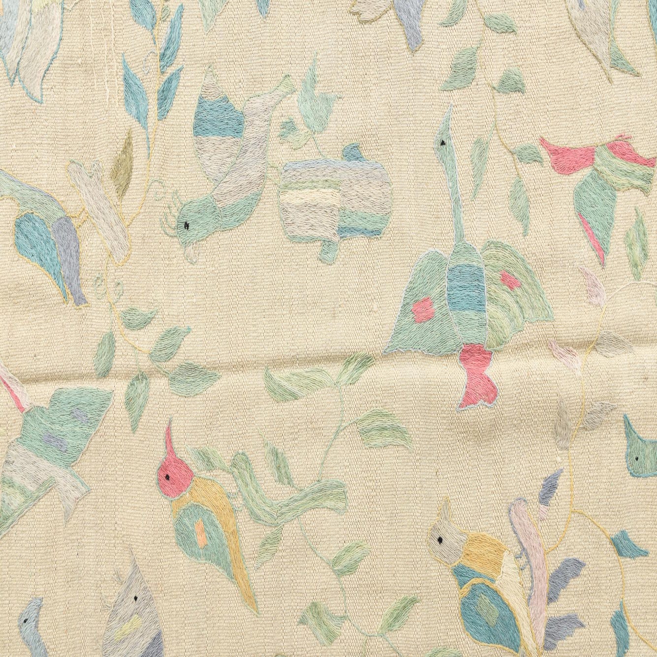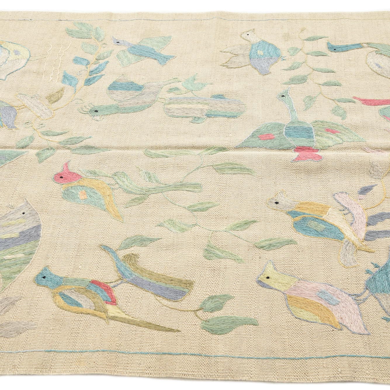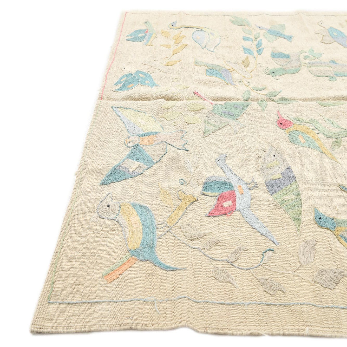 The Kilim Suzani collection presents a hand-woven 100% wool rug with a charming narrative captured in its design. This 4x6 piece features an ivory background that beautifully offsets a whimsical pattern of birds in mid-flight and perched among foliage. The array of colors includes beige, blue, brown, light blue, light brown, light green, light salmon, peach, purple, and pink, lending a vibrant yet harmonious palette to the tapestry of shapes and forms.