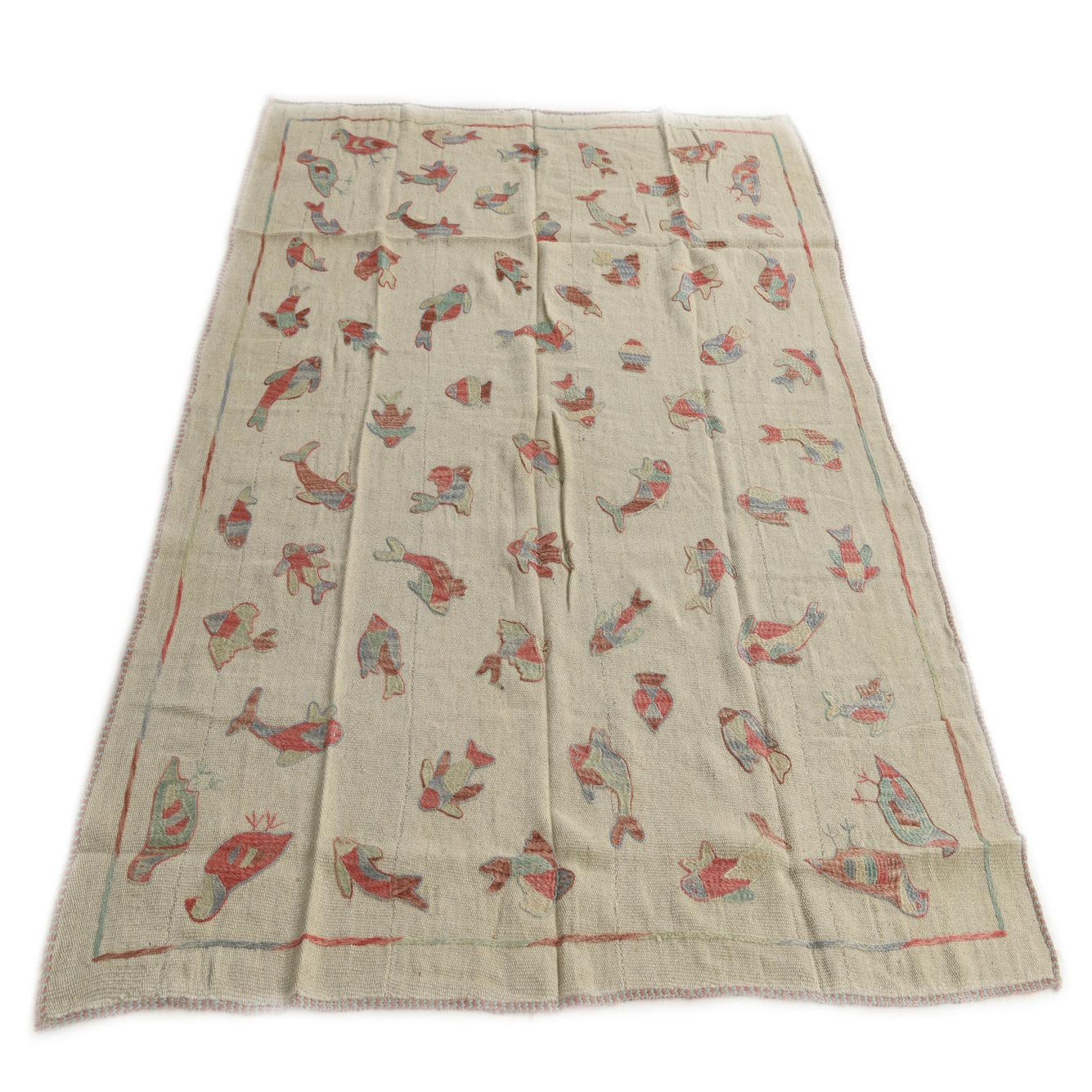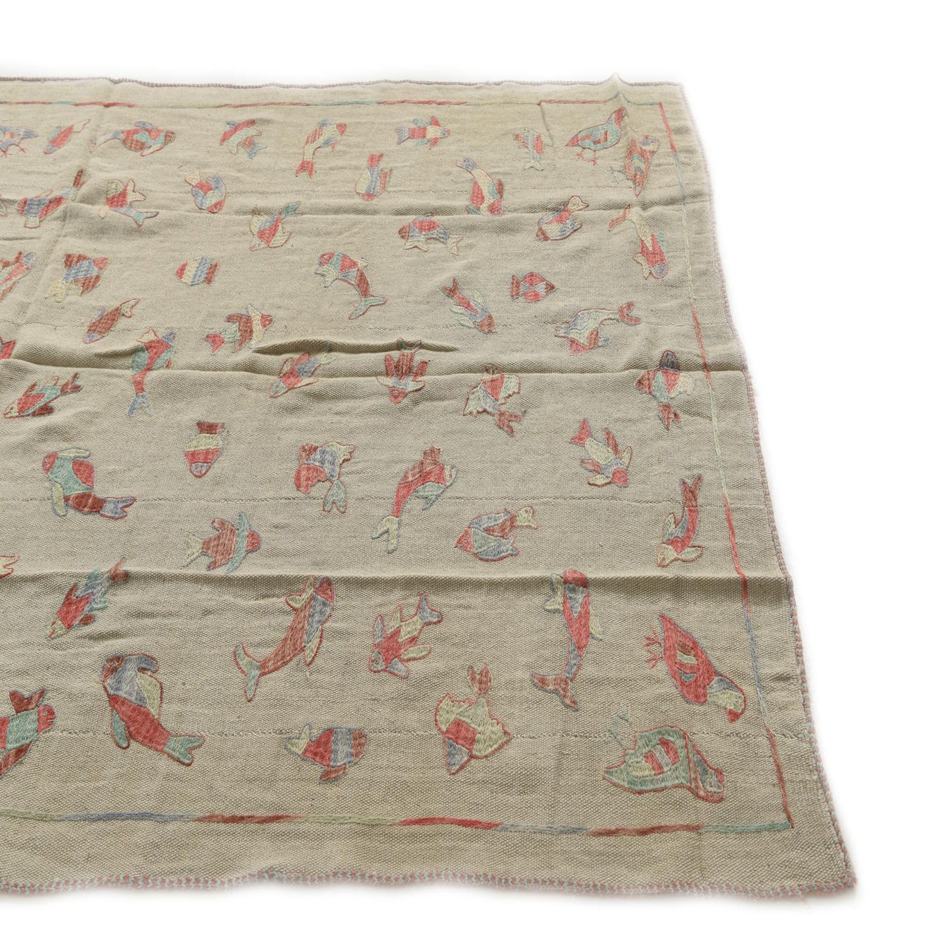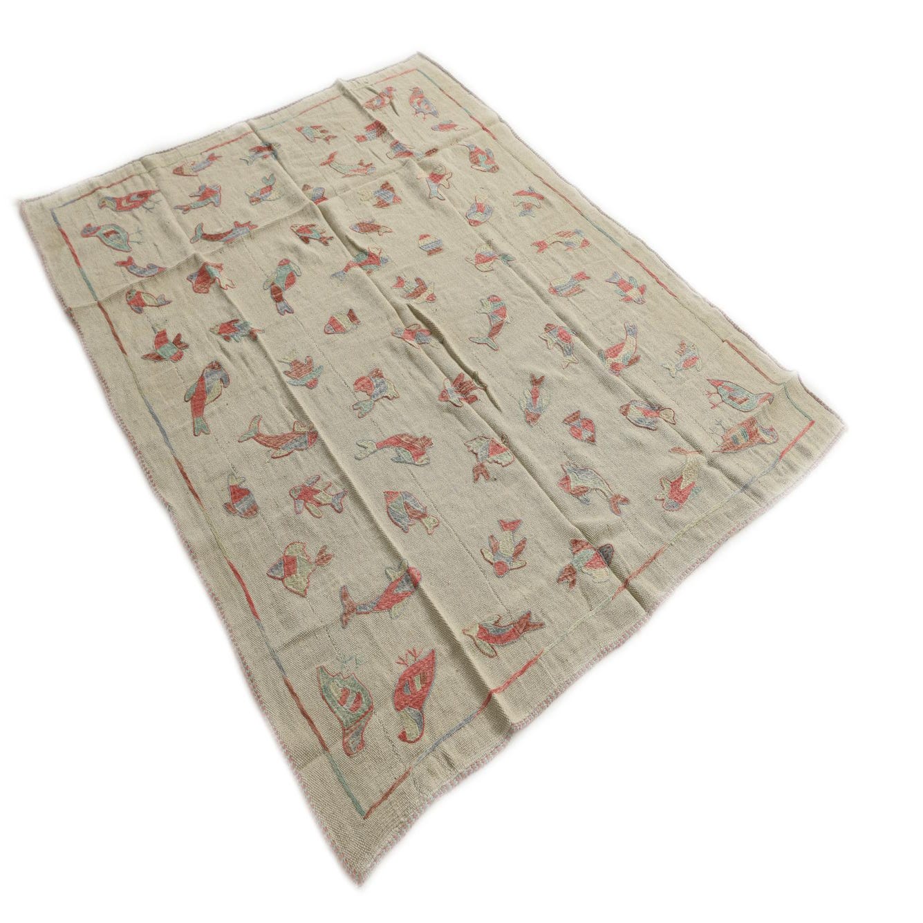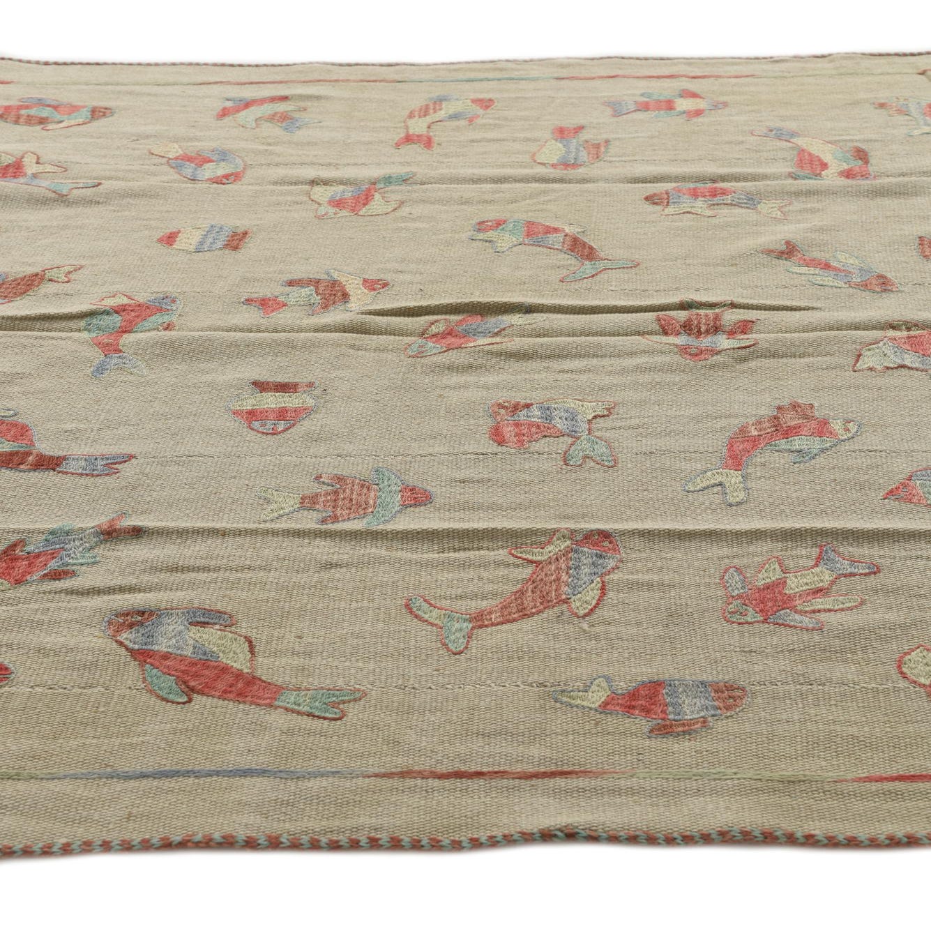 A 4x6 rectangular ivory flatweave rug with a tribal pattern of colorful fish and bird motifs in red, blue, and green.