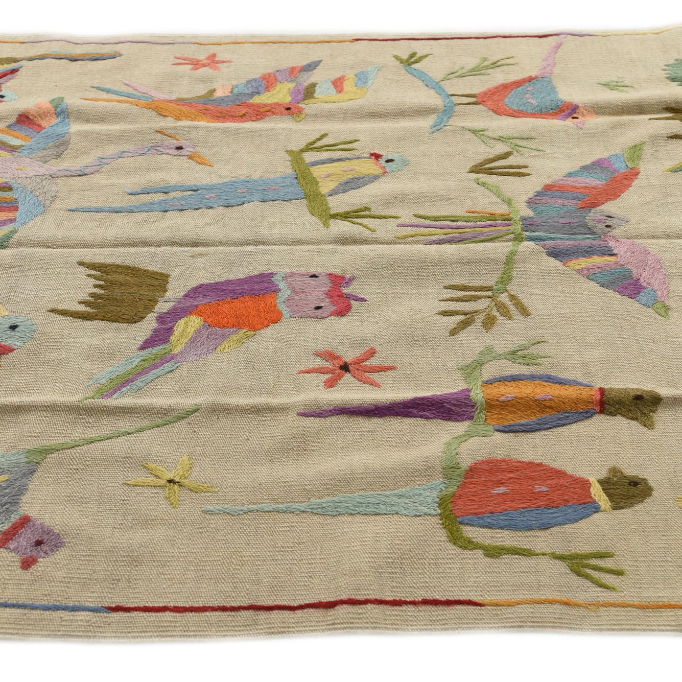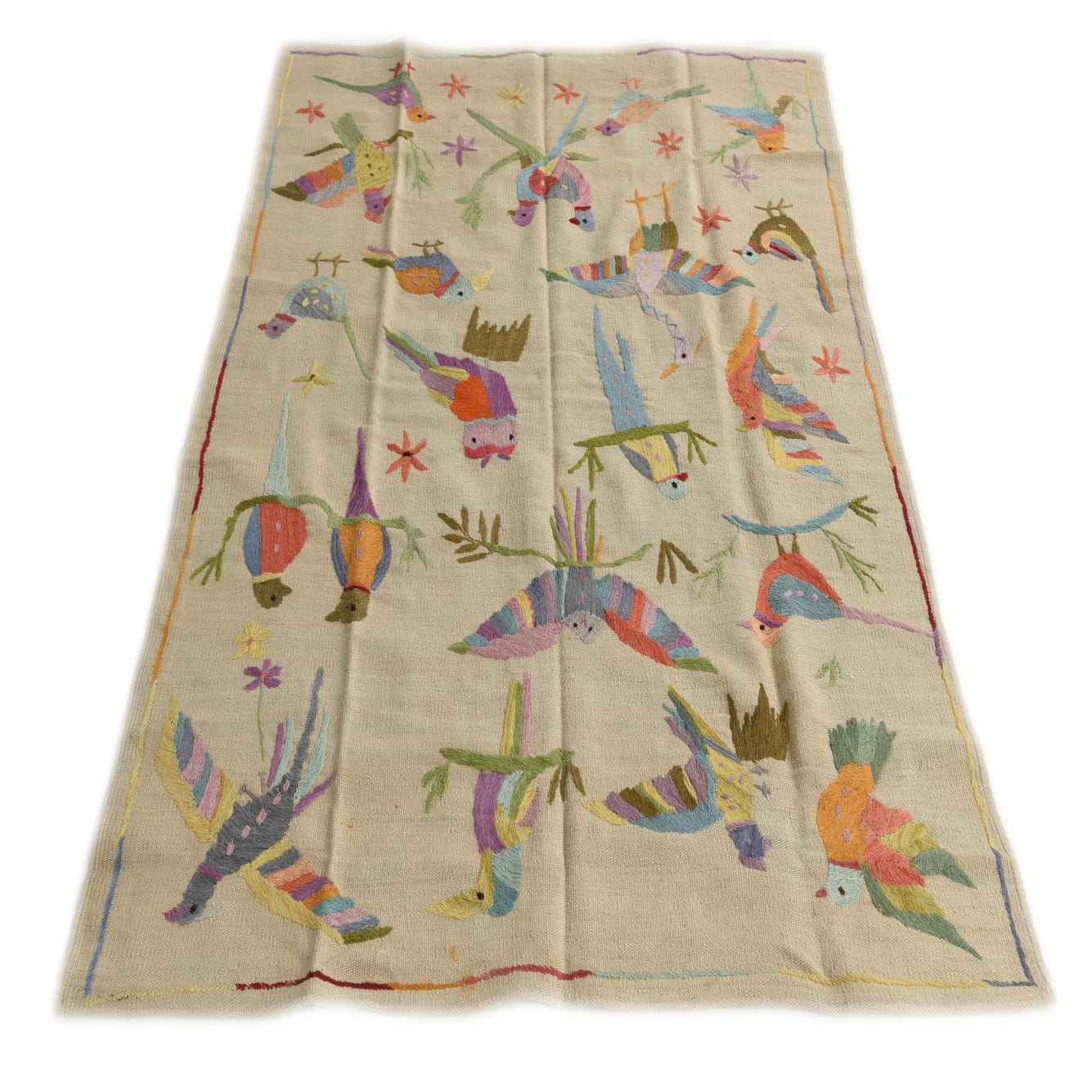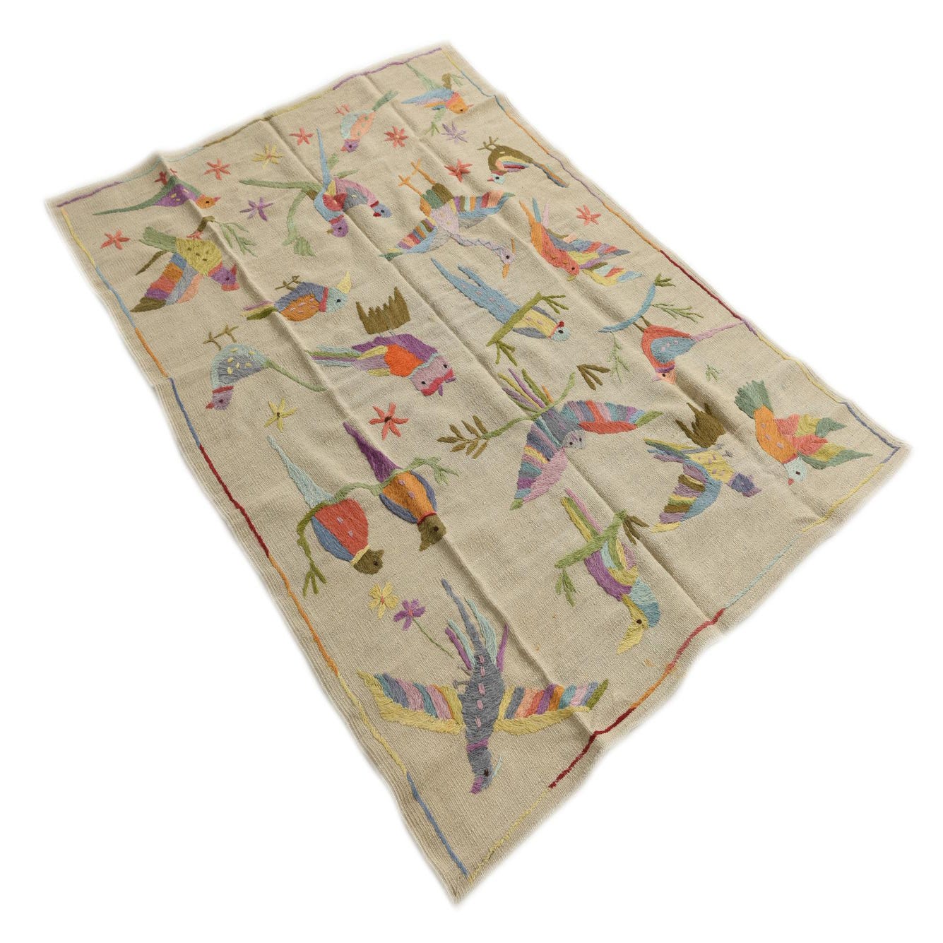 A 4x6 rectangular ivory flatweave rug featuring a vibrant, multicolored tribal bird pattern, perfect for a living room.
