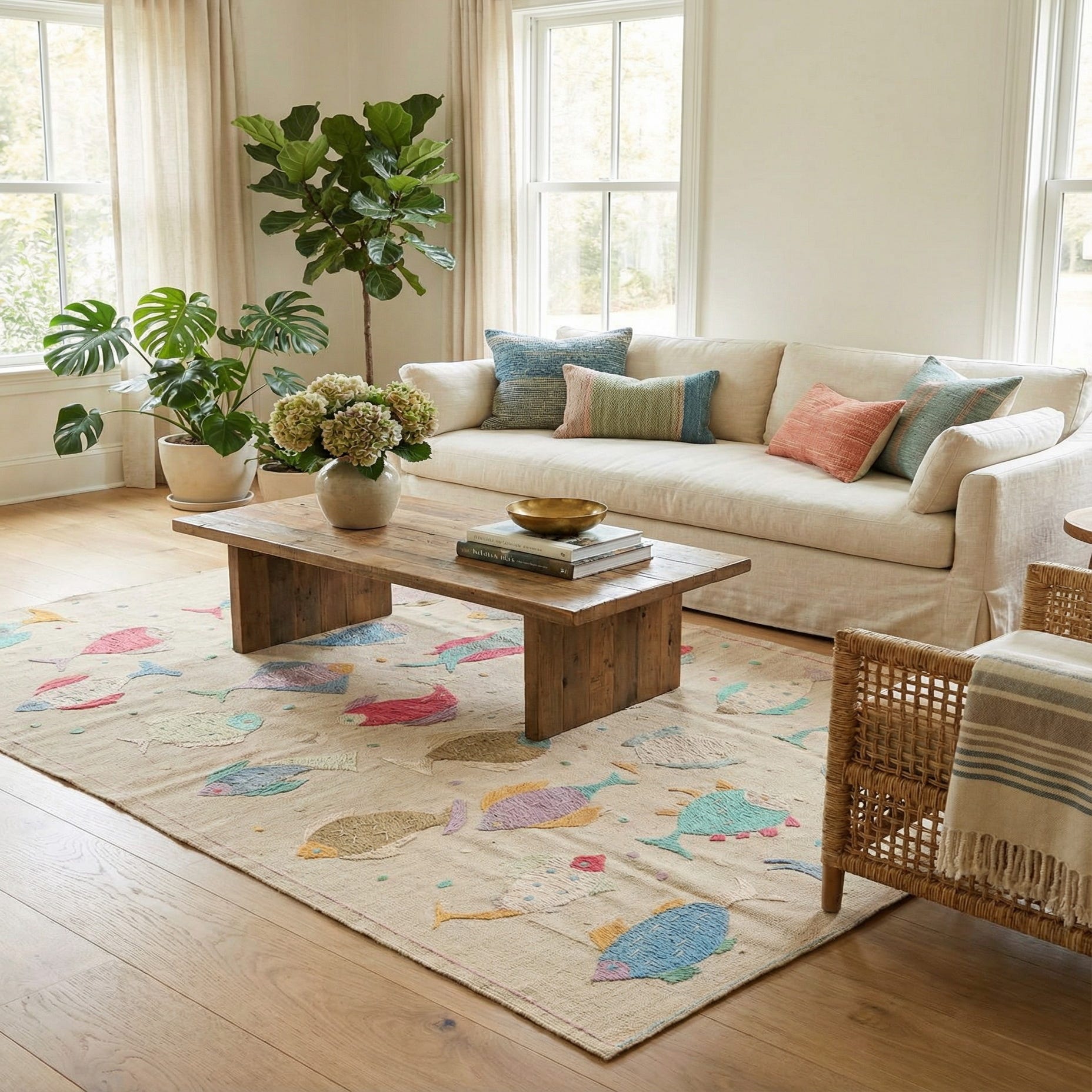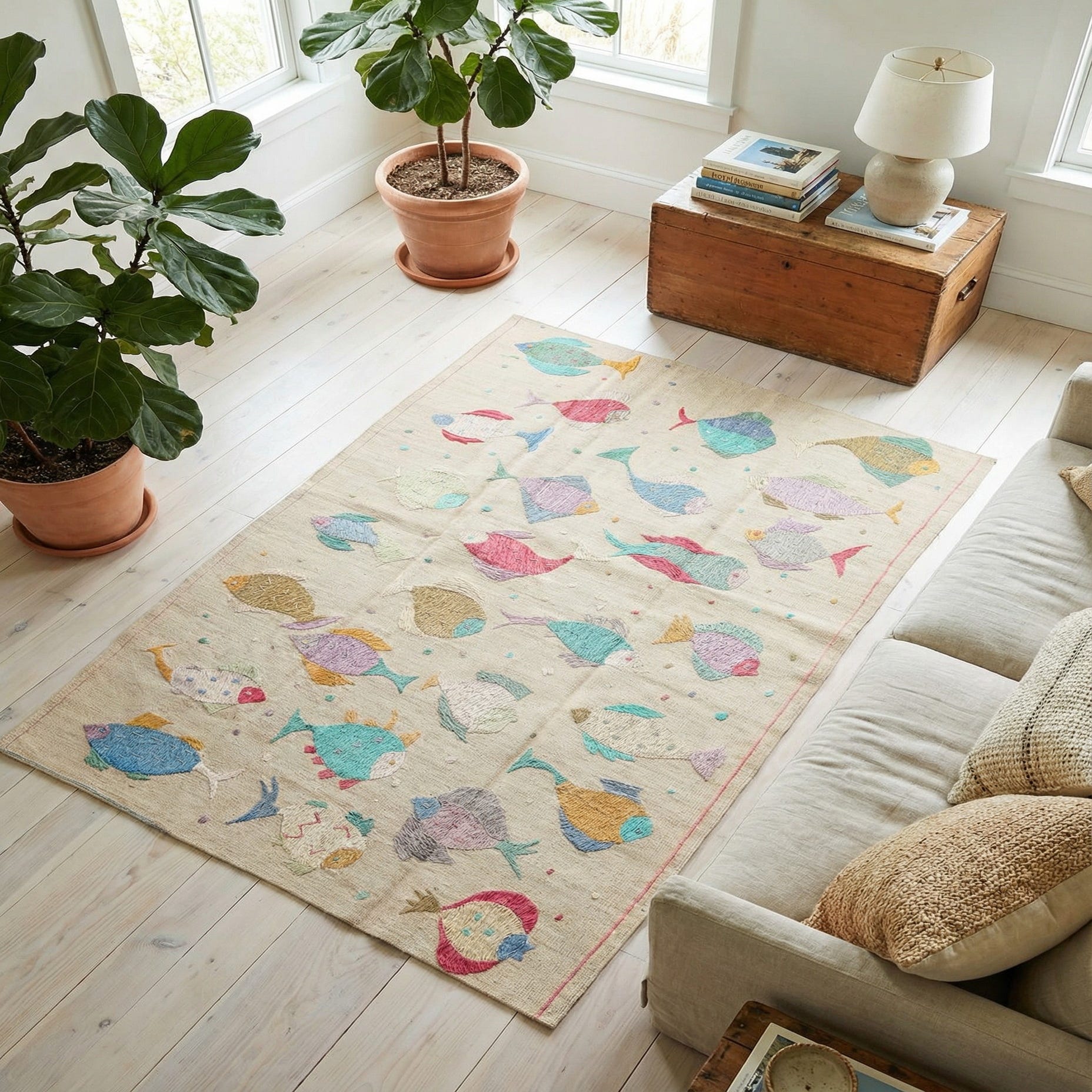 The natural fiber and handcrafted charm of this rug make it a versatile piece suitable for various decor settings. It can add a touch of artistic flair to a modern minimalist interior, serve as a focal point in a coastal-themed space, or complement a bohemian style with its eclectic pattern. A children's room or a casual living area might benefit from the light-hearted design, infusing the space with a relaxed and inviting atmosphere. Additionally, the understated colors allow it to seamlessly integrate with a range of color schemes while maintaining its unique visual interest.
