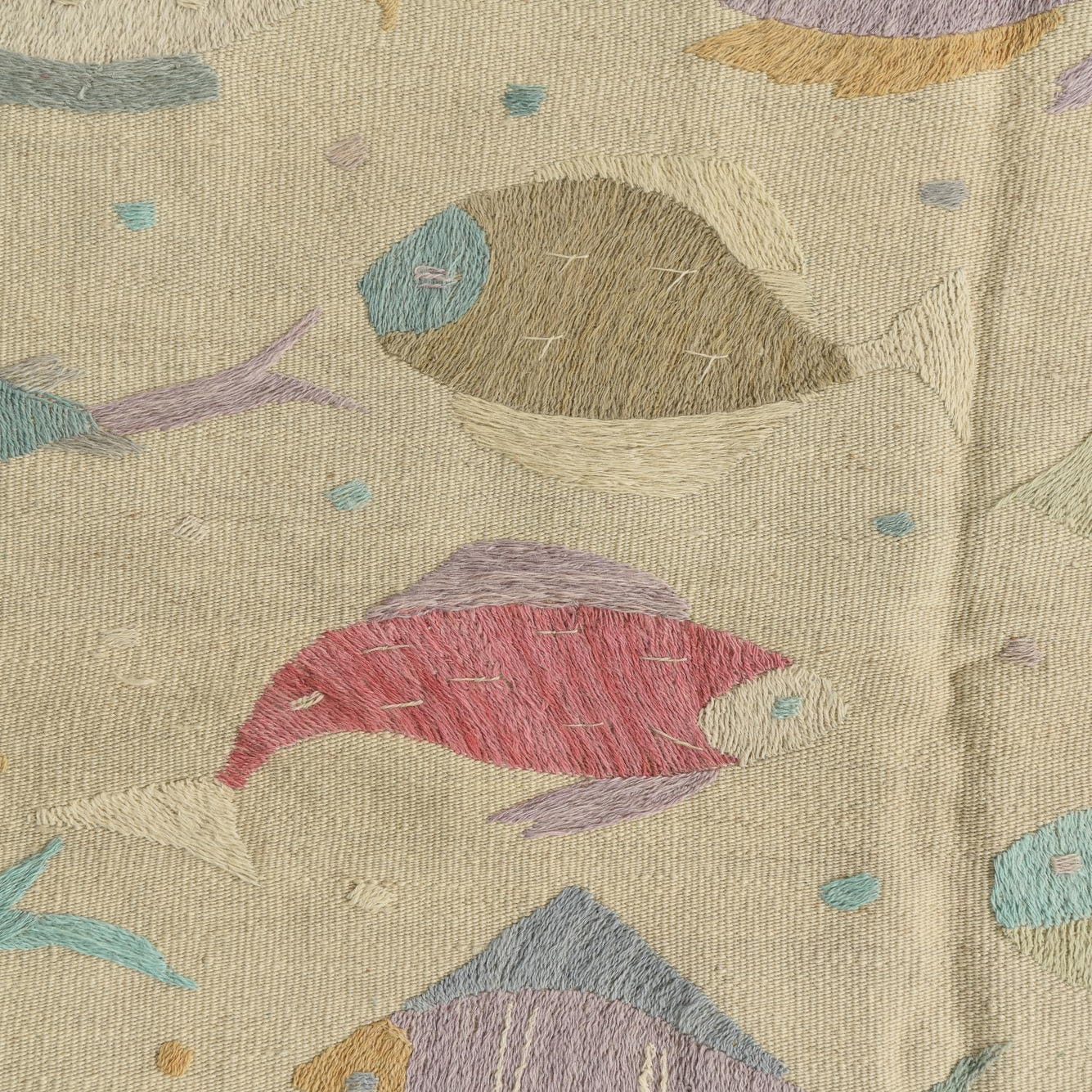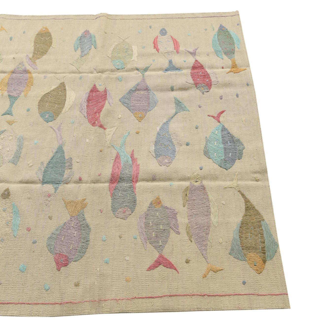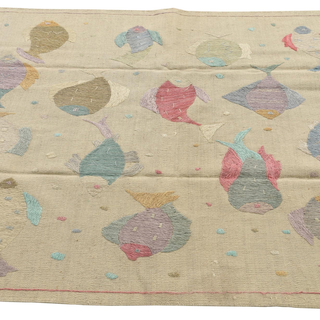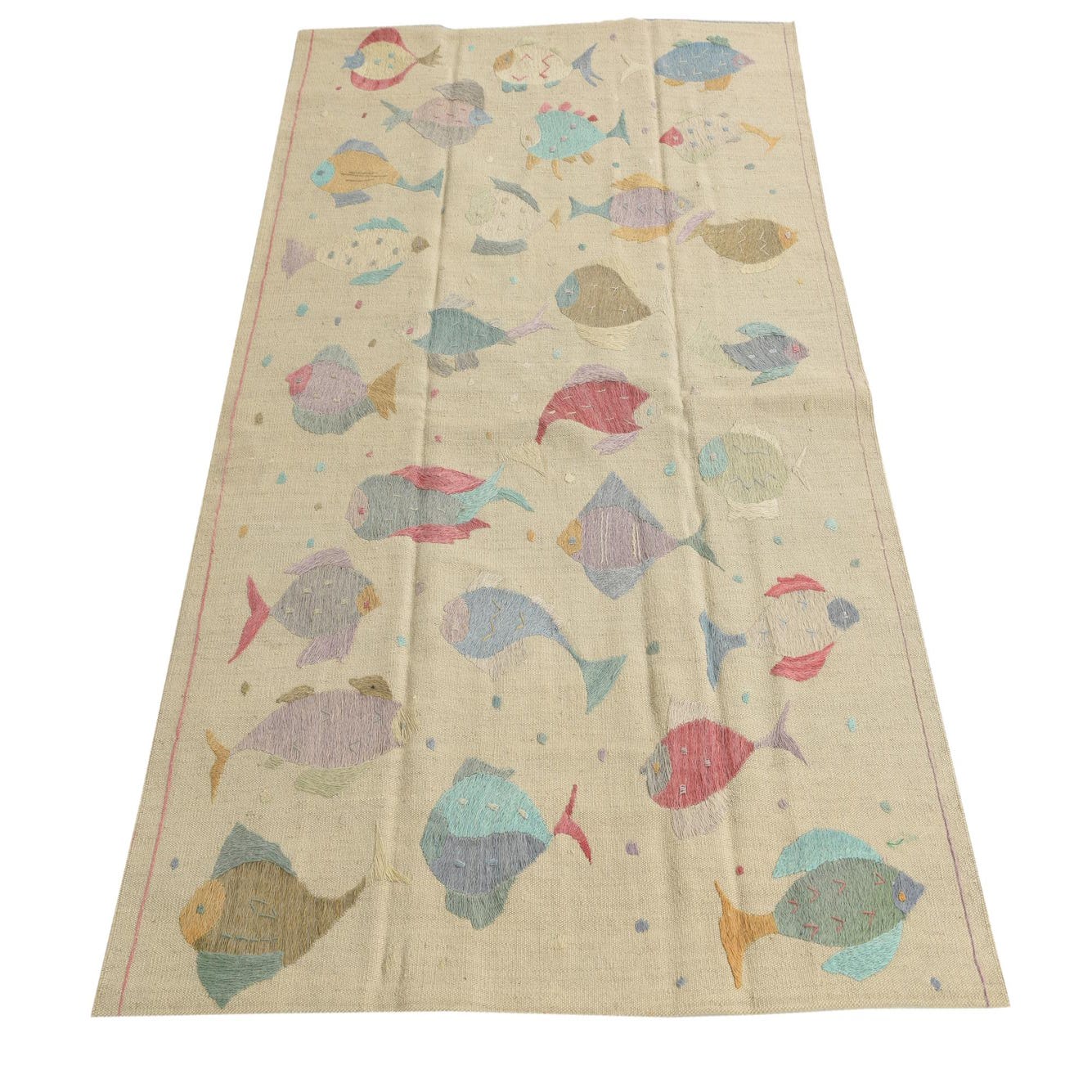 A 4x6 rectangular ivory flatweave rug with a colorful, whimsical fish pattern in various pastel shades.