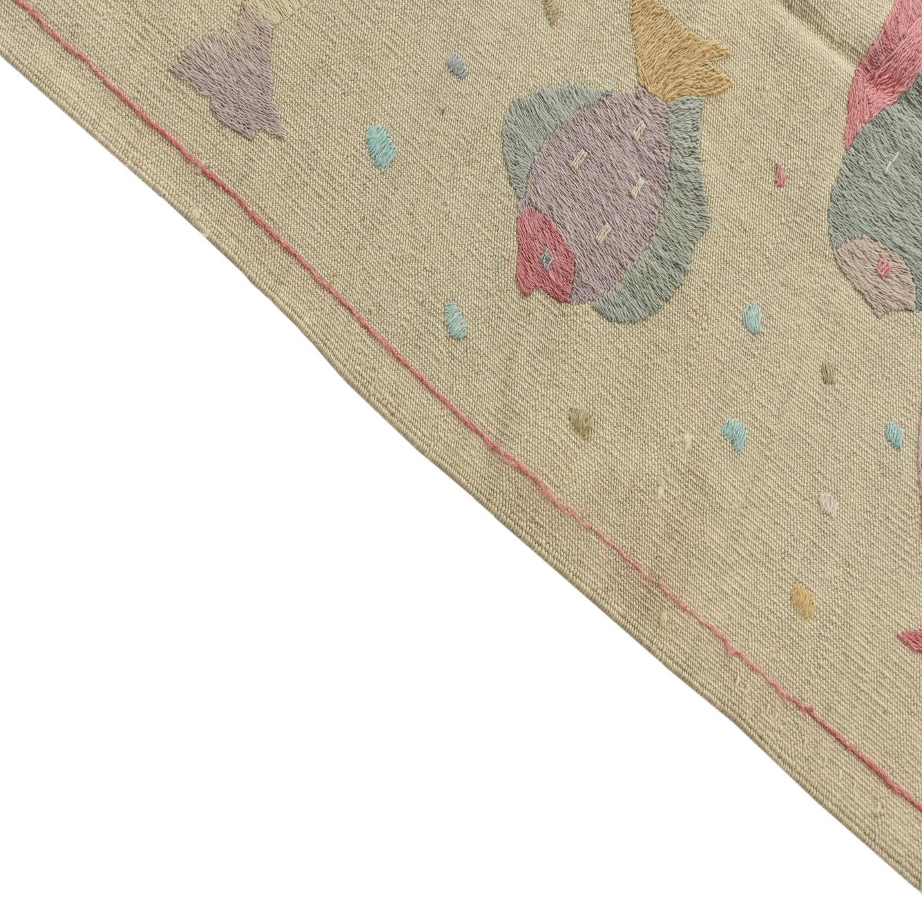 The Kilim Suzani collection rug boasts a playful and organic pattern featuring stylized fish designs in a diverse palette that includes ivory, gray, light blue, light green, and violet hues set against an ivory background. The motif exudes a subtle whimsy which is complimented by the earthy and muted tones. Handwoven from 100% wool, this 4x6 rug presents a flatweave construction that ensures durability coupled with a textured feel underfoot.
